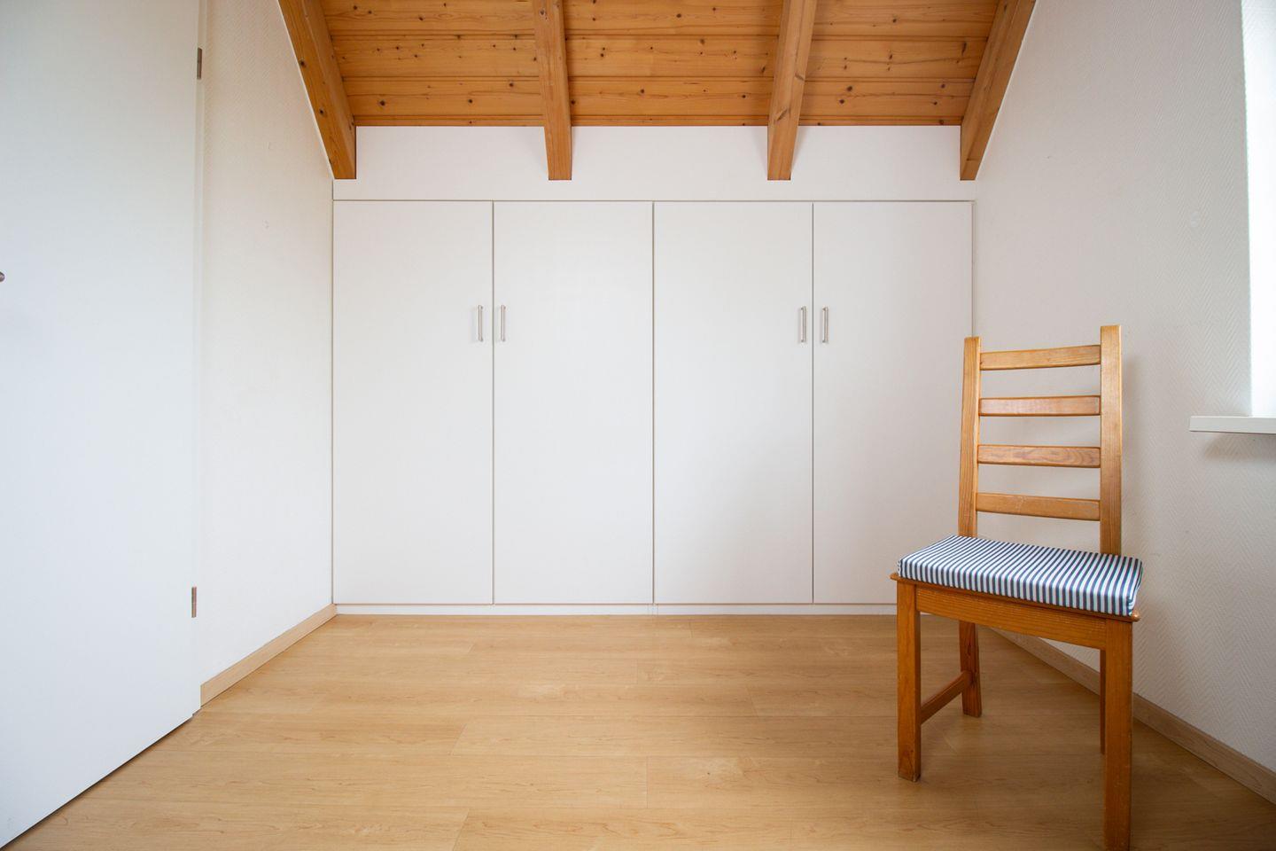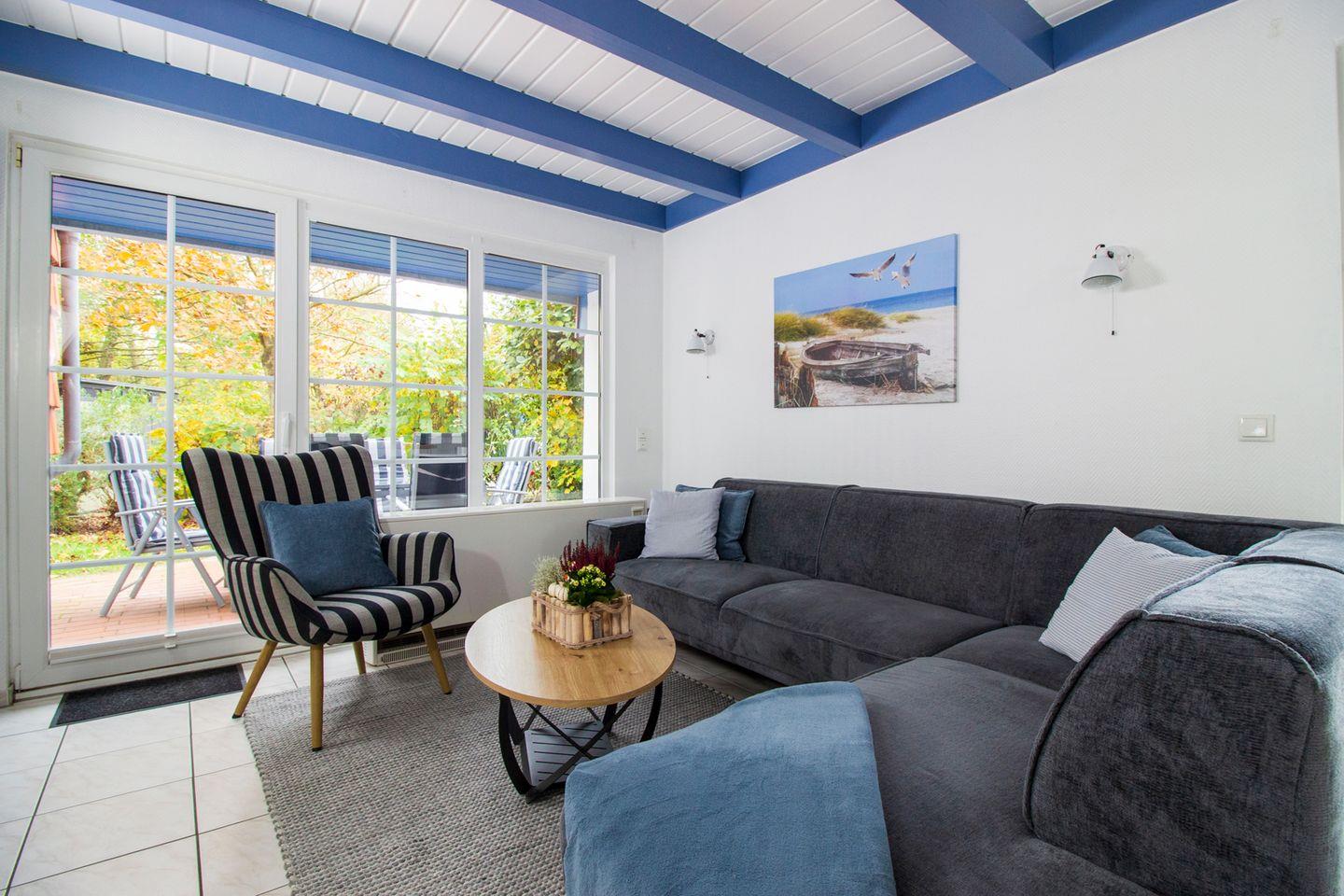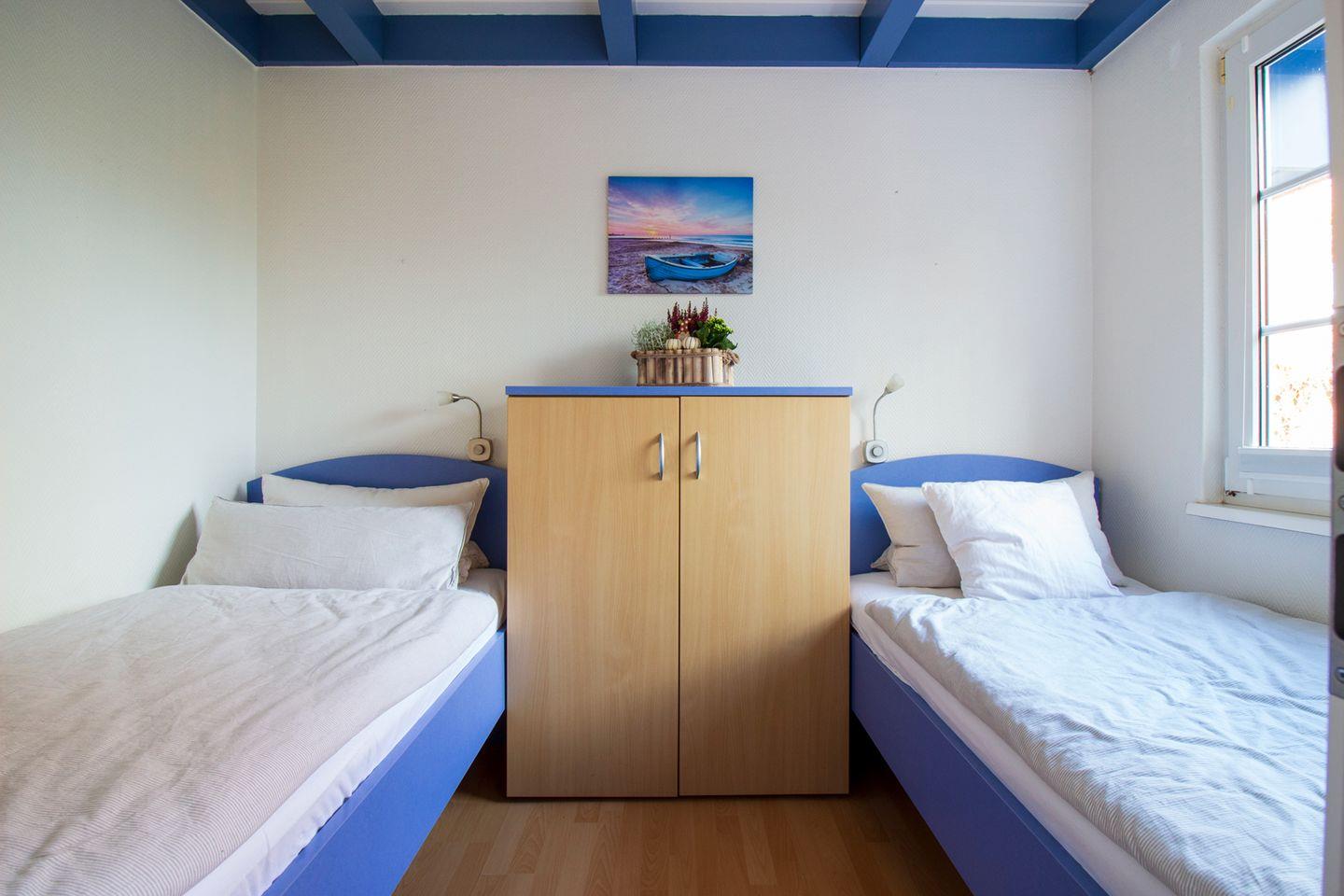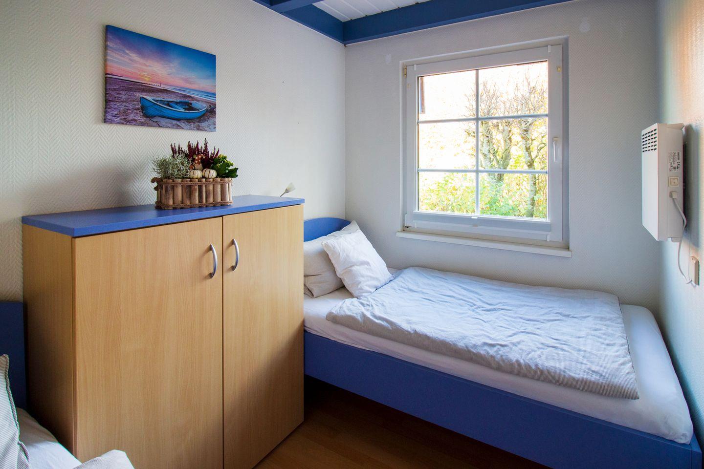 Im Erdgeschoss befinden sich ein Schlafzimmer mit erhöhten Betten, ein gemütlicher Wohnbereich mit Kaminofen sowie eine offene Küche mit großem Esstisch. Bücher, Spiele und helle Räume sorgen für entspannte Stunden, auch wenn das Wetter mal rauer wird. Das Obergeschoss mit Laminatboden bietet ein Elternschlafzimmer und ein weiteres mit getrennten Betten.