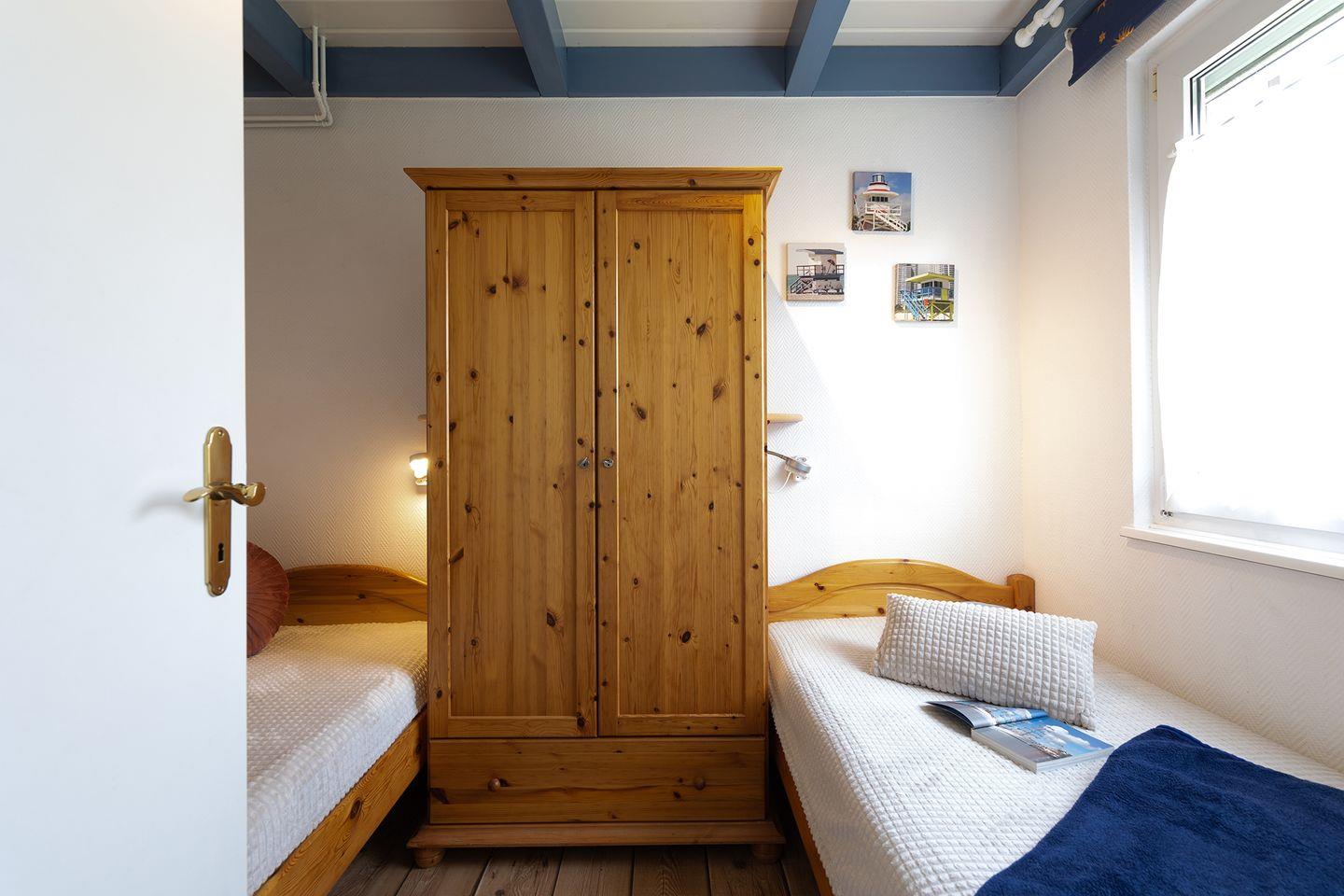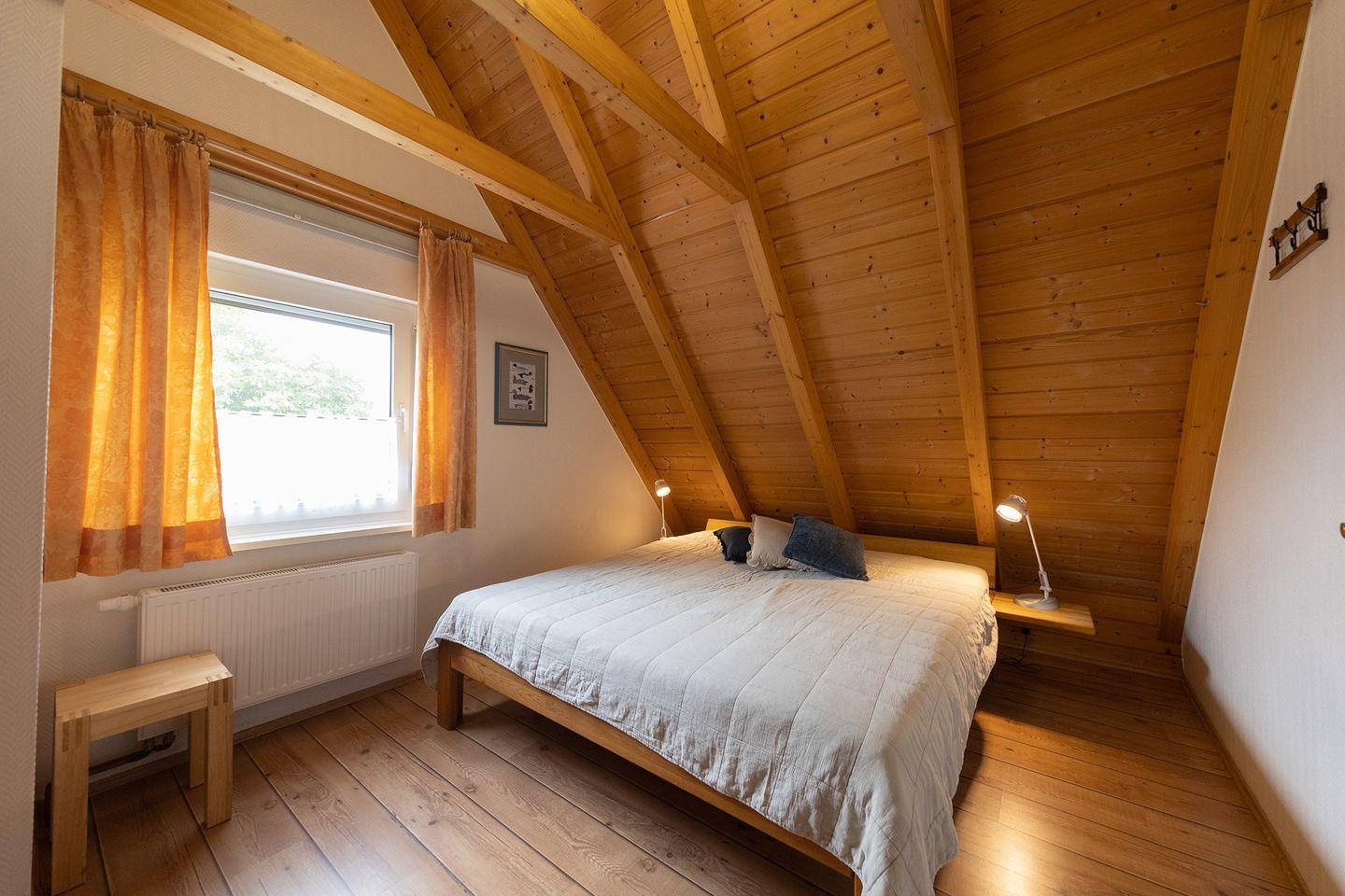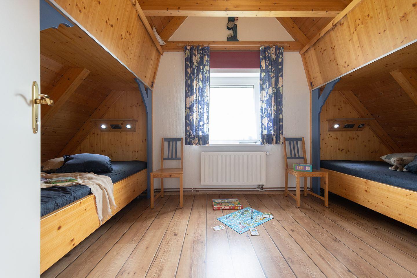 Unten: ein Schlafzimmer mit zwei Einzelbetten, Wohn-Essbereich mit offener Küche, Duschbad mit Waschmaschine. Oben: Elternschlafzimmer mit Doppelbett, Kinderzimmer mit zwei gemütlichen Schlafkojen und ein zweites Duschbad. Kinderbett und Hochstuhl stehen bereit. WLAN ist vorhanden.