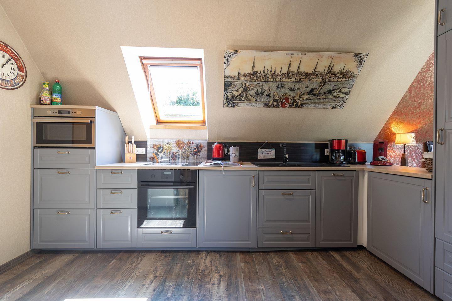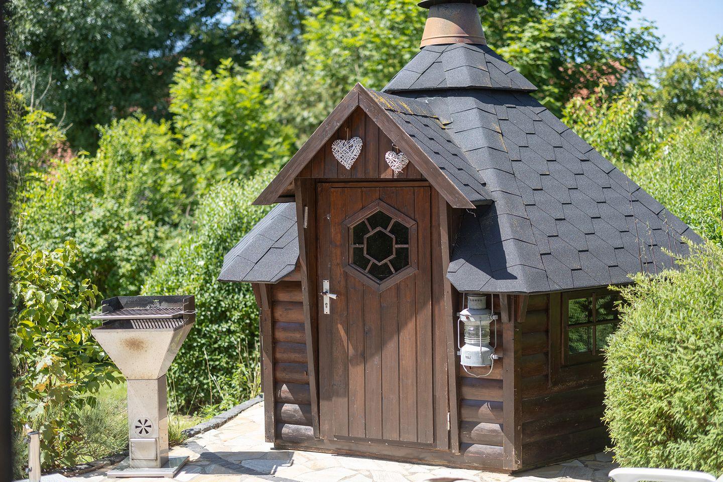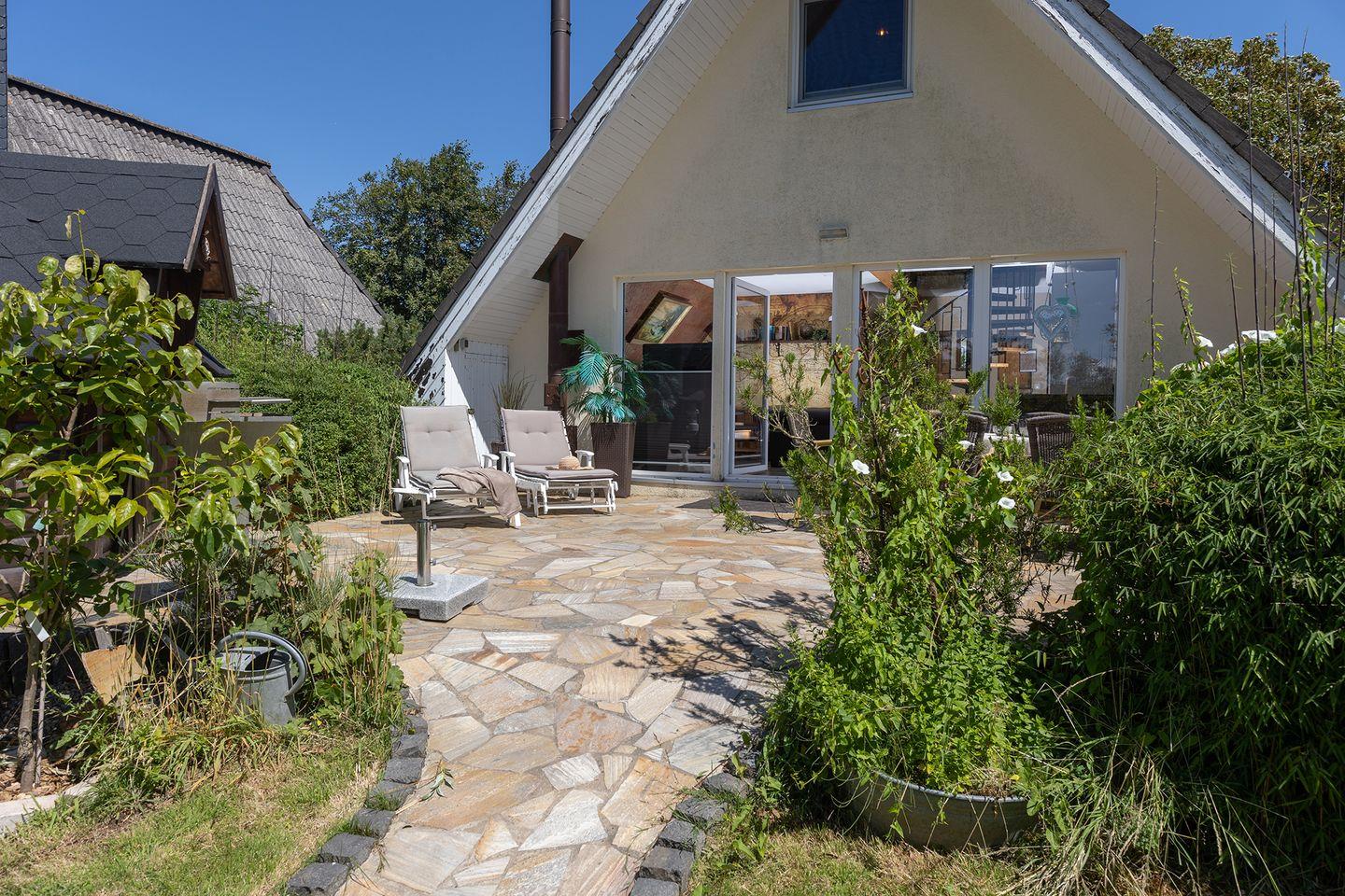 Die offene Küche mit Waschtrockner, der gemütliche Wohnbereich mit Kaminofen und Chesterfield-Sofa sowie die möblierte Terrasse mit Grillkate sorgen für entspannte Tage. Der Garten ist hundefreundlich ausgestattet – inklusive Hütte, Erdspieß und mobilem Zaun.