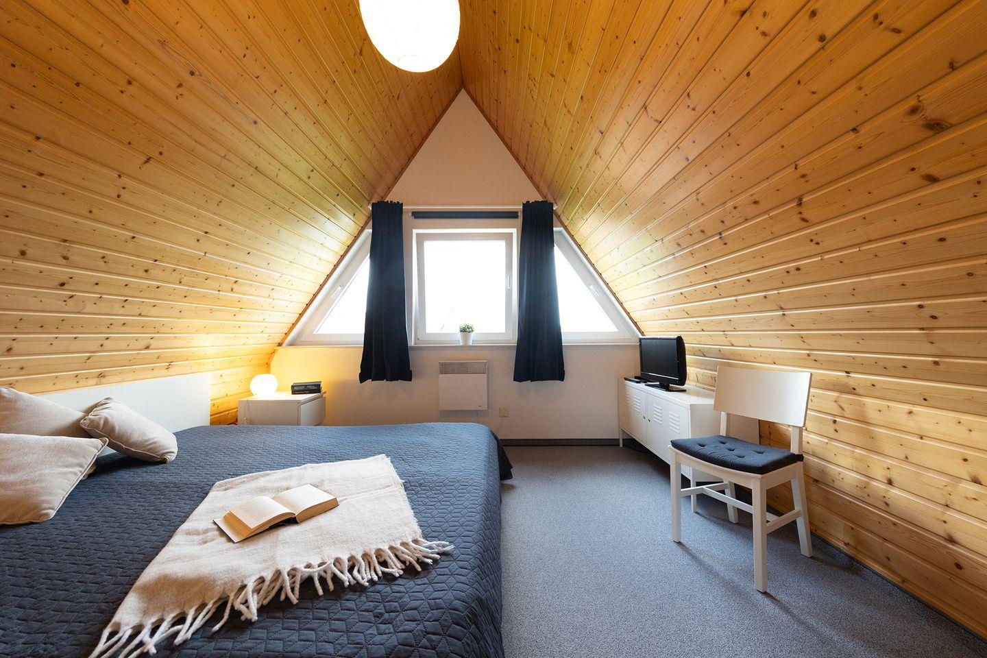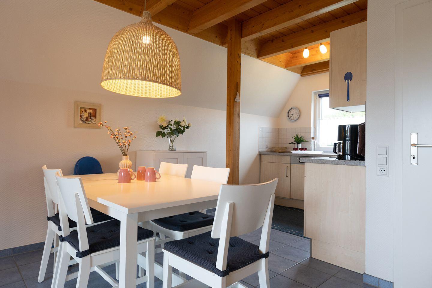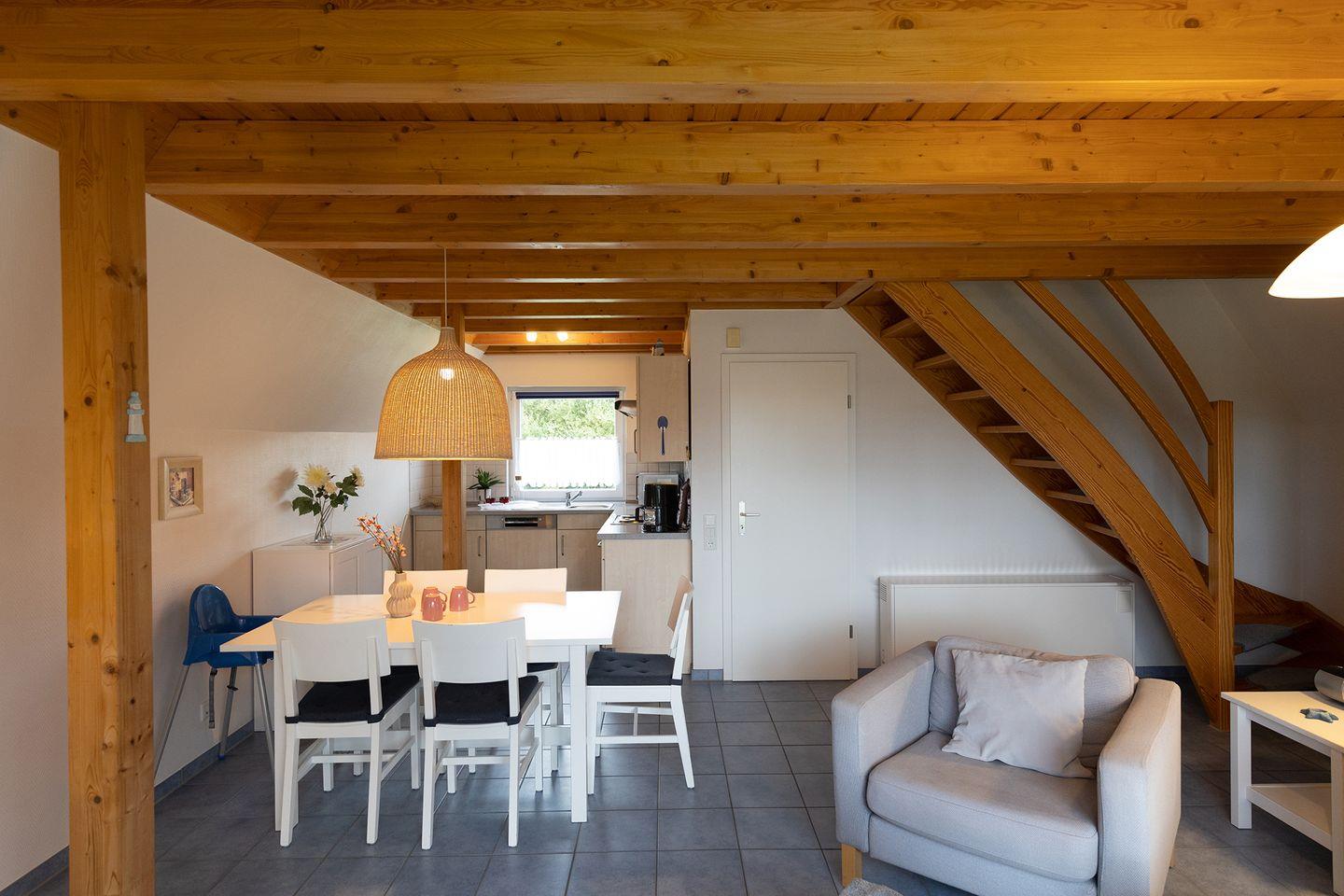 Unten wartet ein heller Wohnbereich mit offener Küche, Essplatz und Kaminofen. Wer mag, macht es sich hier nach einem Tag am Strand mit Tee und Buch gemütlich. Oben schlafen die Kinder in getrennten Betten, die Eltern im Doppelbett unter der Schräge. Alles ist iebevoll eingerichtet.