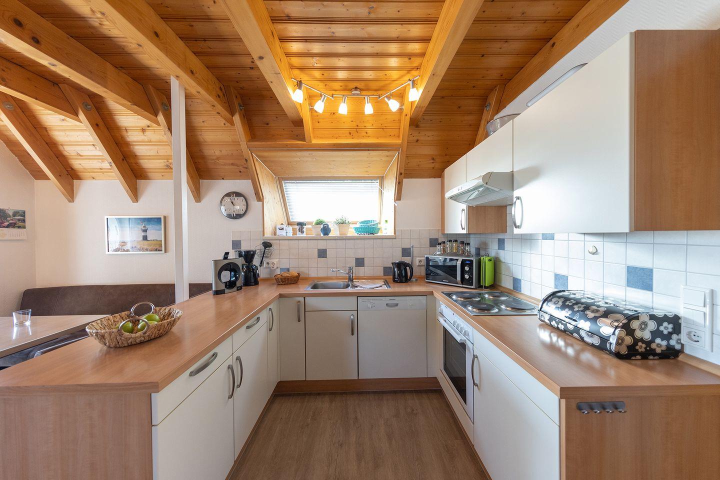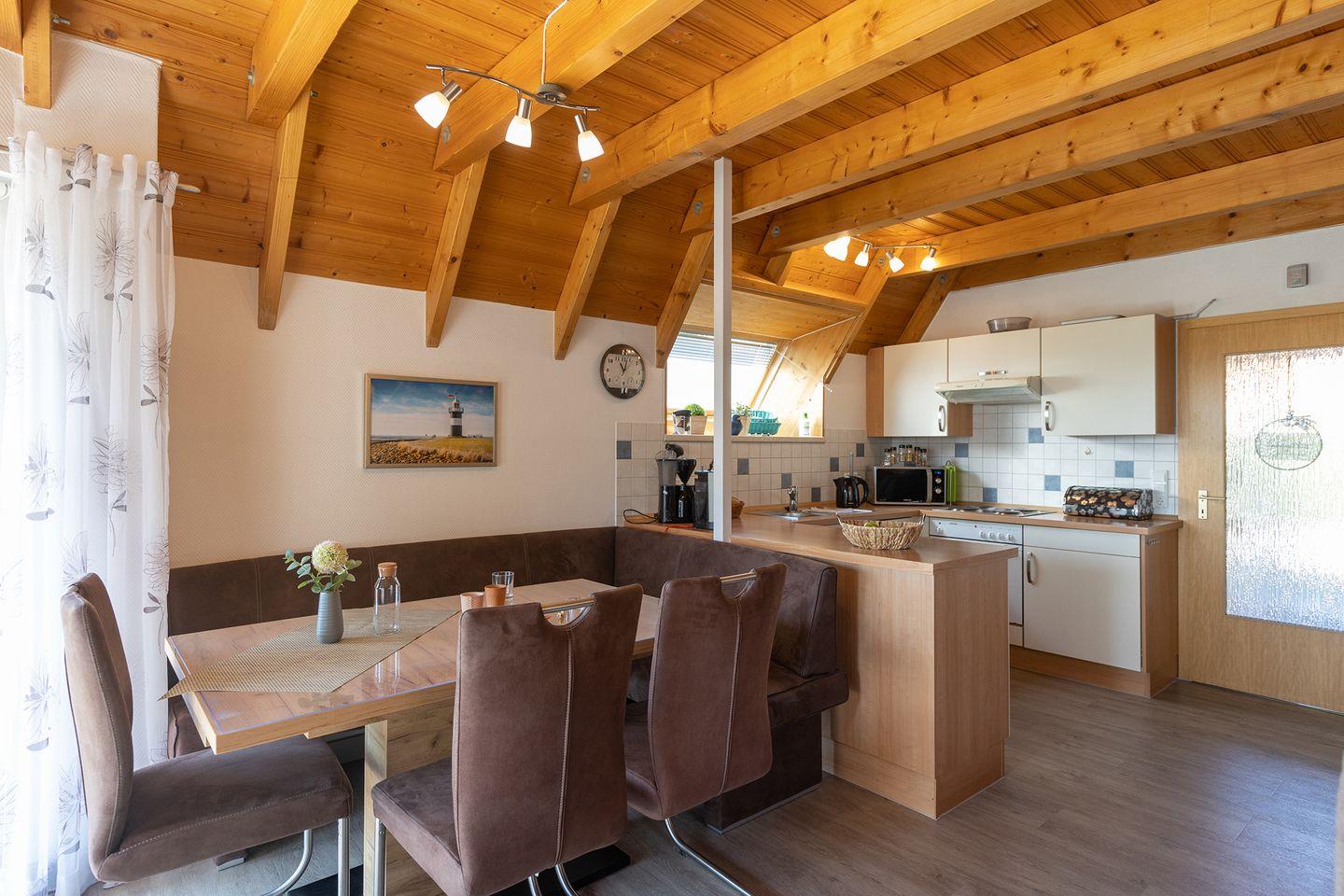 Vor dem Wohnzimmer lädt die Terrasse zum sitzrn ein, mit Platz für alle. Dazu steht auch ein Strandkorb für die stille Stunde bereit. Ein kostenfreier Parkplatz gehört dazu. Bis zum Strand sind es nur ein paar Minuten zu Fuß. Und wer mag, spaziert weiter zum Leuchtturm, beobachtet Krabbenkutter oder erkundet das Wattenmeer.