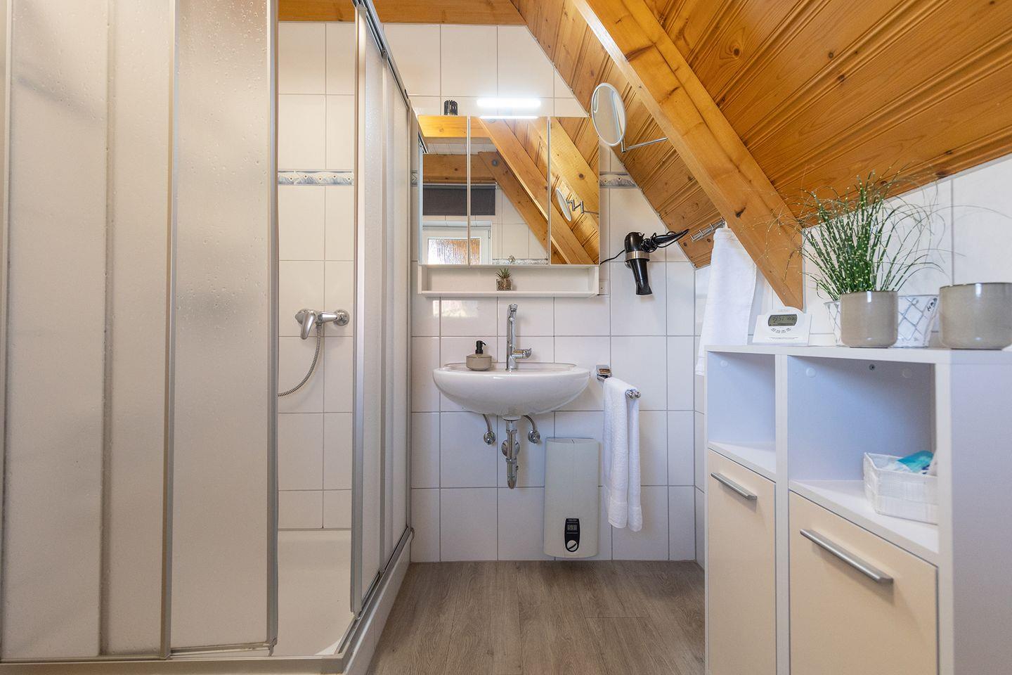 Oben sind zwei weitere Schlafzimmer und ein zusätzliches WC. In den Schlafräumen hast du Laminatböden und Fliesen im Wohnbereich. Dank Waschmaschine und Trockner geht der Alltag schnell von der Hand.