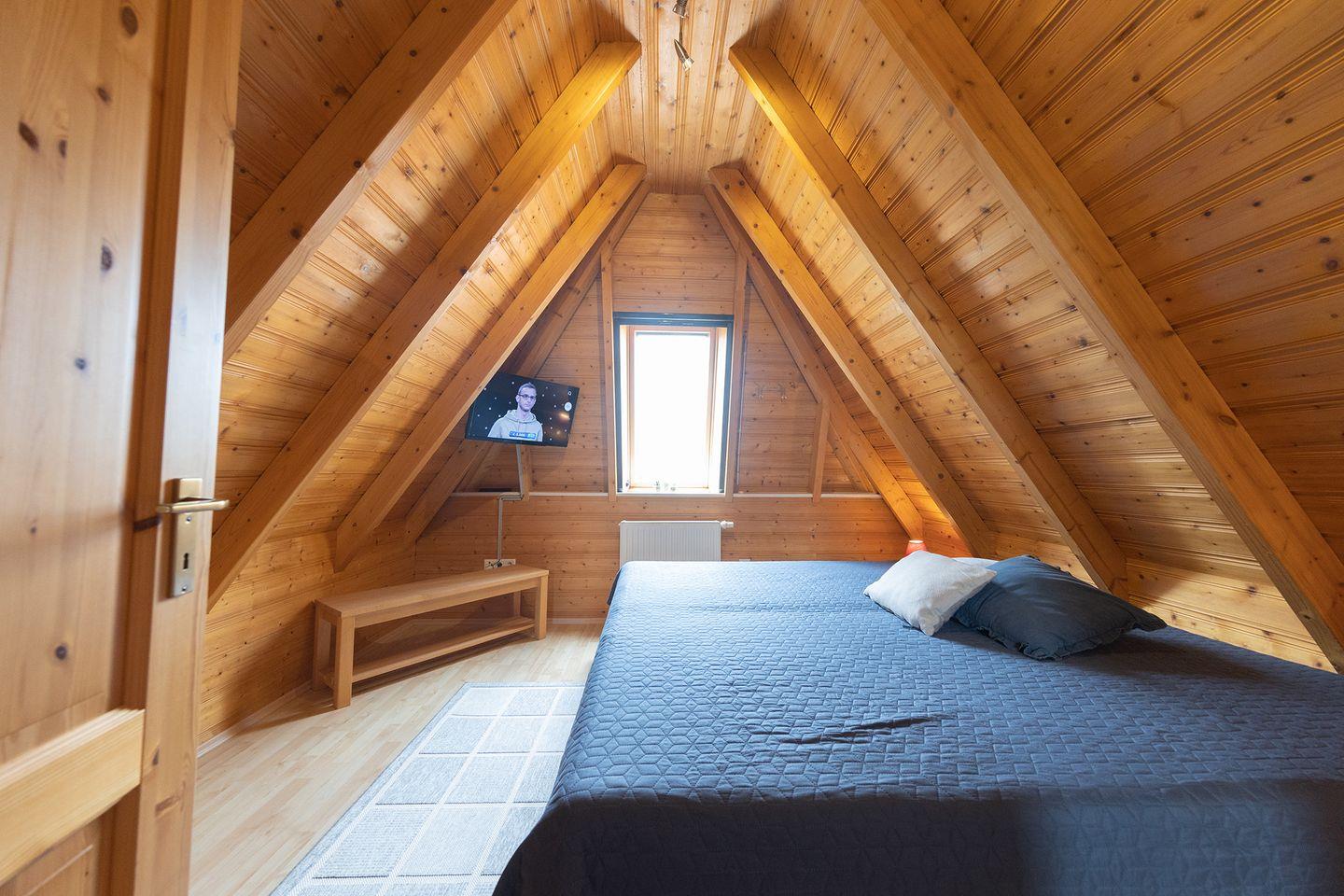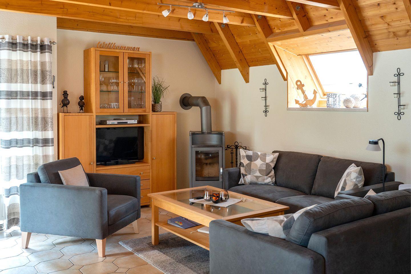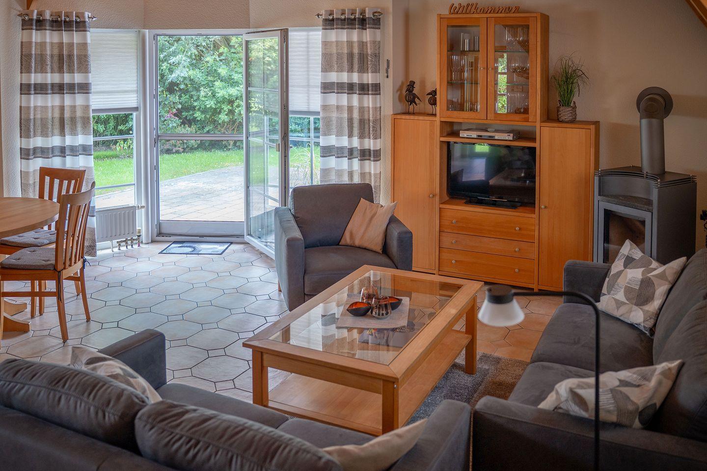 Auf zwei Etagen verteilen sich 85?m² mit einem hellen Wohnbereich, Kaminofen für kühle Abende und einer offenen Küche mit allem, was man braucht. Drei Schlafzimmer (eins mit Doppelbett, eins mit zwei Einzelbetten, eins mit getrennt stehenden Betten), ein Tageslichtbad mit Dusche und ein zusätzliches WC sorgen für Komfort.