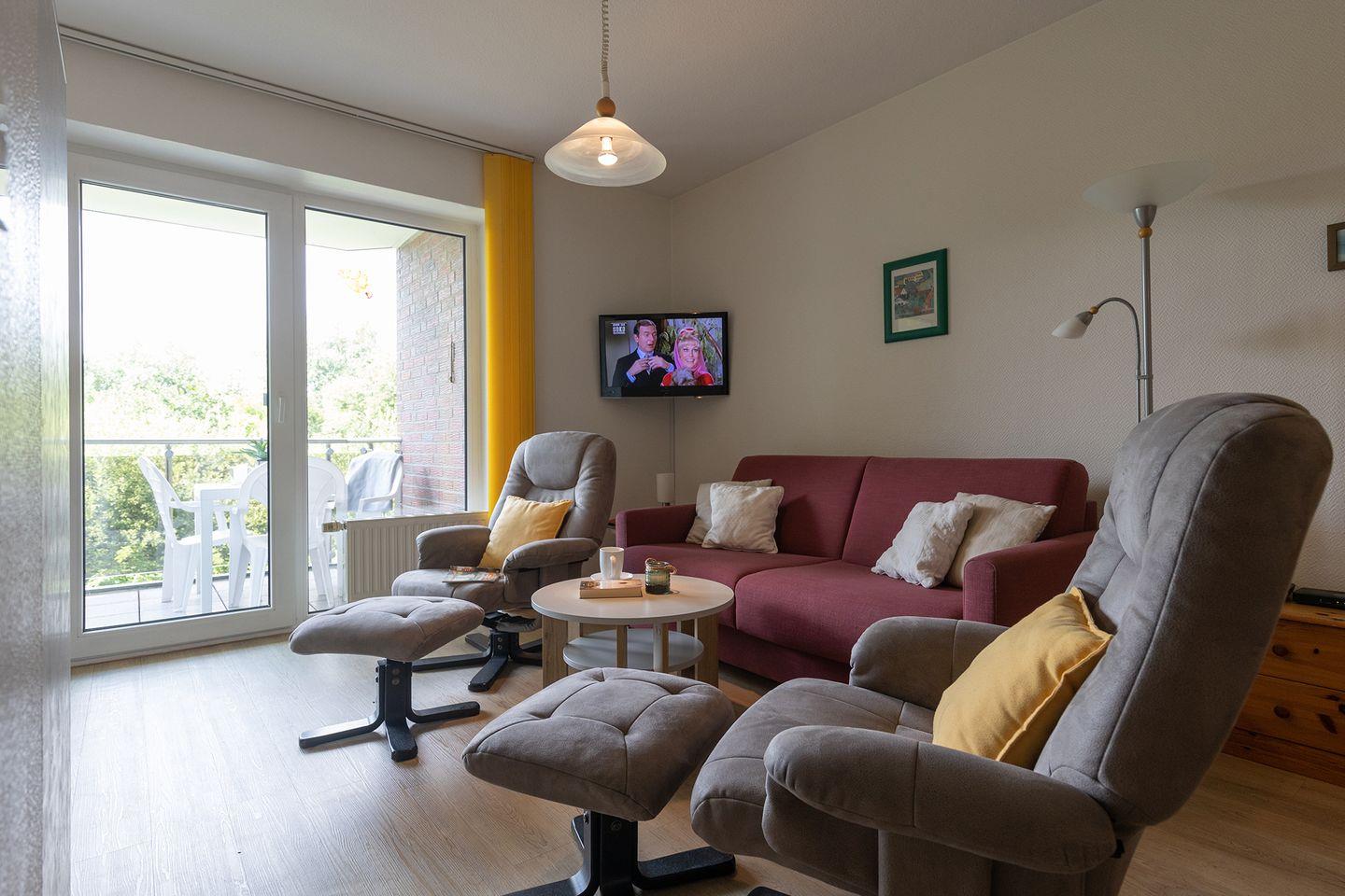 Strandnahe Ferienwohnung für bis zu 4 Personen mit Balkon, Schlafzimmer, Wohnbereich mit Schlafplätzen, gut ausgestatteter Küche und kostenlosem Parkplatz. Ruhige Lage im Cuxlandpark Wremen, nur wenige Gehminuten vom Deich, Grünstrand und Kutterhafen entfernt. Ideal für Paare oder Familien mit Kindern - Kinderbett und Hochstuhl inklusive.