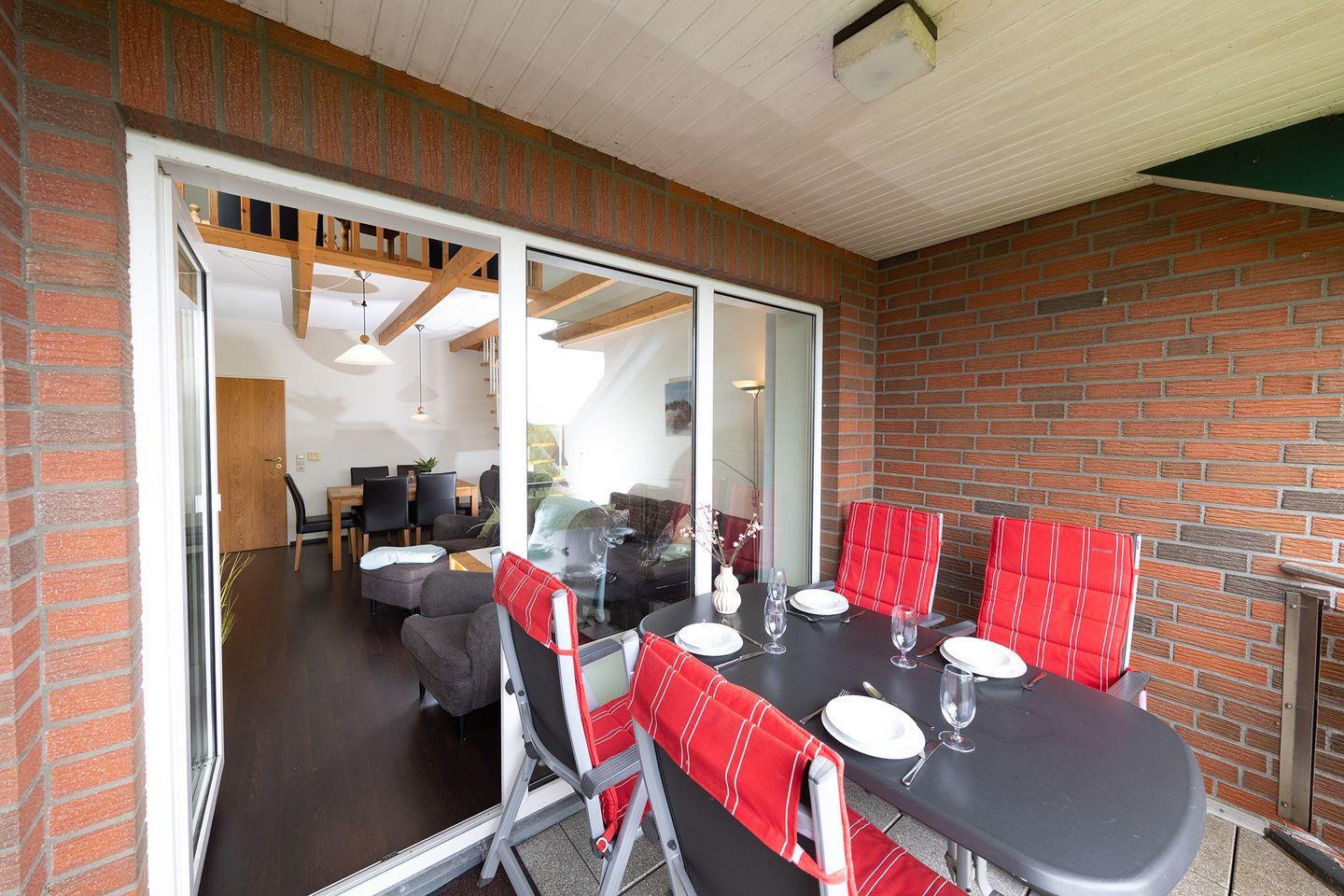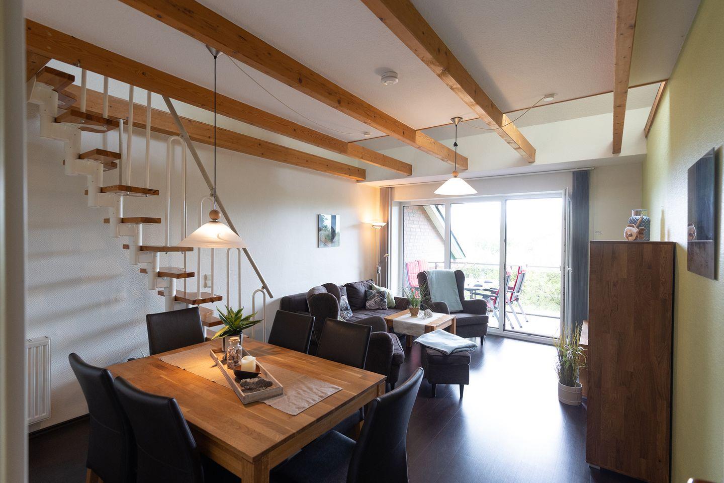 Maisonettewohnung mit Loggia, Galerie und Platz für bis zu 6 Personen – ruhig gelegen im Appartementhaus Lilli-Marleen, direkt hinter dem Deich. Zwei Schlafbereiche, Schlafcouch, voll ausgestattete Küche, modernes Bad, Kinderbett, Hochstuhl und kostenfreier Parkplatz. Ideal für Familien, die Weite und Nordseeluft lieben.
