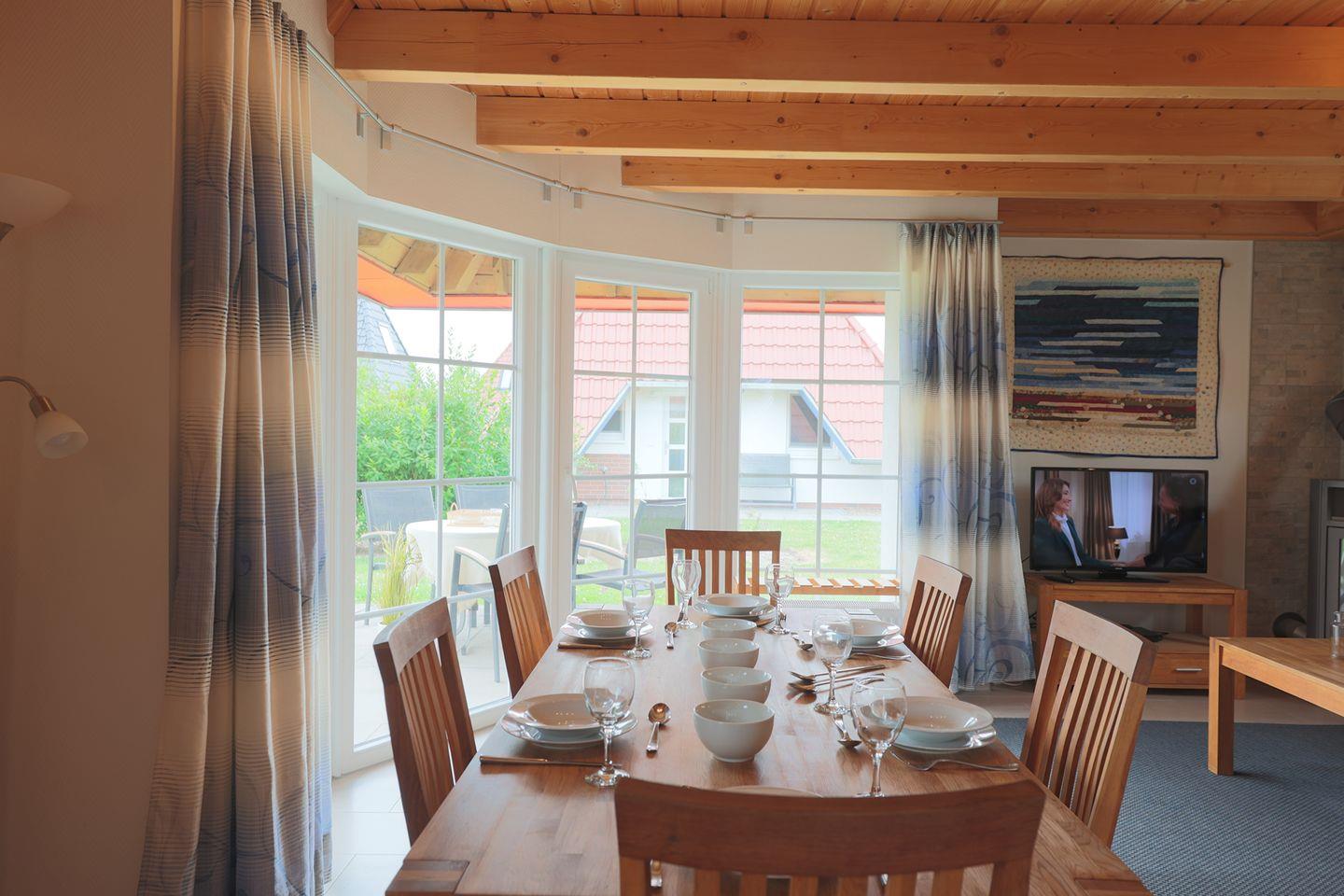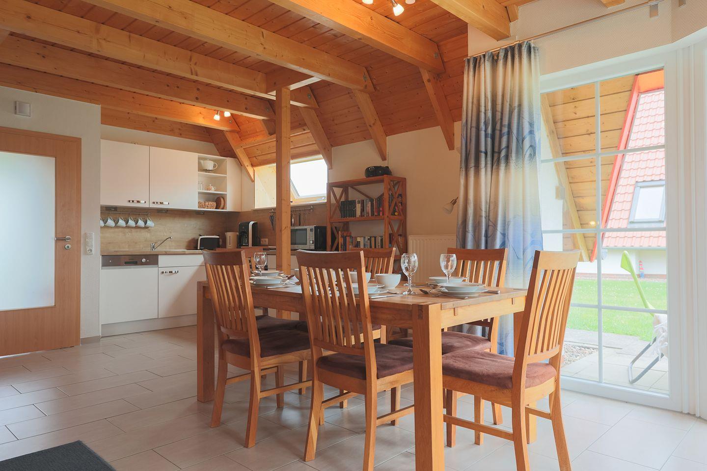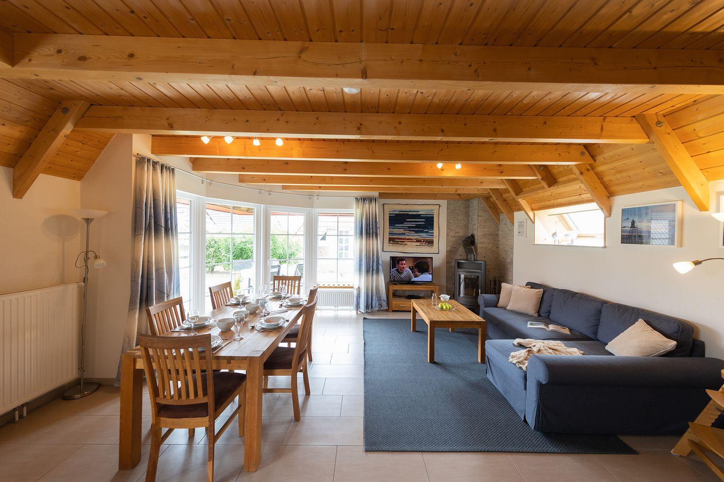 Dieses familienfreundliche Ferienhaus für Familien an der Nordsee bietet auf 68?qm viel Raum für entspannte Tage: ein großzügiges Wohn-Esszimmer mit Kaminofen, eine moderne Küche mit Schlafsofa und Zugang zur möblierten Terrasse, zwei Schlafzimmer unterm Dach sowie ein helles Bad mit Dusche und Waschmaschine.