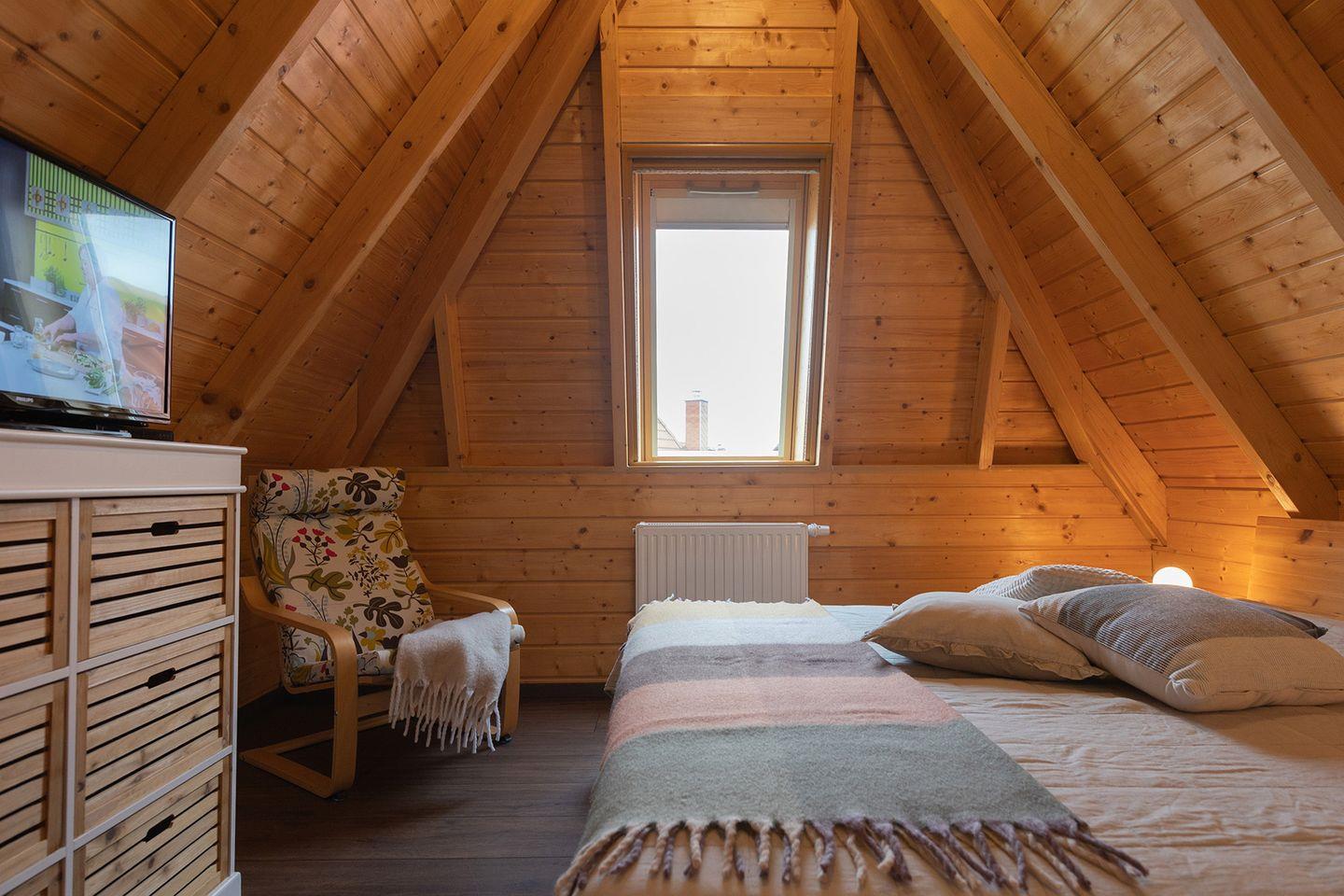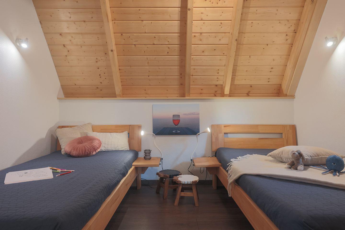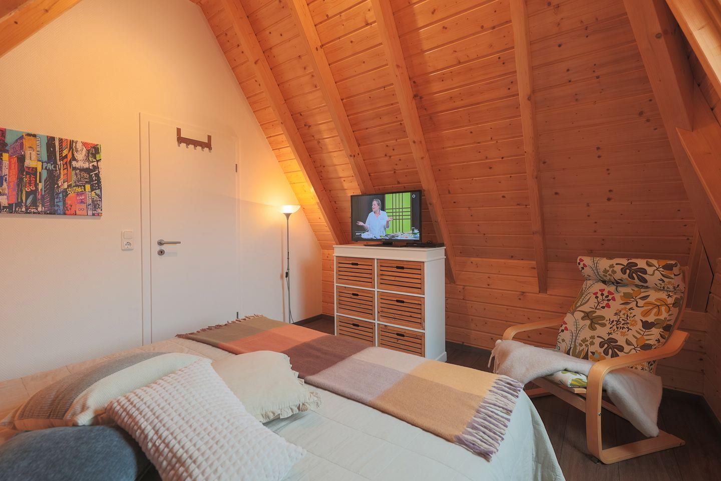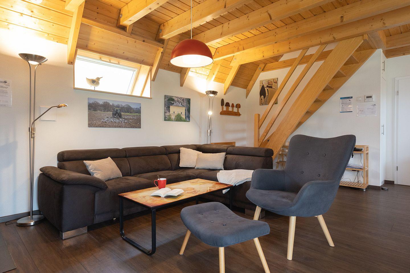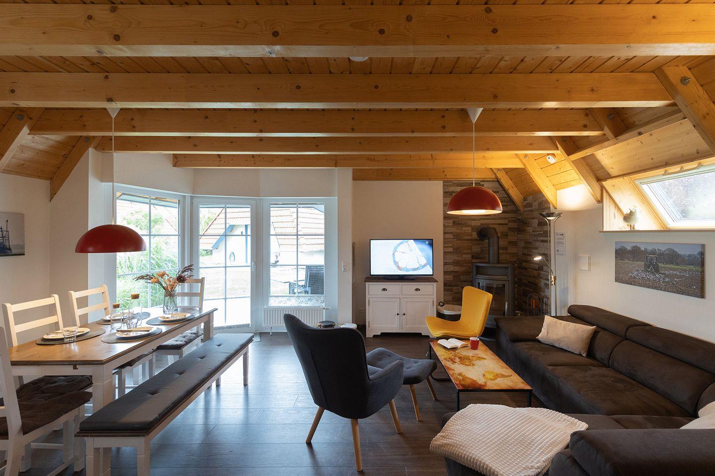 Auf zwei Etagen und 85?m² bietet das allergikerfreundliche Haus viel Raum: Im Erdgeschoss ein heller Wohnbereich mit Kaminofen, offener Küche mit Geschirrspüler, ein Schlafzimmer mit zwei Einzelbetten und ein Duschbad mit Waschmaschine. Oben: ein Elternschlafzimmer mit Doppelbett, ein weiteres Zimmer mit getrennt stehenden Betten sowie ein zusätzliches WC. Alle Räume sind mit Designboden ausgestattet.