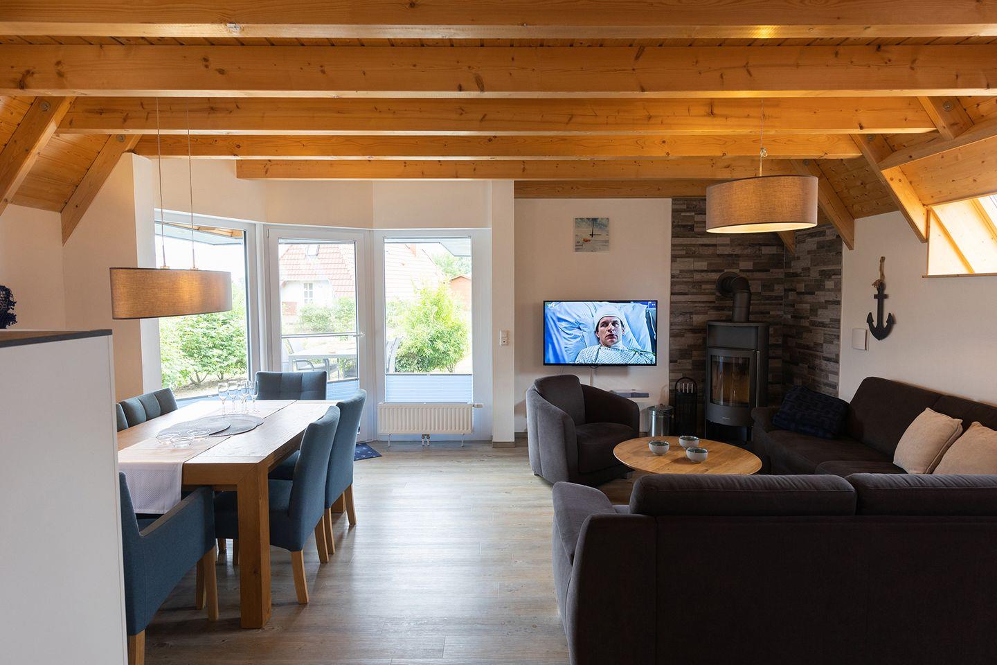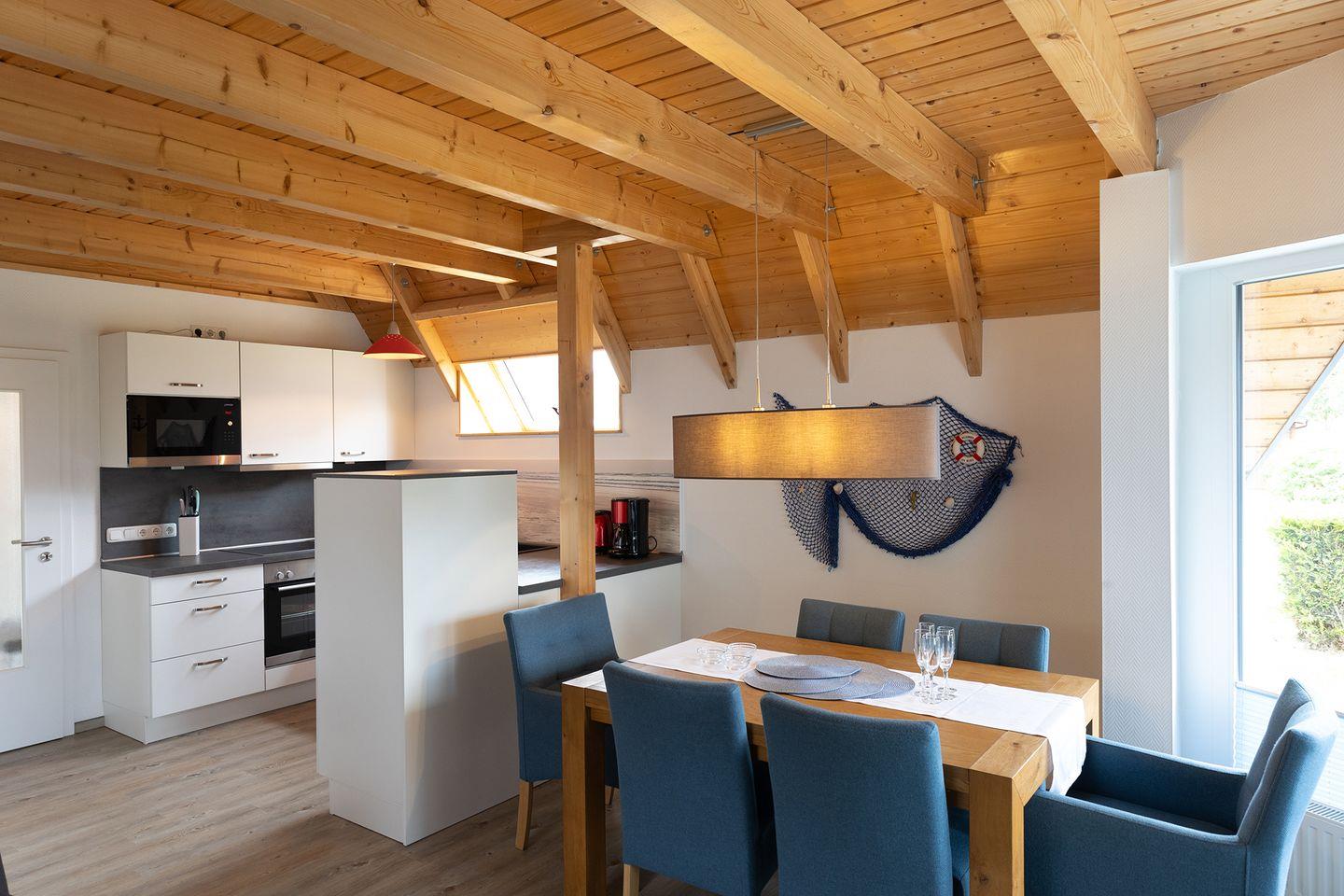 Bei eurer Ankunft liegt das Ferienhaus ruhig im Marschland, nur einen kurzen Fußweg vom Deich entfernt. Auf zwei Etagen verteilen sich vier Zimmer: Im Erdgeschoss verbindet der offene Wohn-Essbereich mit Kaminofen und komplett ausgestatteter Küche alles, was ihr für gemeinsame Stunden braucht. Dazu kommen ein Schlafzimmer mit zwei Einzelbetten und ein helles Duschbad mit Waschmaschine. Für die Kleinsten sind Kinderreisebett und Hochstuhl.
