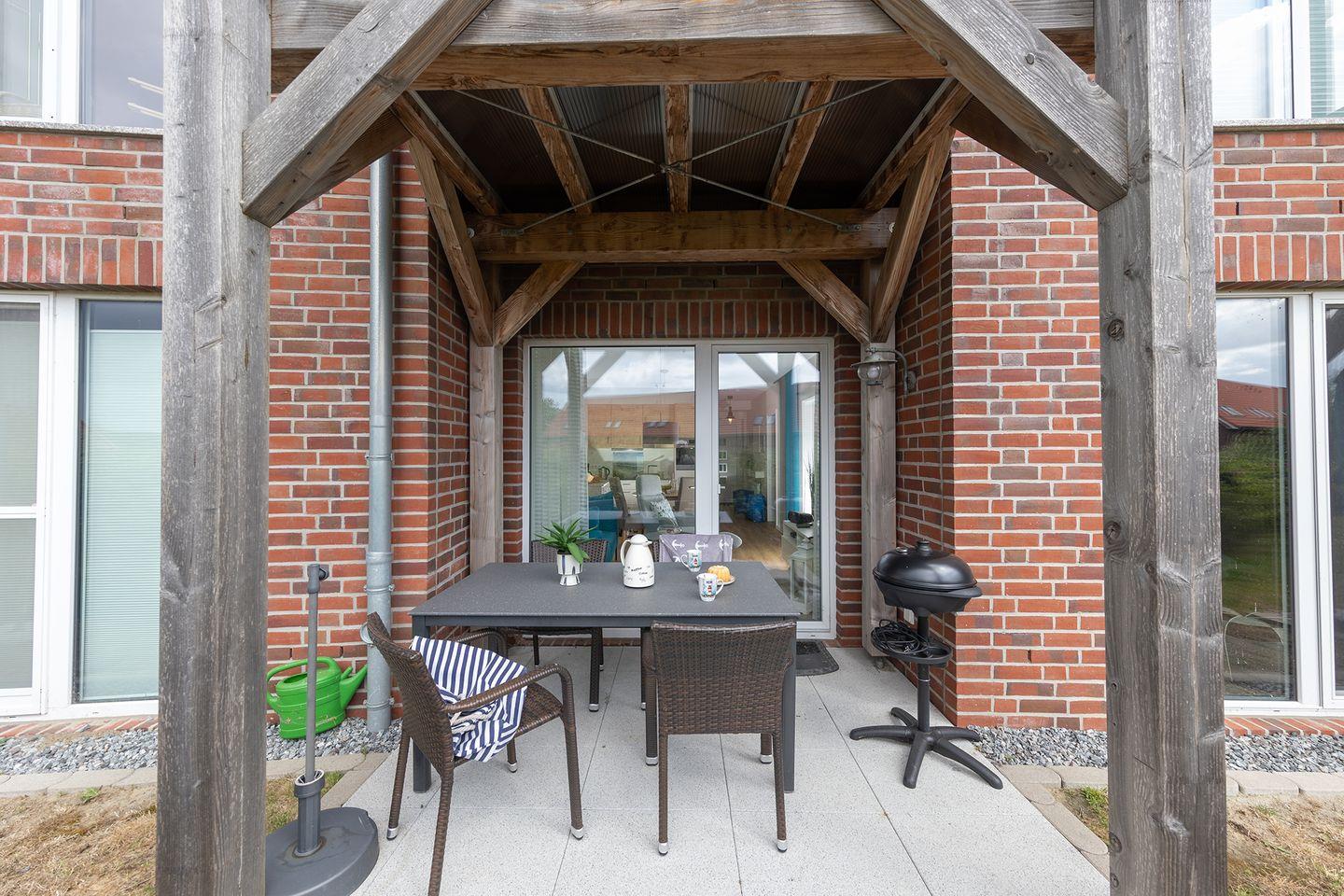 Draußen lädt die möblierte Terrasse zum Verweilen ein. Vielleicht mit einem Buch, vielleicht einfach nur mit dem Blick ins Grüne, während irgendwo eine Möwe ruft und der Wind vom Meer her weht.