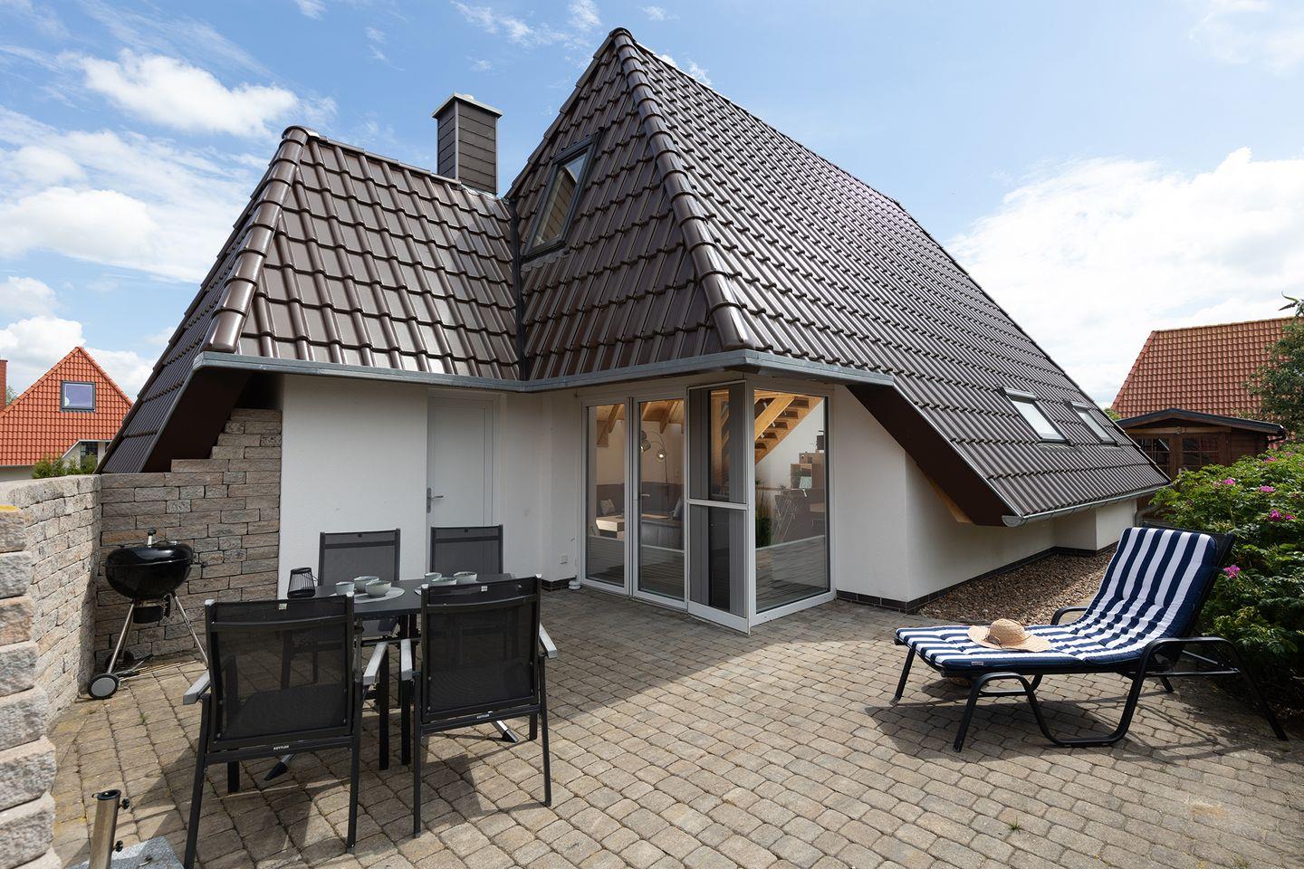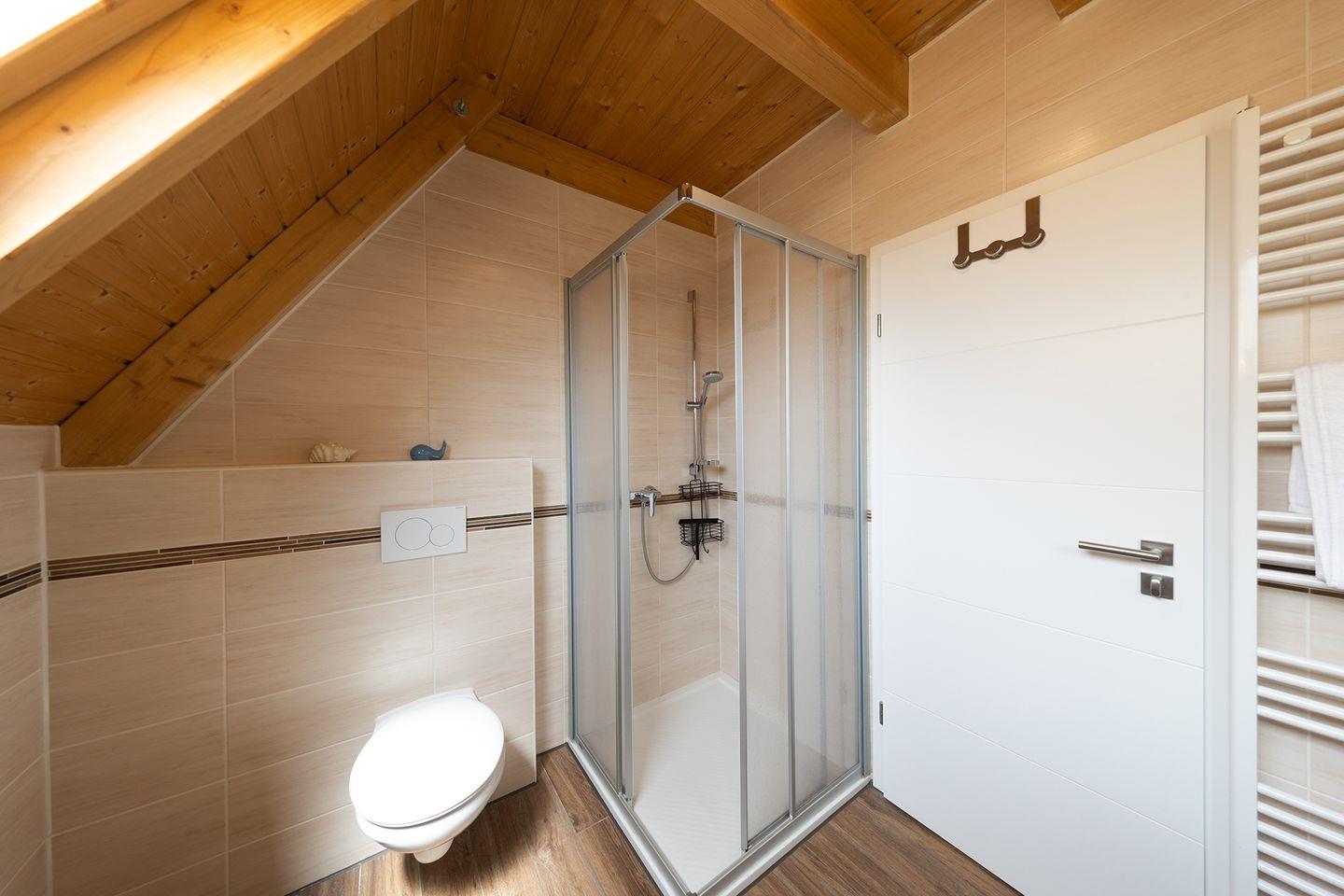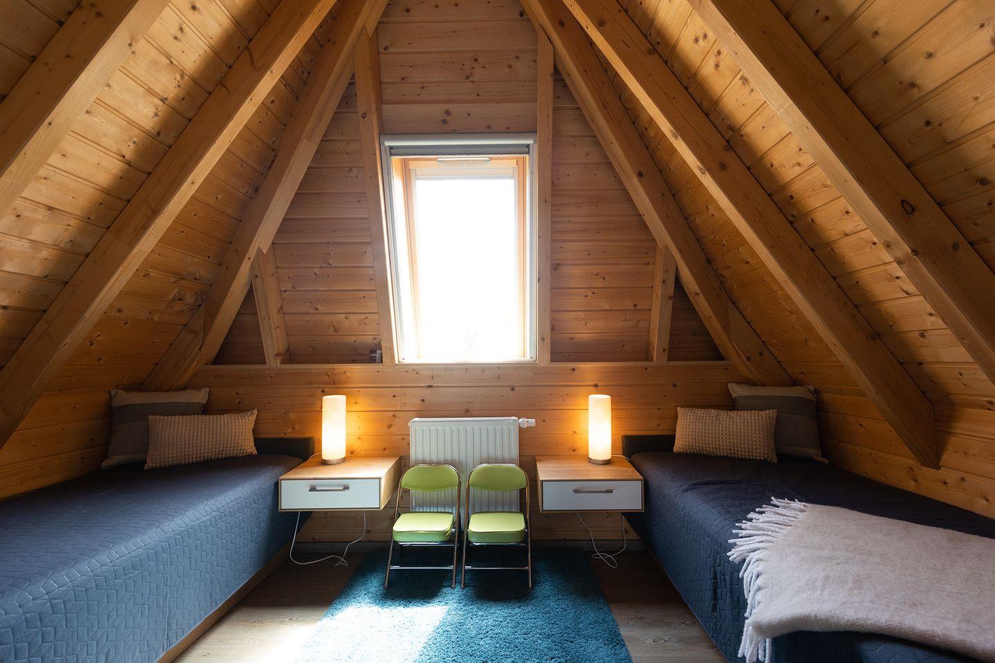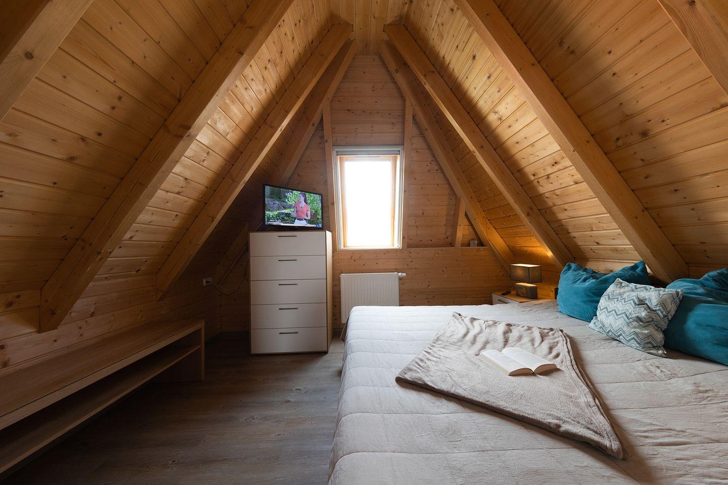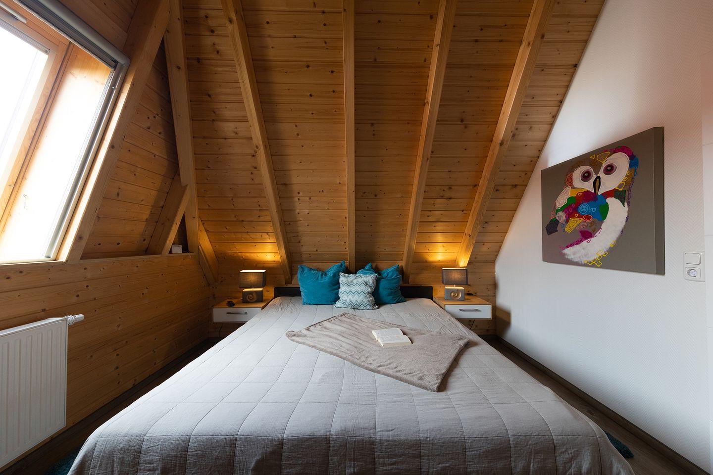 Im Obergeschoss erwarten euch das Elternschlafzimmer mit Doppelbett und TV sowie ein weiteres Zimmer mit zwei Einzelbetten und separatem WC. Abdunkelbare Rollos und Vinylböden sorgen für erholsame Nächte, Glasfaser-WLAN, Telefonflat und die E-Ladestation an der Rezeption runden das Komfortpaket ab. Unter dem Gartenhaus sind eure Fahrräder sicher verstaut, und auf der möblierten Terrasse mit Holzkohlegrill klingt der Tag entspannt aus.