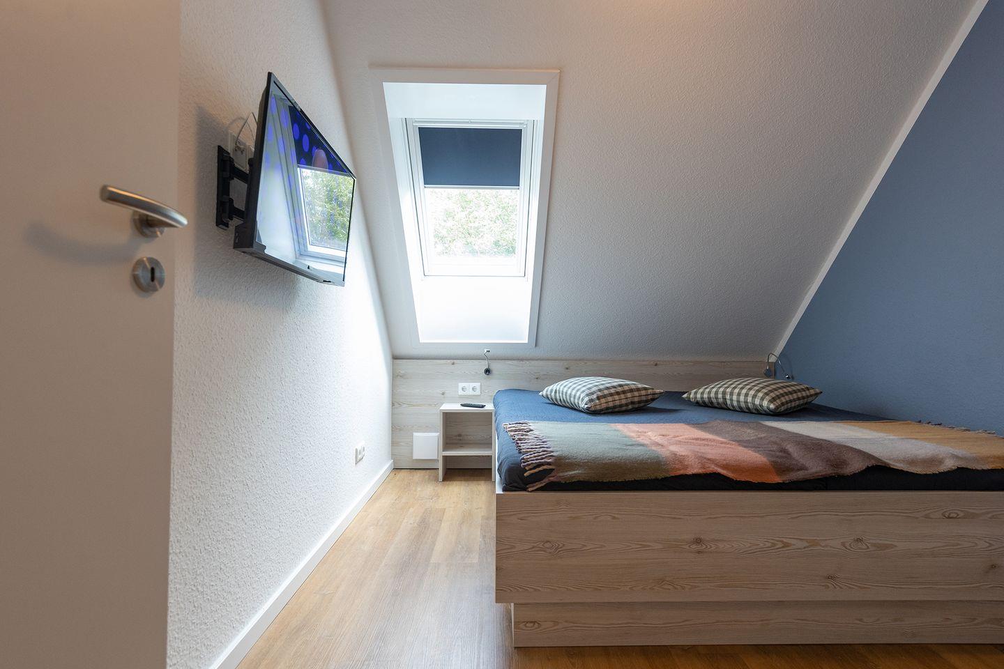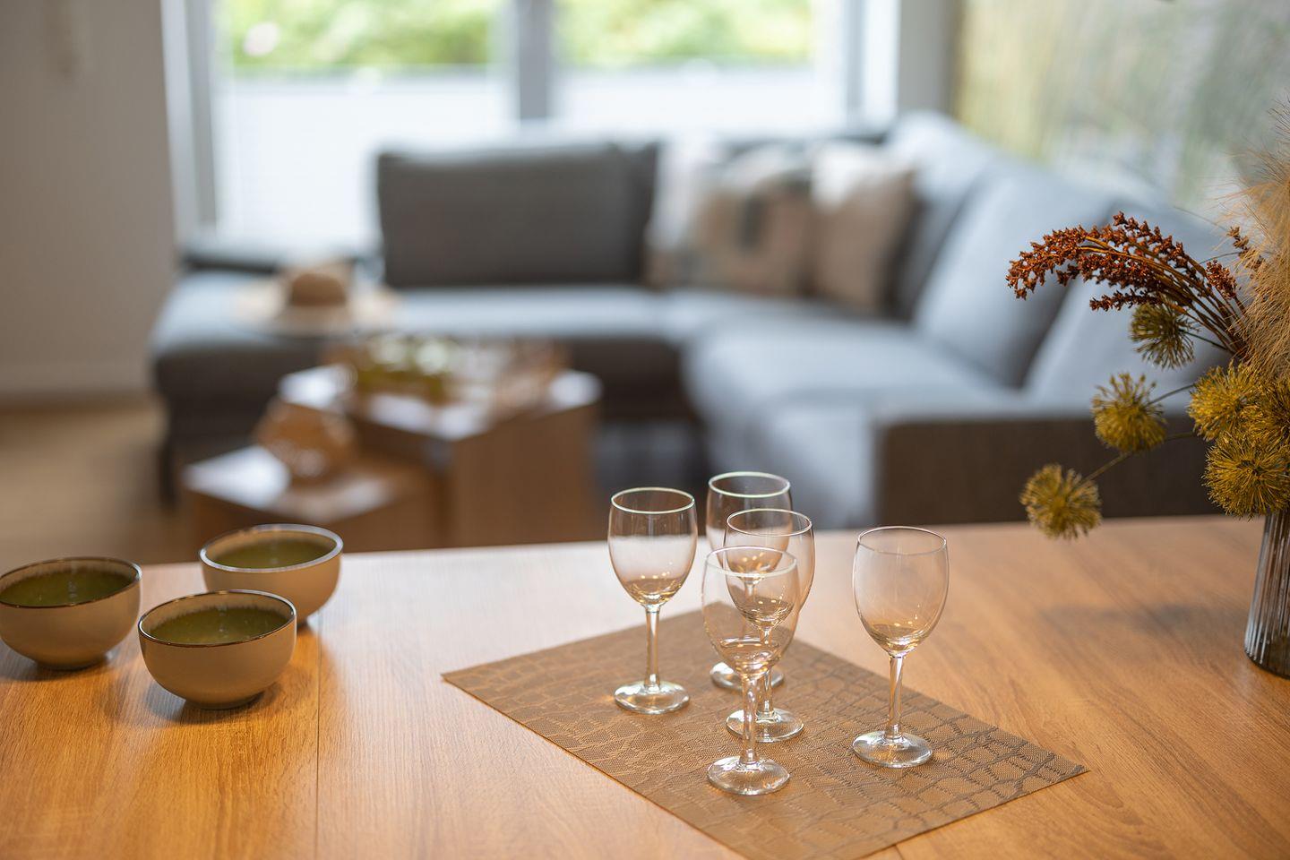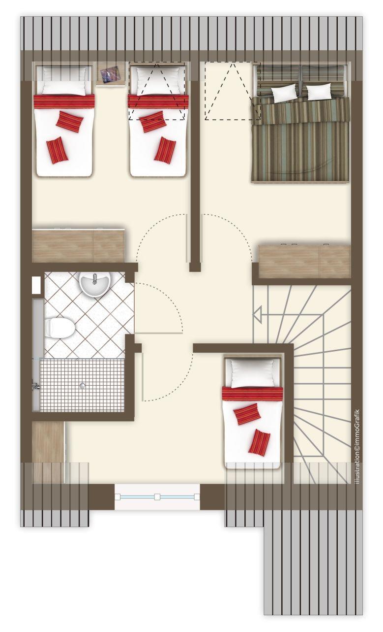 Im Erdgeschoss: ein heller Wohn-Essbereich mit gemütlicher Wohnlandschaft, offener Küche, Esstisch und Gäste-WC. Im Obergeschoss: drei Schlafzimmer – zwei mit Doppelbett und eins mit zwei Einzelbetten – sowie ein Duschbad. Alle Schlafräume lassen sich verdunkeln und sind mit Laminat ausgelegt. Fußbodenheizung und automatische Be- und Entlüftung sorgen für ein angenehmes Raumklima.