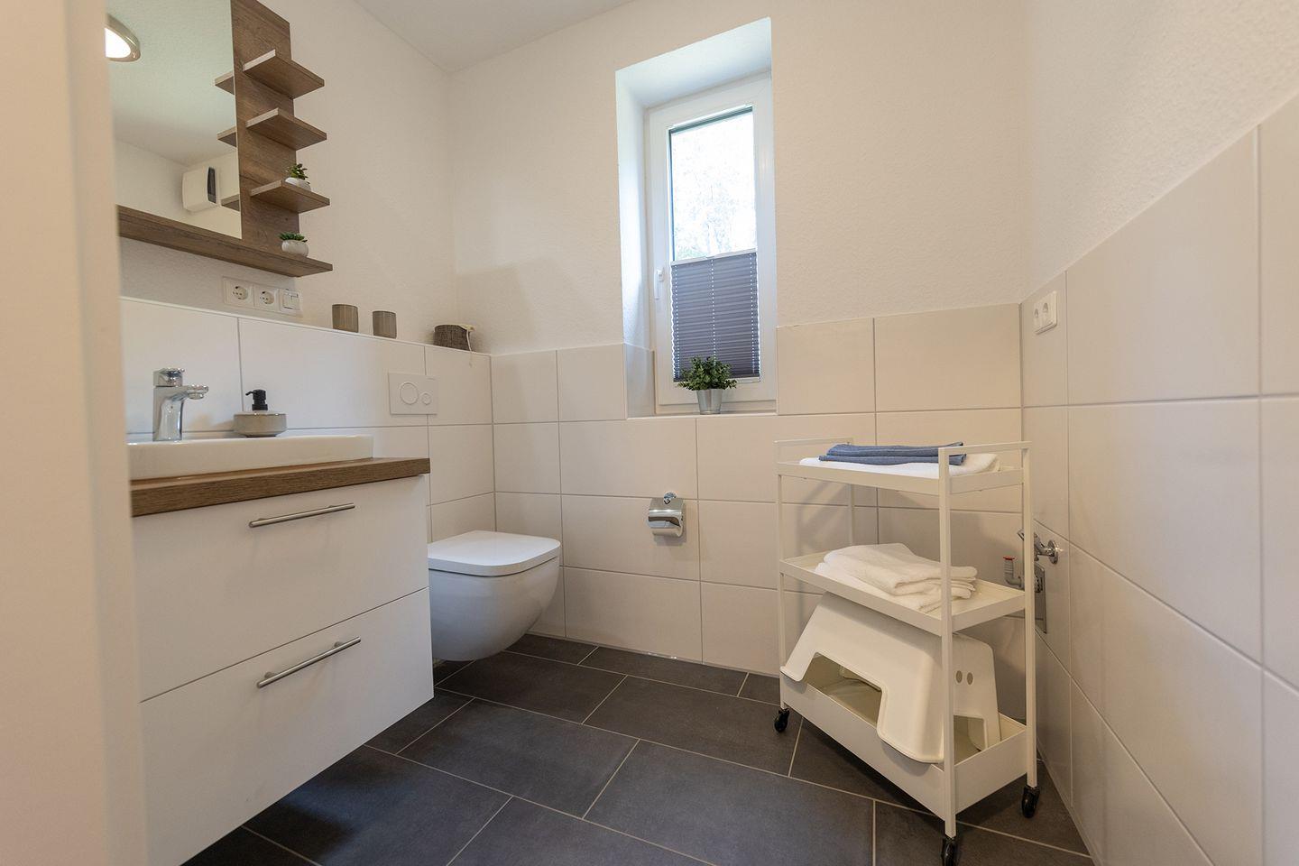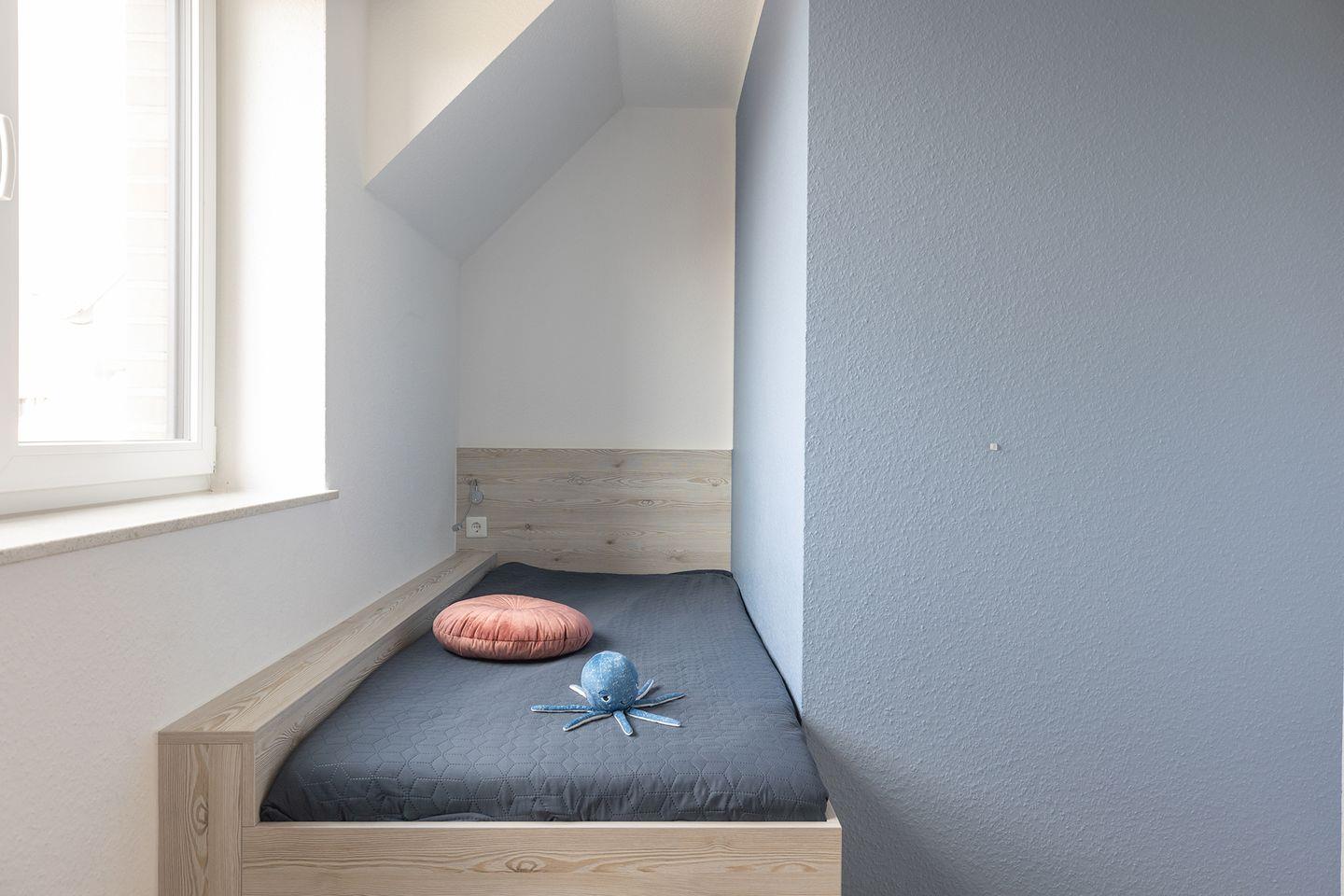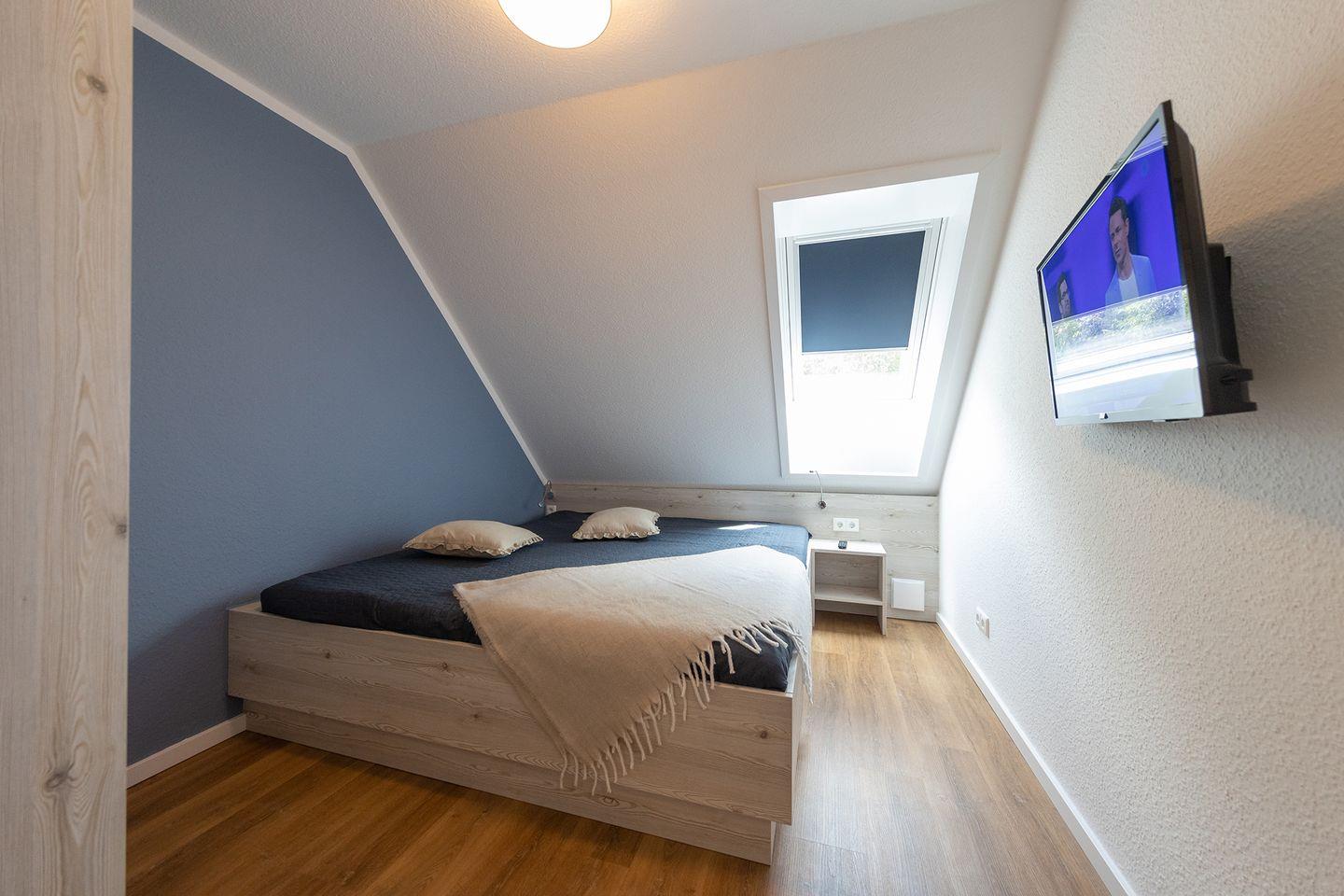 Im Erdgeschoss: ein heller Wohn-Essbereich mit gemütlicher Wohnlandschaft, offener Küche, Esstisch und Gäste-WC. Im Obergeschoss: drei Schlafzimmer – zwei mit Doppelbett und eins mit zwei Einzelbetten – sowie ein Duschbad. Alle Schlafräume lassen sich verdunkeln und sind mit Laminat ausgelegt. Fußbodenheizung und automatische Be- und Entlüftung sorgen für ein angenehmes Raumklima.