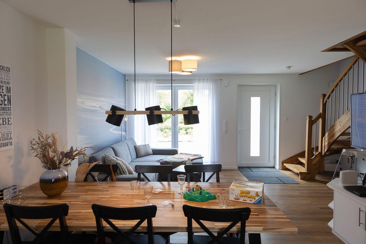 Im Erdgeschoss: ein heller Wohn-Essbereich mit gemütlicher Wohnlandschaft, offener Küche, Esstisch und Gäste-WC. Im Obergeschoss: drei Schlafzimmer – mit zwei Doppelbetten und einem Etagenbett – sowie ein Duschbad. Alle Schlafräume lassen sich verdunkeln und sind mit Laminat ausgelegt. Fußbodenheizung und automatische Be- und Entlüftung sorgen für ein angenehmes Raumklima.
