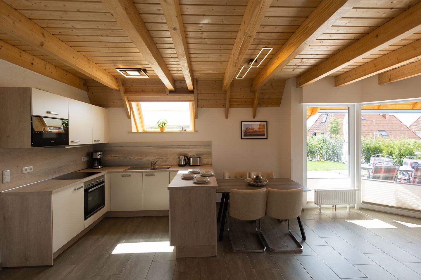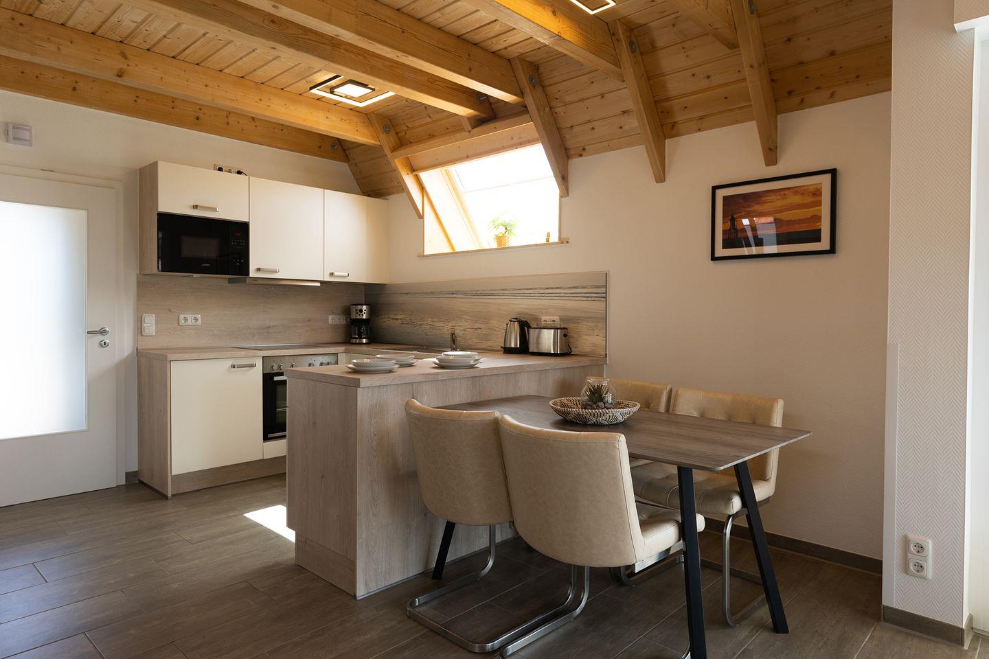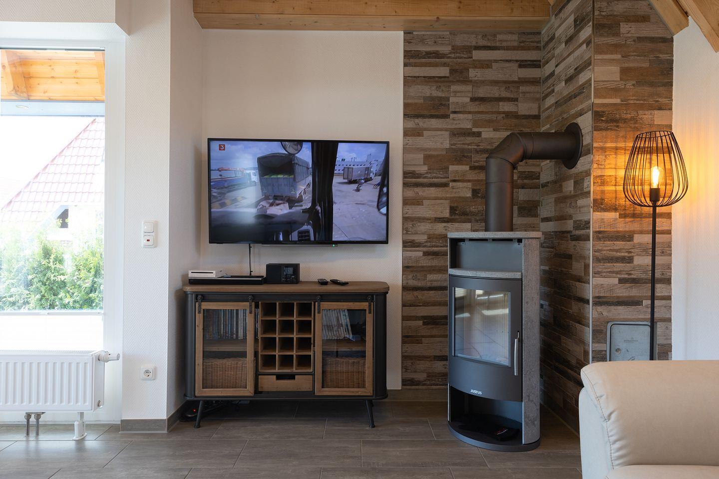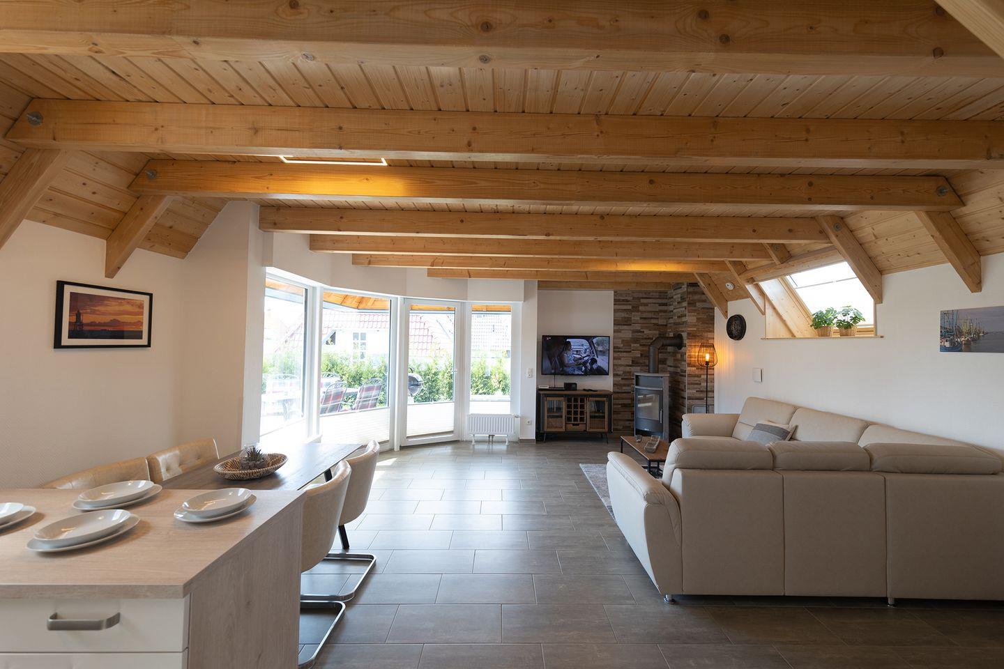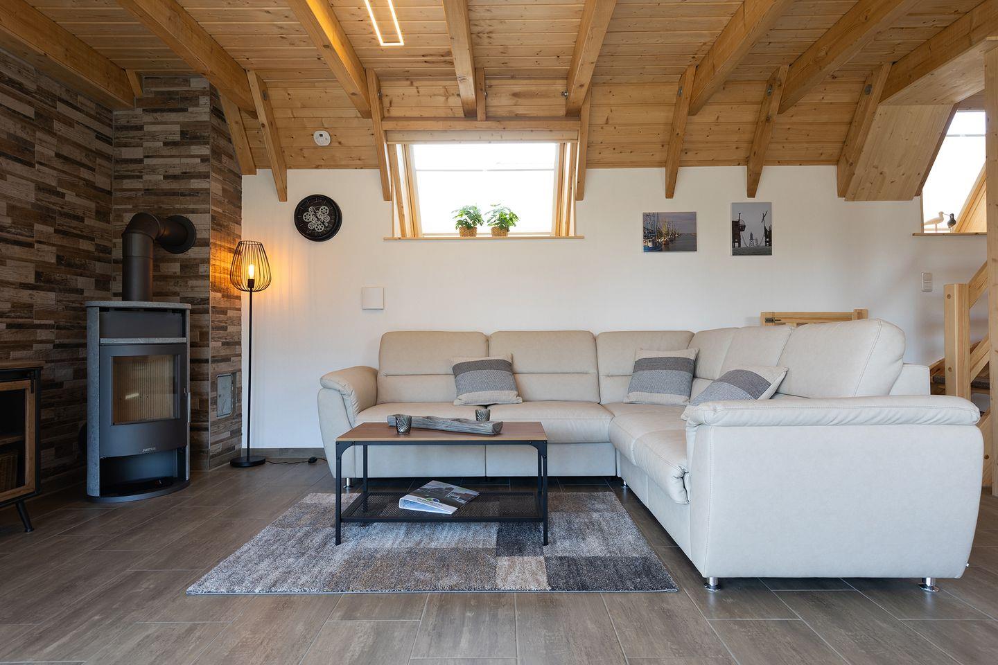 Morgens kurz durchs Gras laufen und die salzige Brise spüren: Im Ferienhaus „Wattwurm“ in Dorum-Neufeld beginnt der Nordseeurlaub mit Kindern schon an der Haustür. Auf 68 m² bietet das moderne Haus zwei Schlafzimmer, ein Badezimmer mit Dusche und Wanne, ein Gäste-WC sowie eine offene Küche mit Spülmaschine. Der gemütliche Wohnbereich mit Kaminofen lädt zum Spielen, Lesen und Zusammensitzen ein – perfekt für ein Ferienhaus für Familien an der Nordsee.