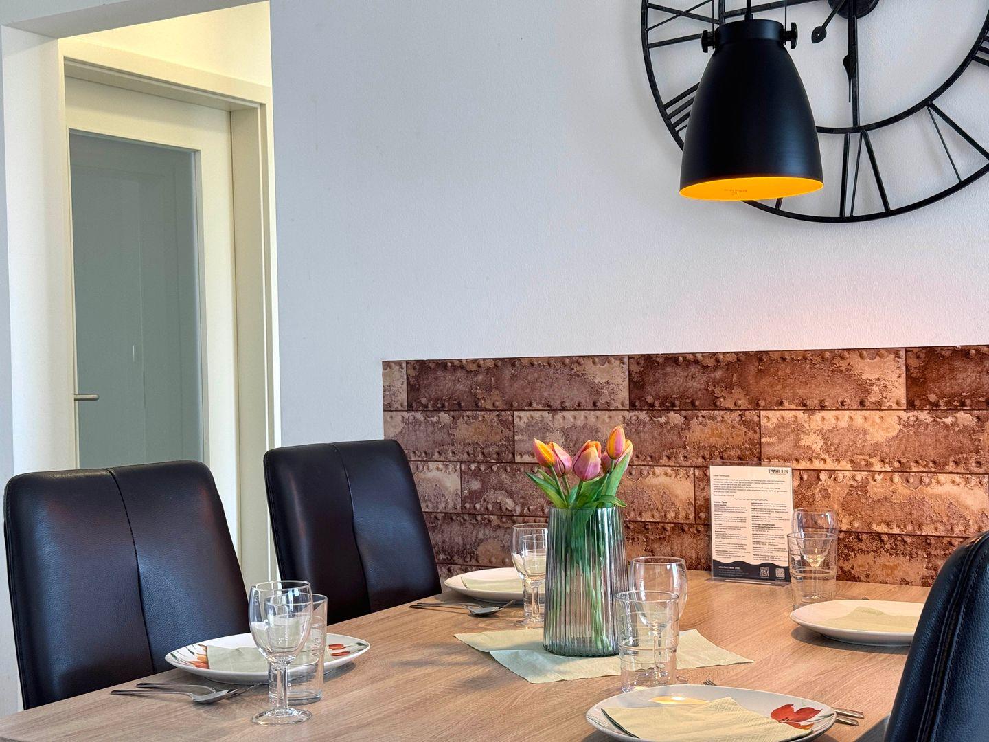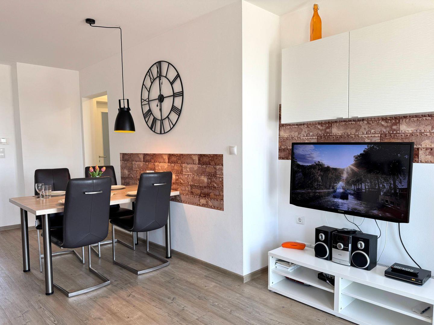 Die Wohnung bietet zwei Schlafzimmer mit komfortablen Boxspringbetten und einen gemütlichen Wohnbereich mit Sofa und Sessel. Die gut ausgestattete Einbauküche verfügt über einen Geschirrspüler, Cerankochfeld, Backofen, Mikrowelle und Kühlschrank. Am großen Esstisch kannst du mit der Familie essen oder einen lustigen Spielenachmittag verbringen – Spiele, Bücher und eine Stereoanlage sind vorhanden.