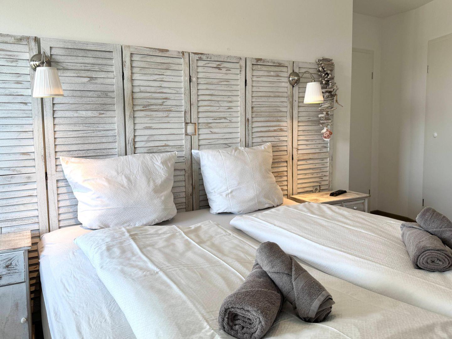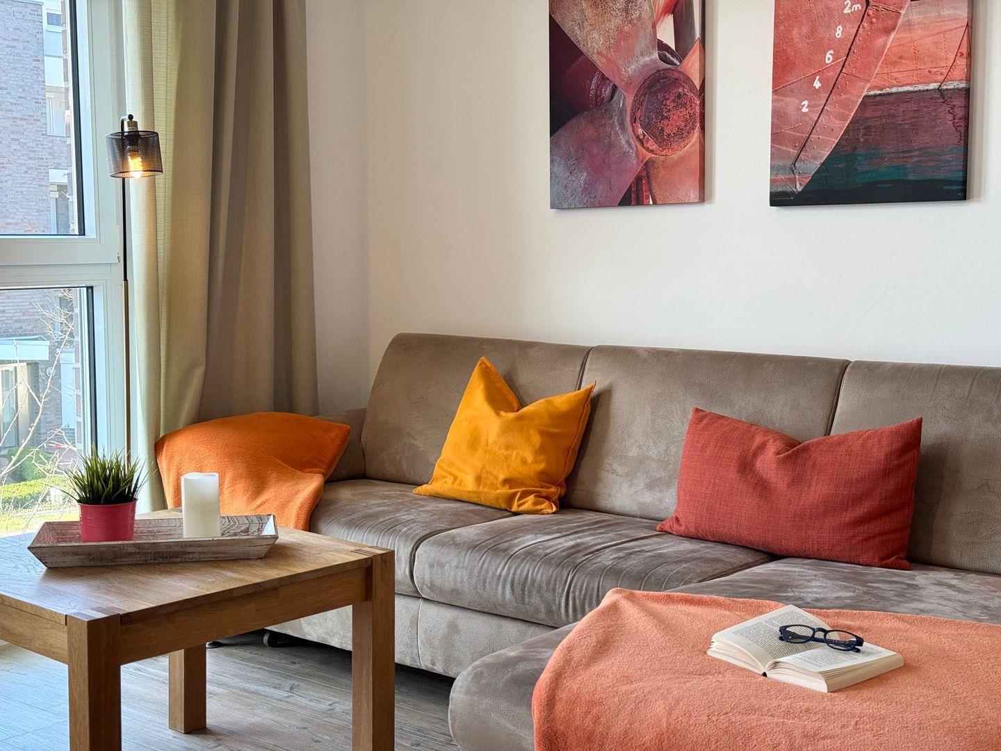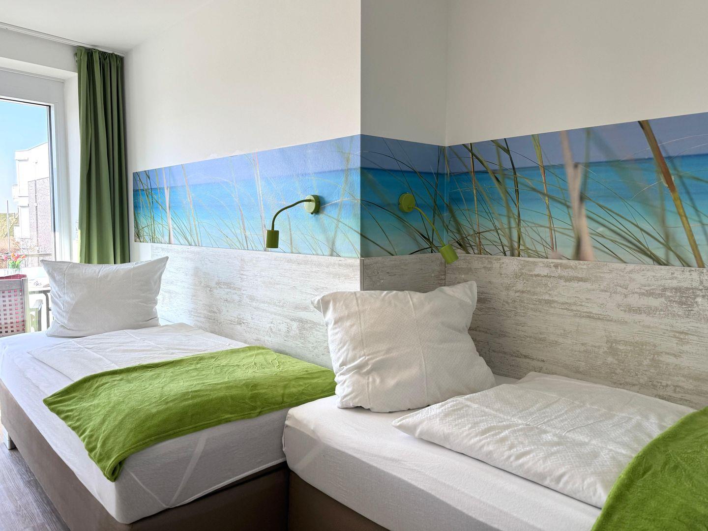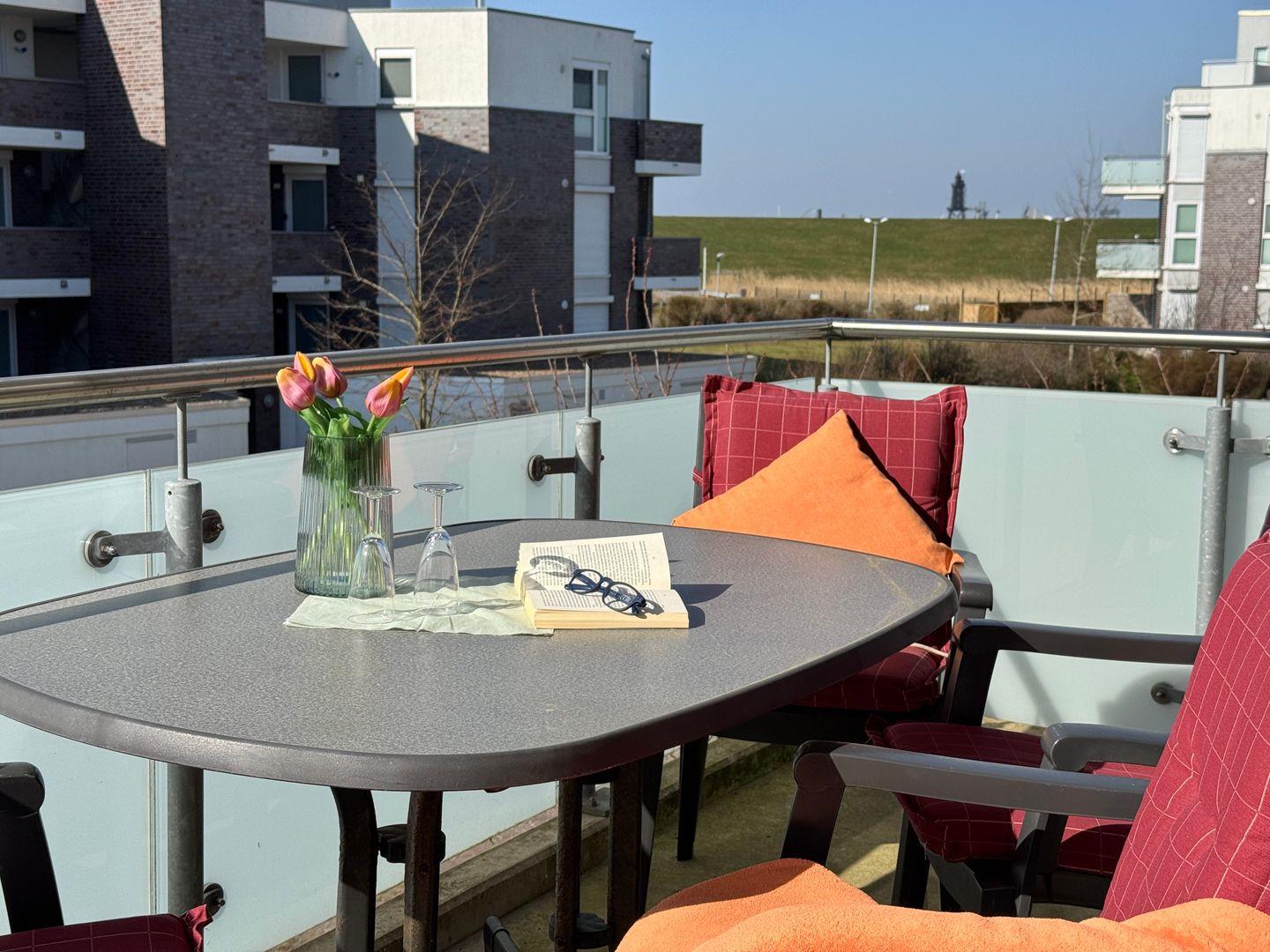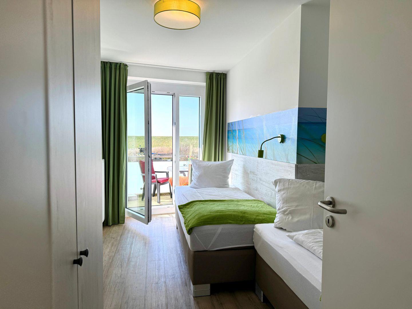 Das hochwertig ausgestattete 3-Zimmer-Appartement bietet Platz für bis zu 4 Personen und liegt im 1. Stock, bequem erreichbar mit dem Fahrstuhl. Freu dich auf sonnige Nachmittage, denn die Wohnung ist nach Südwesten ausgerichtet. Von den großen bodentiefen Fenstern im Wohnraum, den Schlafzimmern und vom großzügigen Balkon aus hast du einen wunderschönen Blick auf den Deich und du bist nur 200 m vom Meer entfernt.