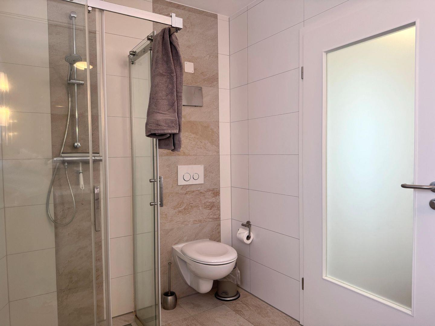 Das moderne Badezimmer ist mit einer bodengleichen Dusche mit Ganzglas-Duschabtrennung, einem Waschtisch, einem großen Spiegel und einem Fenster ausgestattet.