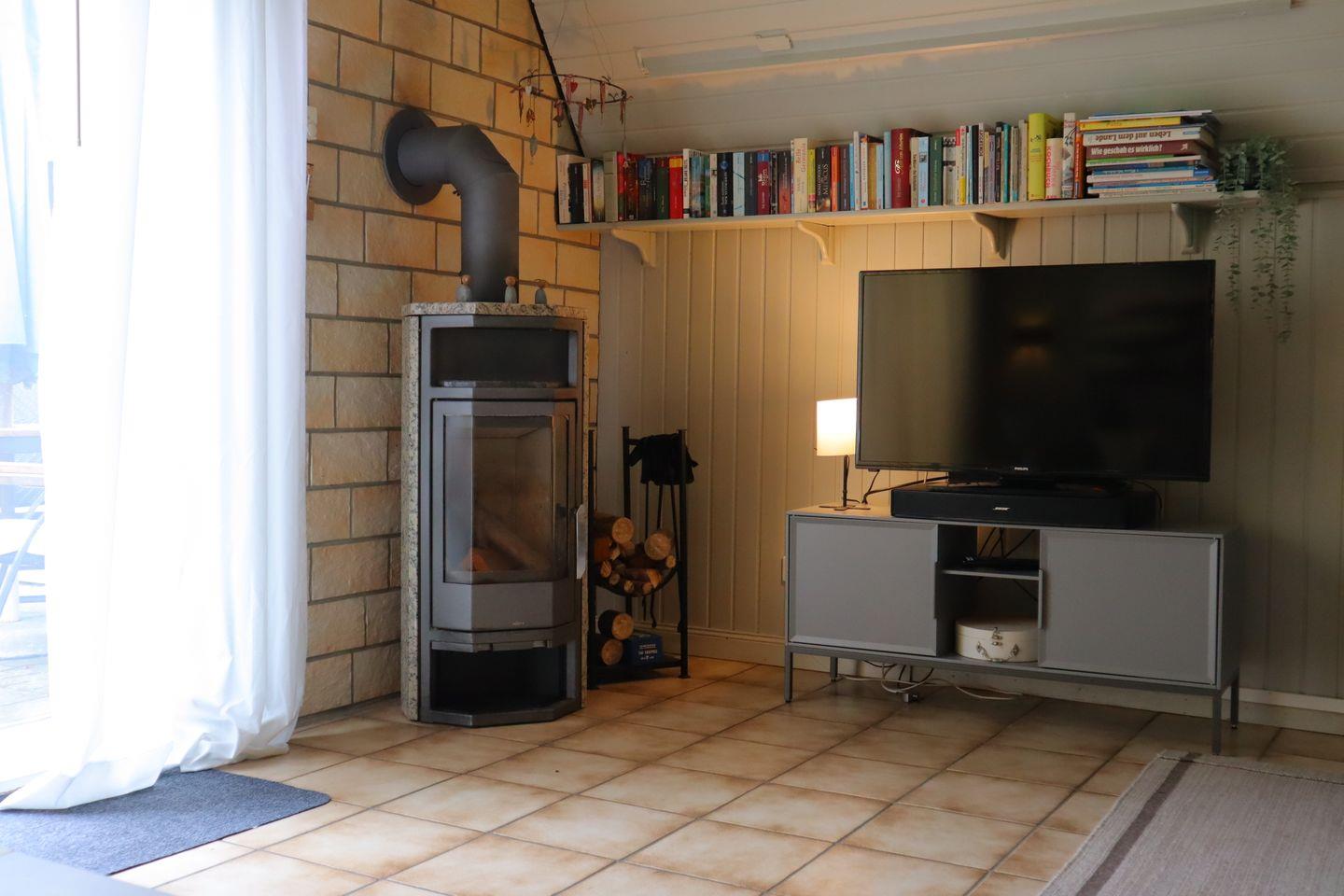 - Offener Wohn- und Essbereich mit einem Kamin für gemütliche Stunden. Vom Essbereich aus haben Sie direkten Zugang zur Sonnenterrasse, wo Sie bei gutem Wetter das Frühstück im Freien genießen können.
