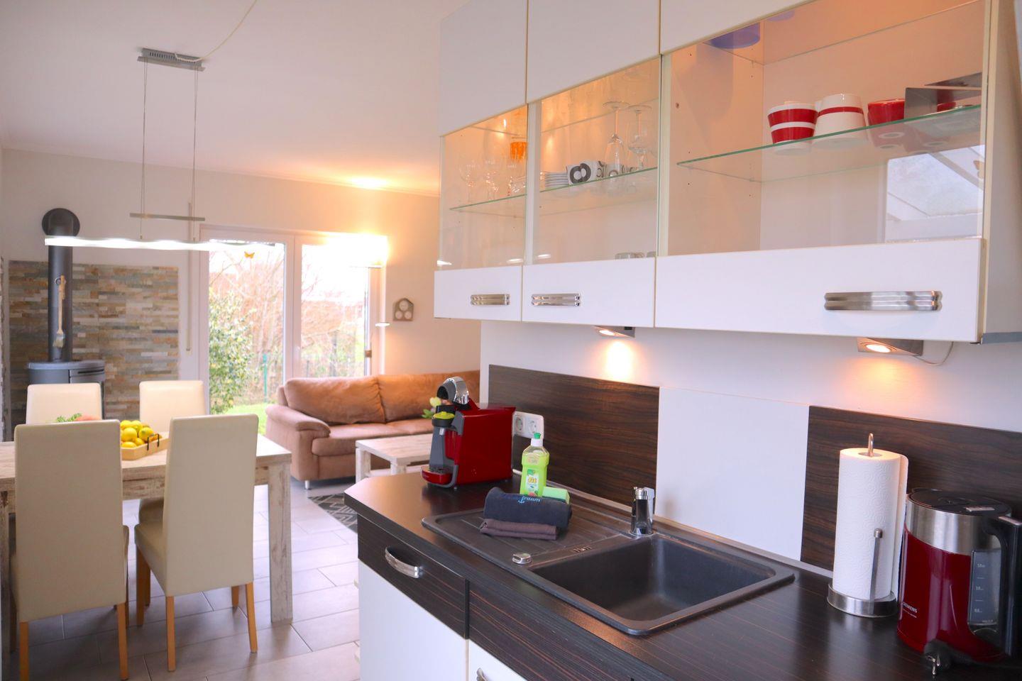 Das freistehende Haus verfügt über einen eingezäunten Garten, eine moderne Einbauküche, Kaminofen, ein großes Duschbad, ein Gäste-WC und eine Waschmaschine.