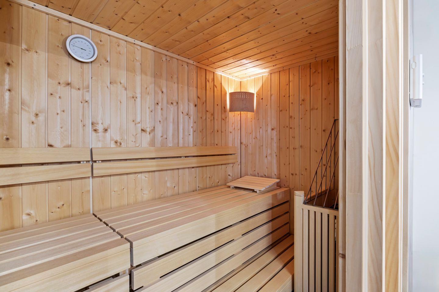 Das überaus komfortable Badezimmer gleicht einer kleinen Wellnessoase: Neben Fußbodenheizung, begehbarer Regendusche, Doppelwaschtisch, separatem WC, Bidet, Handtuchwärmer, Föhn und Kosmetikspiegel befindet sich hier eine eigene Sauna zur vollkommenen Entspannung in privater Atmosphäre.