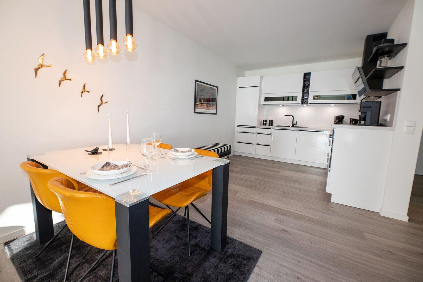Die Küche ist komplett ausgestattet mit Induktionsherd, Spülmaschine und allem, was man zum Selbstversorgen braucht. Besonderheit hier: die eigene Sauna, ideal nach windigen Strandtagen oder Radtouren durchs flache Wurster Land. Familien finden Babybett und Hochstuhl vor, Hunde sind willkommen.