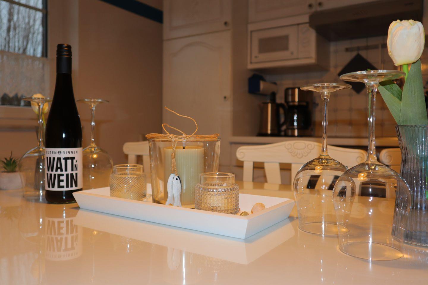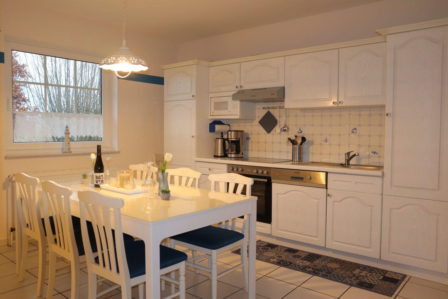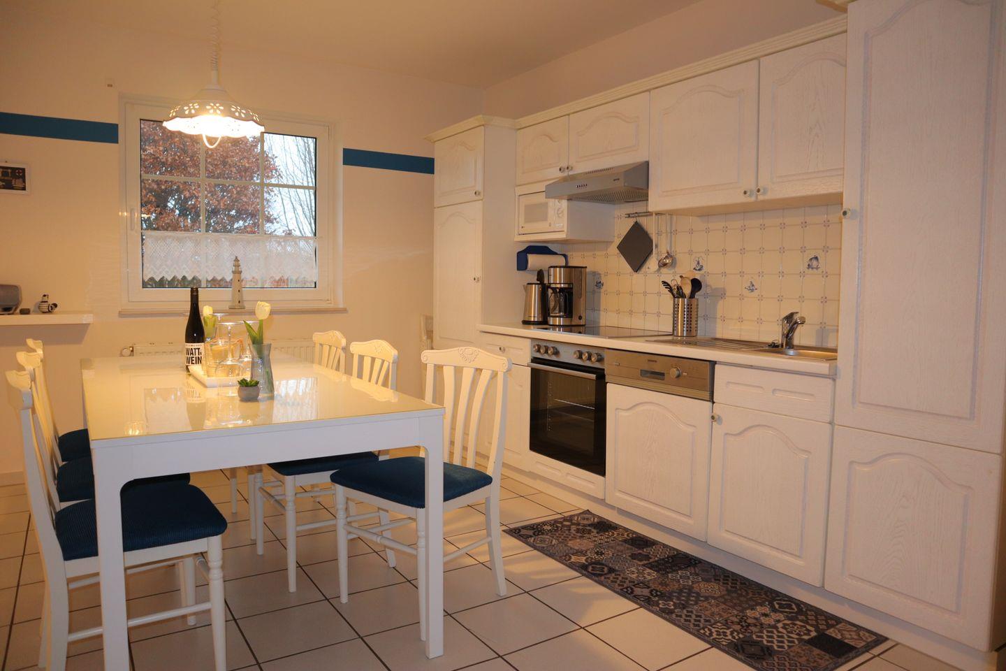 Im Inneren erwartet Sie ein helles, freundliches Ambiente mit viel Raum zum Ankommen und Wohlfühlen. Der großzügige Wohnbereich lädt zu gemeinsamen Stunden ein – ob beim Spielen, Lesen oder gemütlichen Abenden. Die separate, voll ausgestattete Küche bietet moderne Küchengeräte, viel Arbeitsfläche und alles, was Sie für die Selbstverpflegung im Urlaub benötigen. Besonders praktisch für größere Familien ist der separate Gefrierschrank, ideal für Vorräte, Eis oder fangfrischen Fisch aus dem Hafen.