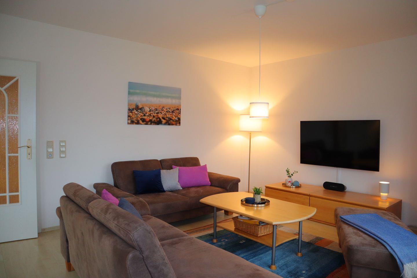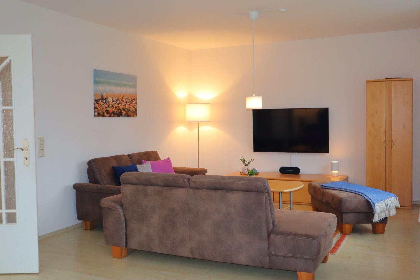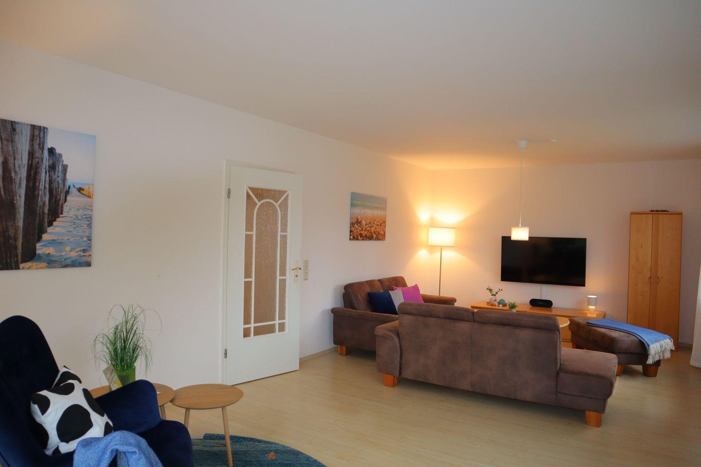 Im Inneren erwartet Sie ein helles, freundliches Ambiente mit viel Raum zum Ankommen und Wohlfühlen. Der großzügige Wohnbereich lädt zu gemeinsamen Stunden ein – ob beim Spielen, Lesen oder gemütlichen Abenden. Die separate, voll ausgestattete Küche bietet moderne Küchengeräte, viel Arbeitsfläche und alles, was Sie für die Selbstverpflegung im Urlaub benötigen. Besonders praktisch für größere Familien ist der separate Gefrierschrank, ideal für Vorräte, Eis oder fangfrischen Fisch aus dem Hafen.