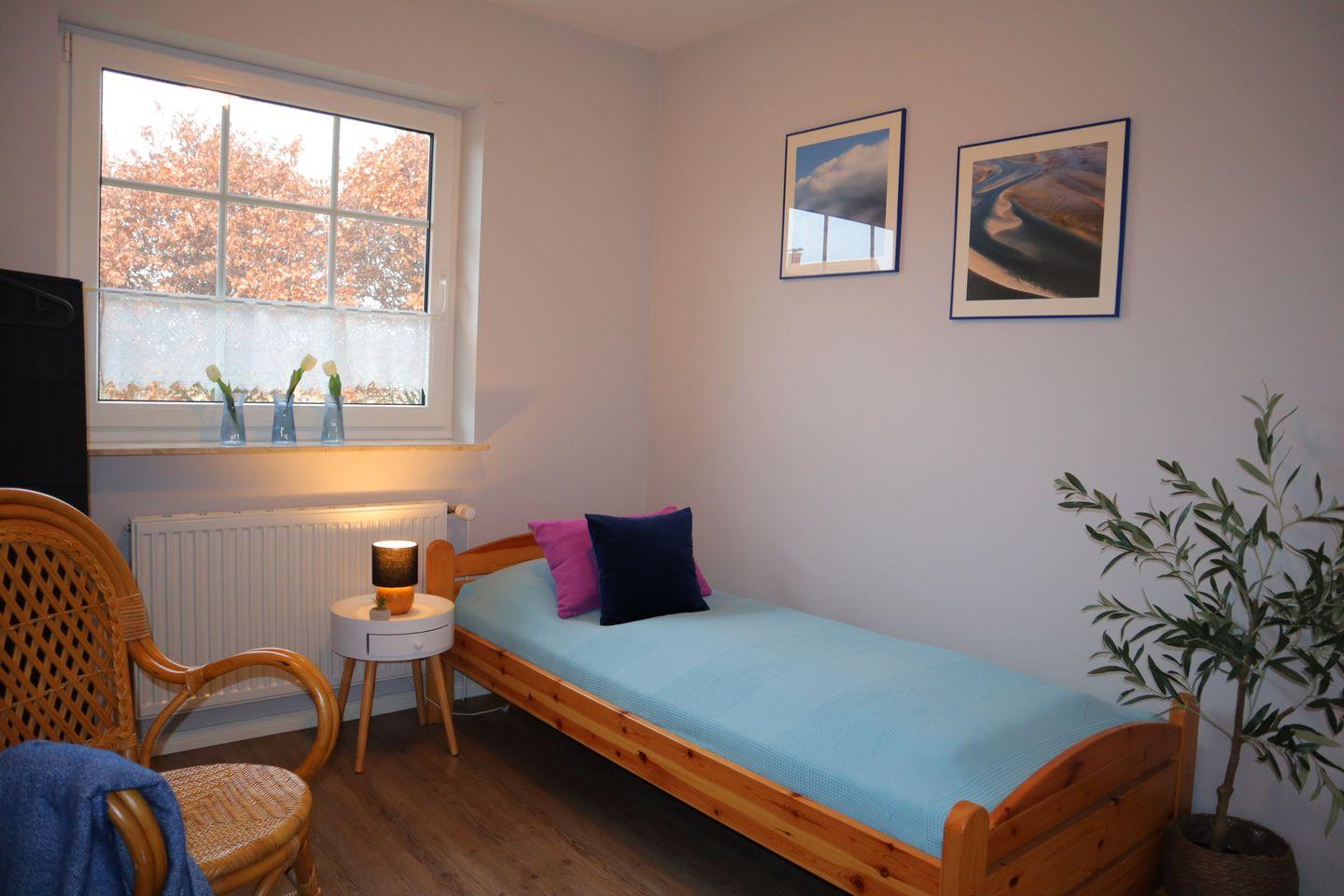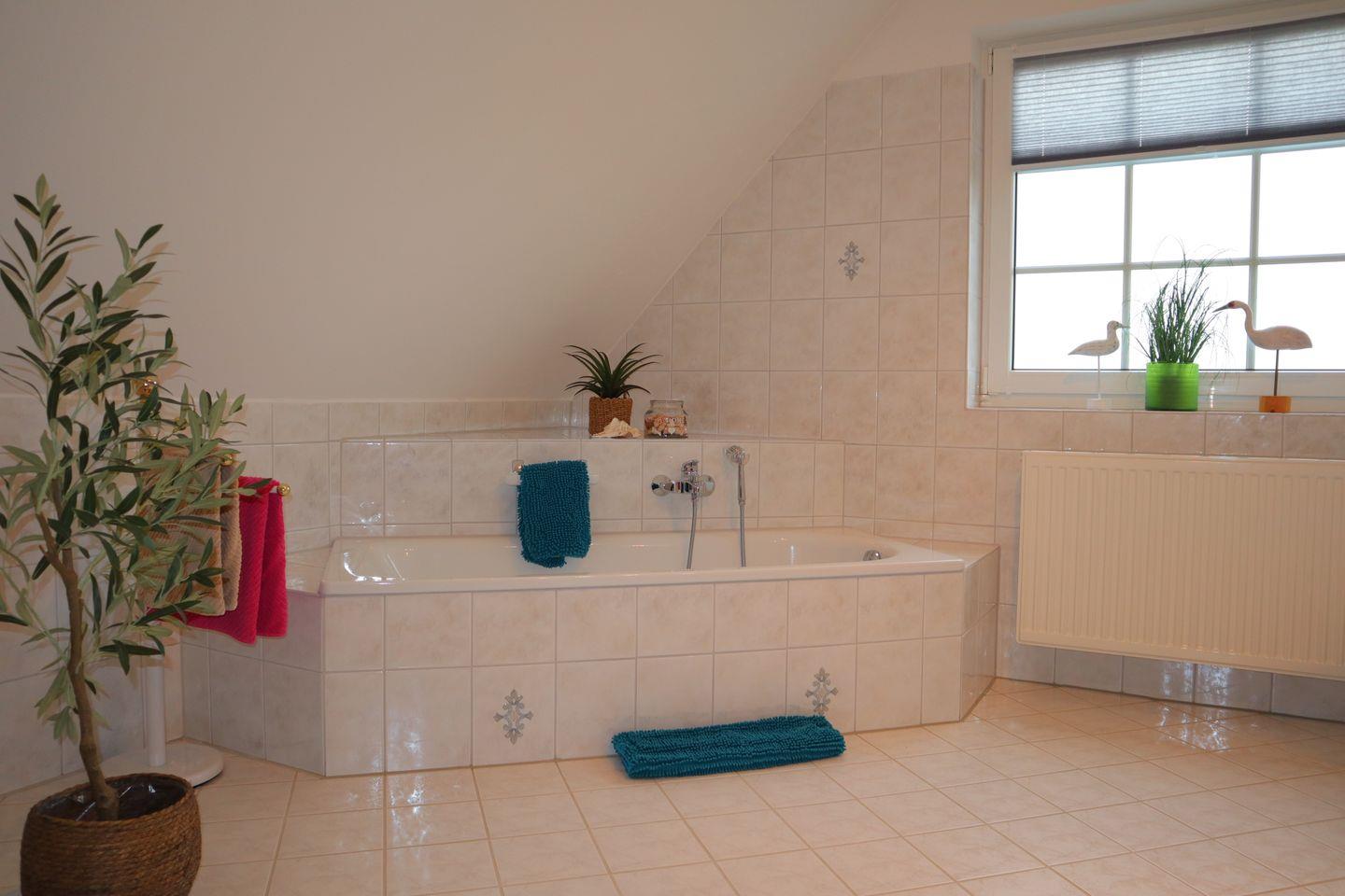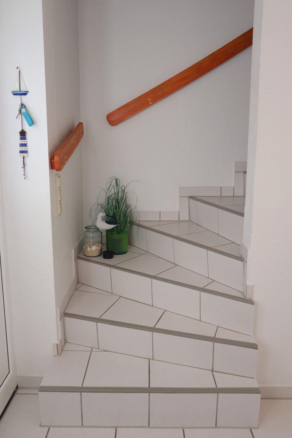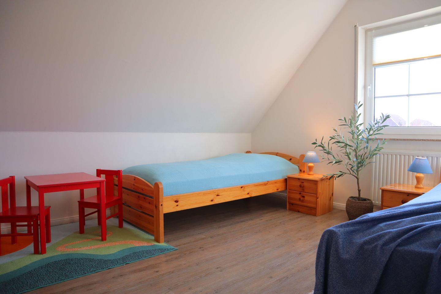 Im Obergeschoss befinden sich drei gemütliche Schlafzimmer, die als ruhige Rückzugsorte nach aktiven Tagen an der frischen Nordseeluft dienen. Ergänzt wird diese Etage durch ein großzügiges Badezimmer mit Badewanne, perfekt für entspannte Wohlfühlmomente, ein warmes Bad am Abend oder entspannte Familienroutinen.