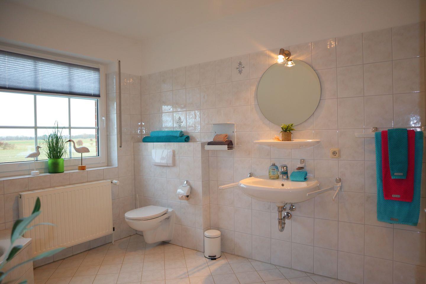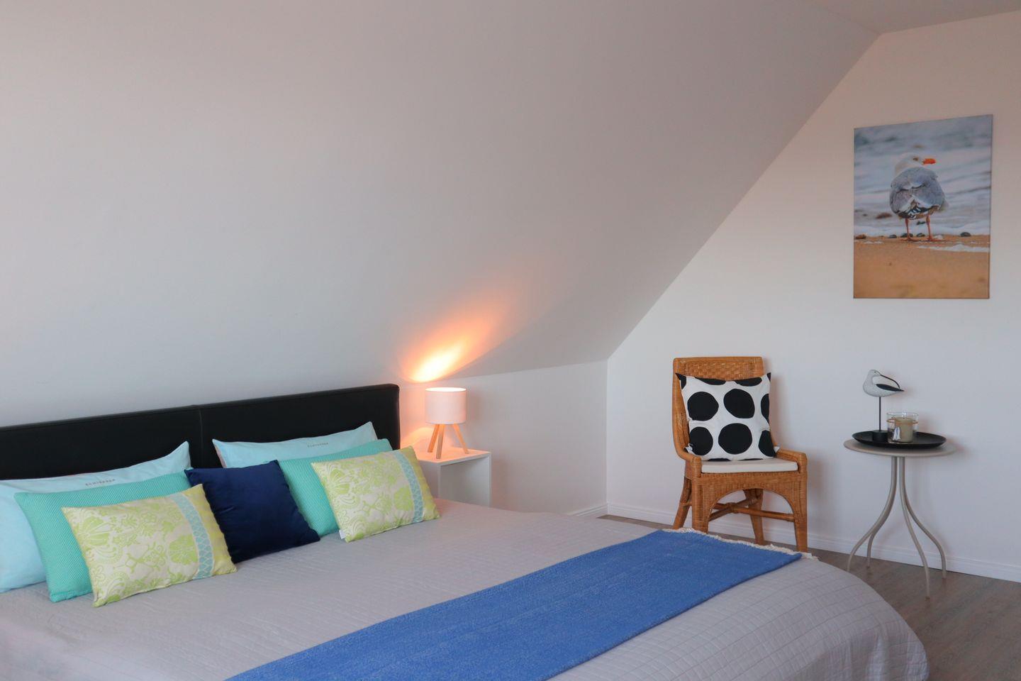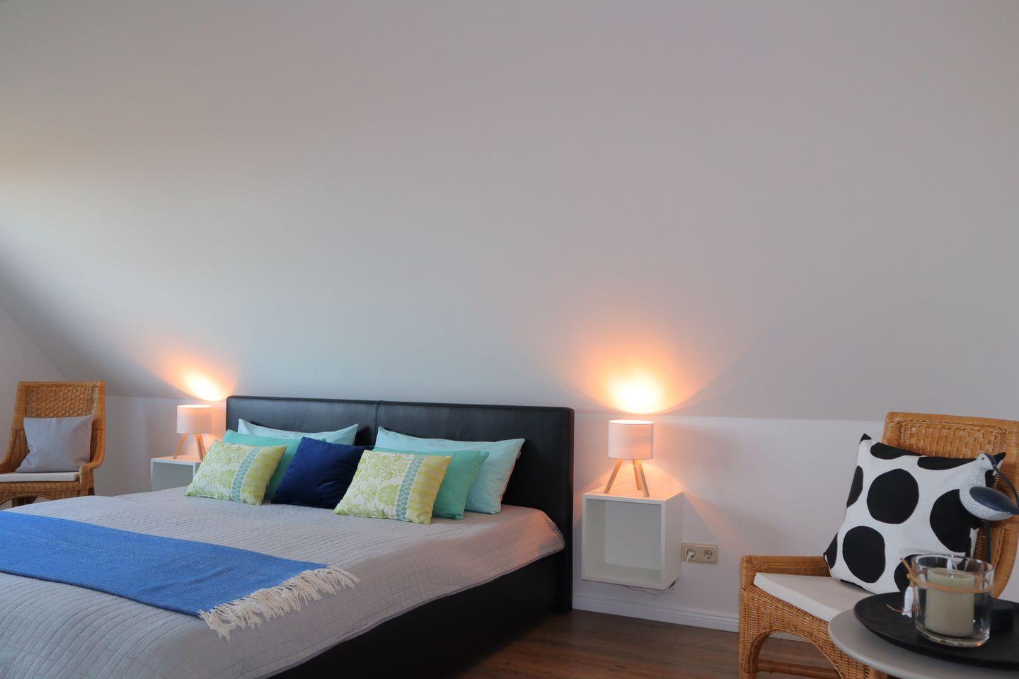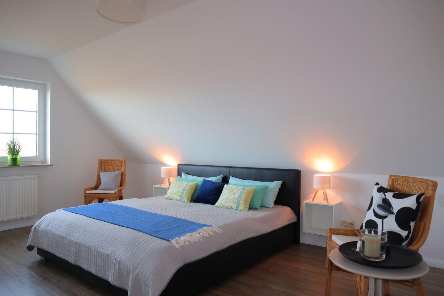 Im Obergeschoss befinden sich drei gemütliche Schlafzimmer, die als ruhige Rückzugsorte nach aktiven Tagen an der frischen Nordseeluft dienen. Ergänzt wird diese Etage durch ein großzügiges Badezimmer mit Badewanne, perfekt für entspannte Wohlfühlmomente, ein warmes Bad am Abend oder entspannte Familienroutinen.
