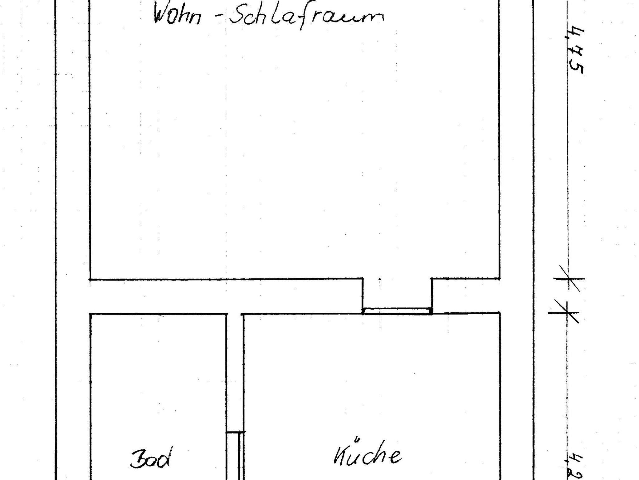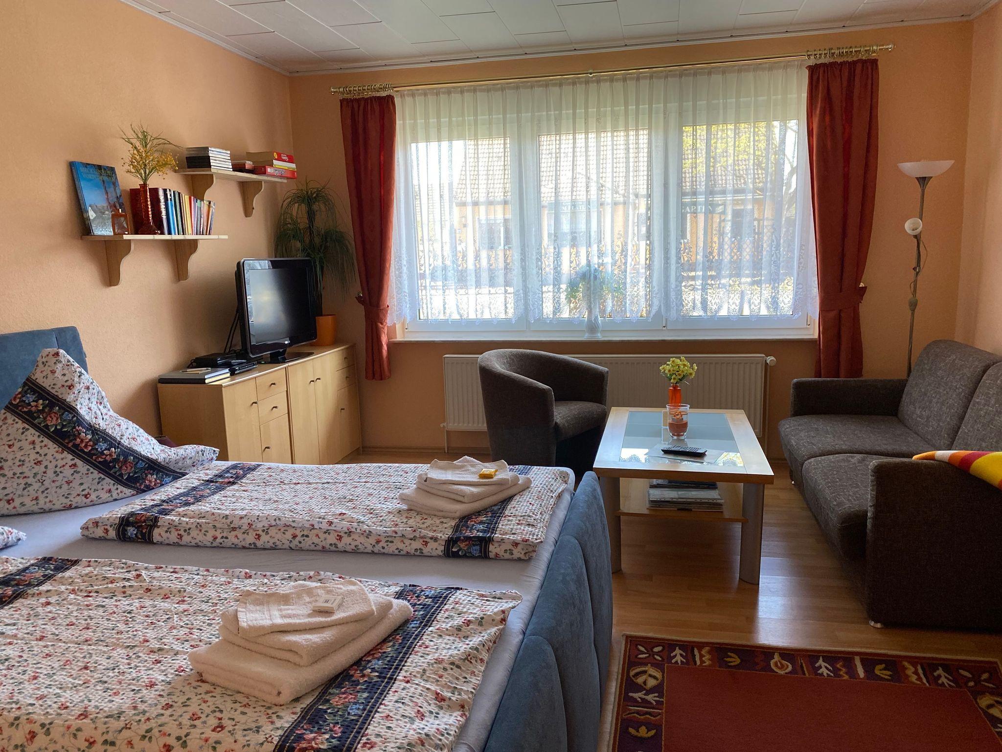 Es ist eine modern eingerichtete Ferienwohnung mit einem kombinierten Wohn- und Schlafraum, einer Einbauküche mit Essecke (Mikrowelle, Gefrierschrank, Kaffeemaschine, Toaster und Wasserkocher vorhanden).