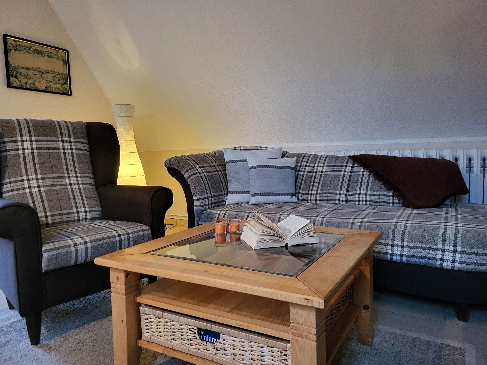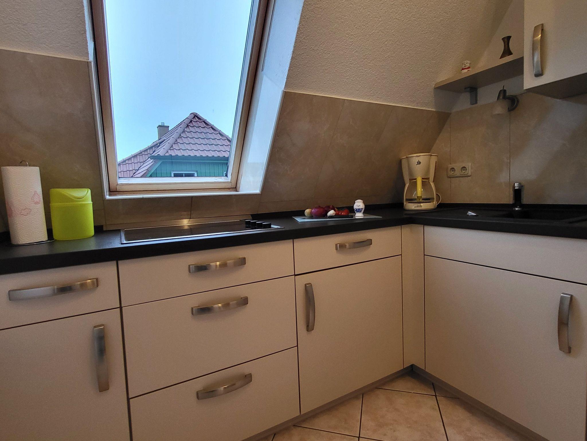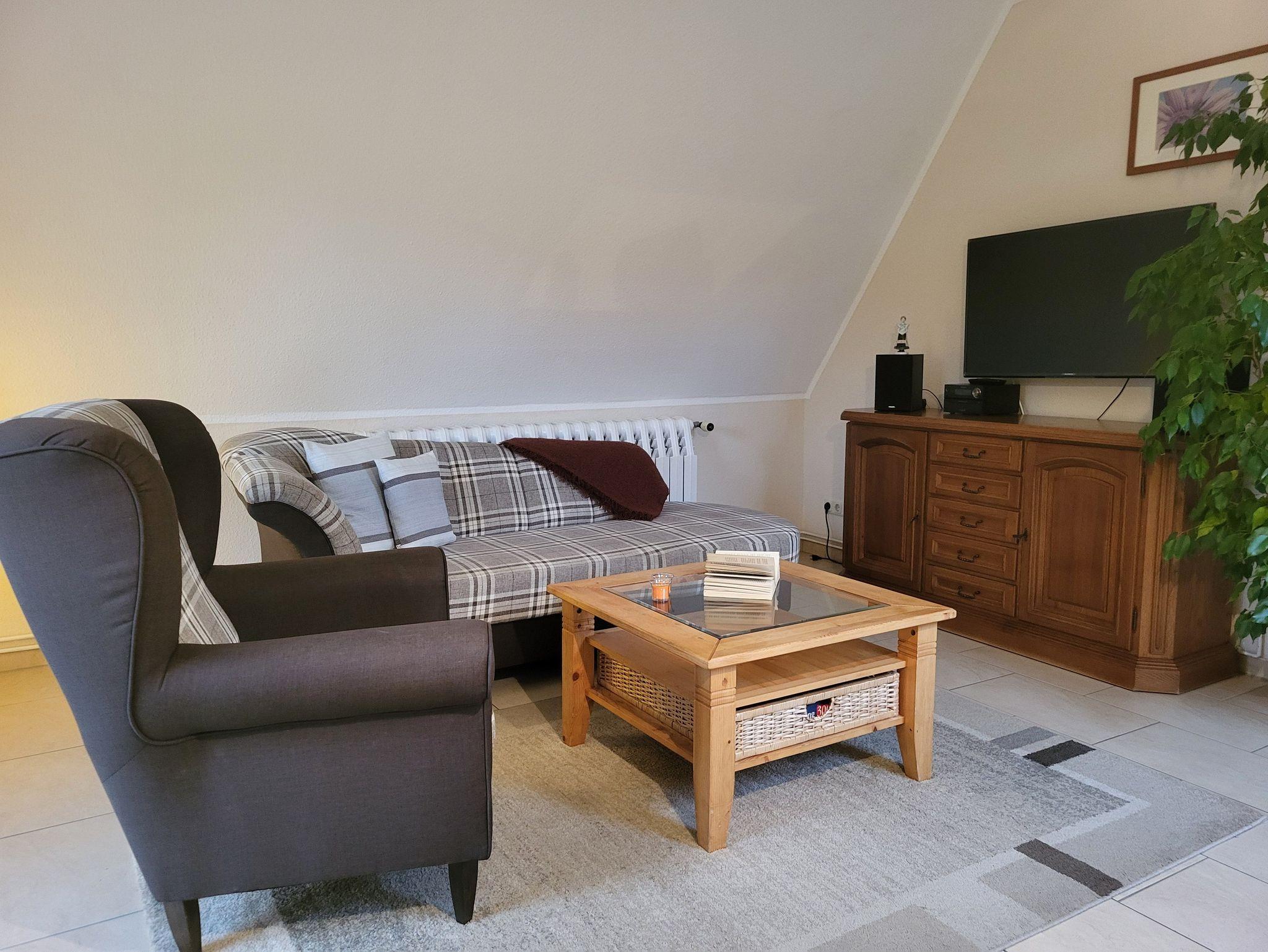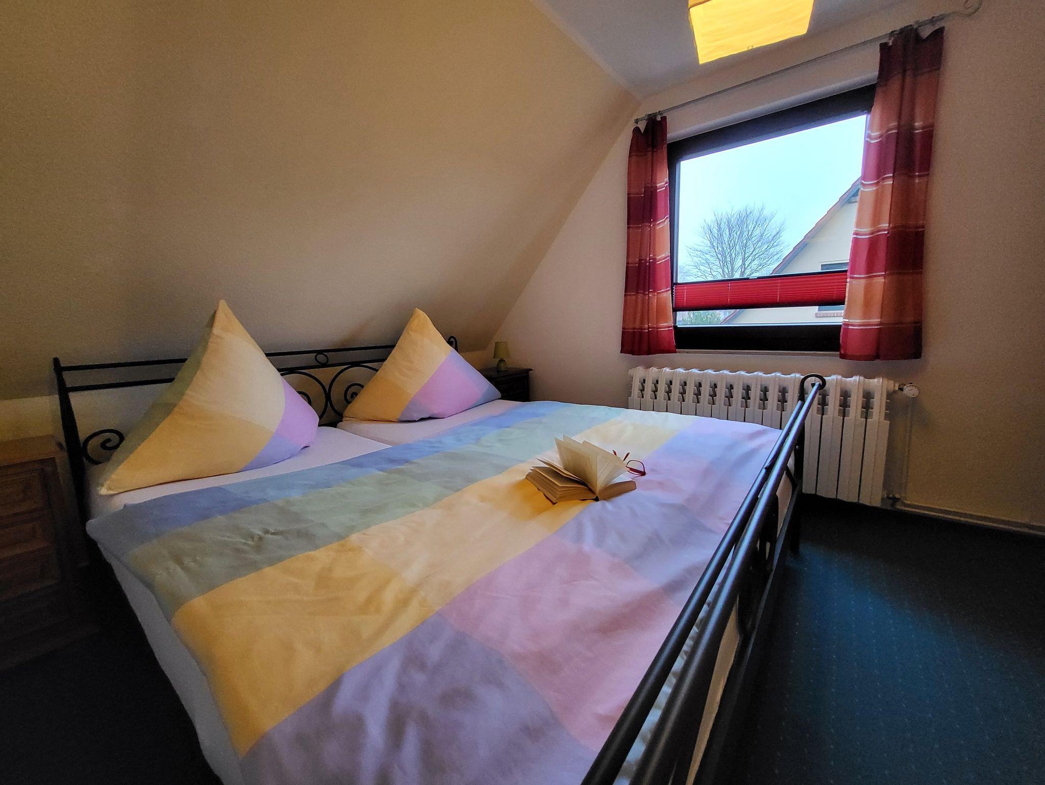 die gemütlich eingerichtete Ferienwohnung im Obergeschoss, gelegen in ruhiger Lage am Ortsrand, mit separatem Eingang und Zugang zur Dach-Terrasse die zum entspannen einlädt. Der feinsandige Strand ist etwa 250 m entfernt. Das Wohnzimmer verfügt über eine gemütliche Couch und SAT- TV, sowie einen Essplatz. Im Schlafzimmer steht ein Doppelbett 1,80 x 2,00 m ( getrennte Matratzen ) bereit. In der Küchenzeile finden Sie ein Cerankochfeld mit 4- Platten, eine Mikrowelle und einen Kühlschrank. Im Bad mit gibt es eine Badewanne. Unsere Wohnung ist eine Nichtraucherwohnung. Das Schlafzimmer und Bad ist mit Mückenschutz ausgestattet. Die Bettwäsche ist inklusive, Handtücher können Sie in der Zimmervermittlung zubuchen für 7,00 € pro Person (1 Badetuch, 1 Handtuch). Ein Parkplatz befindet sich auf dem Grundstück.