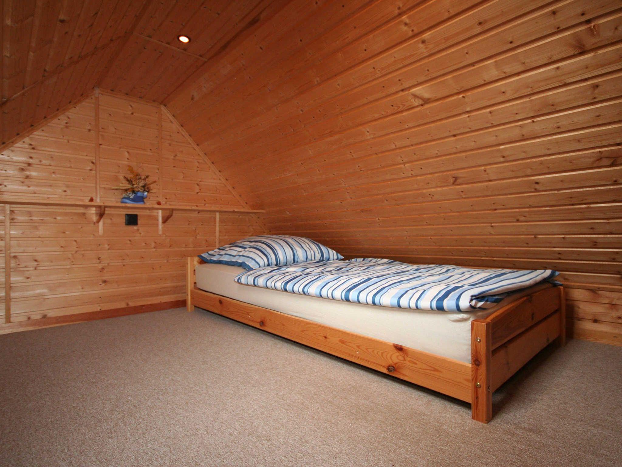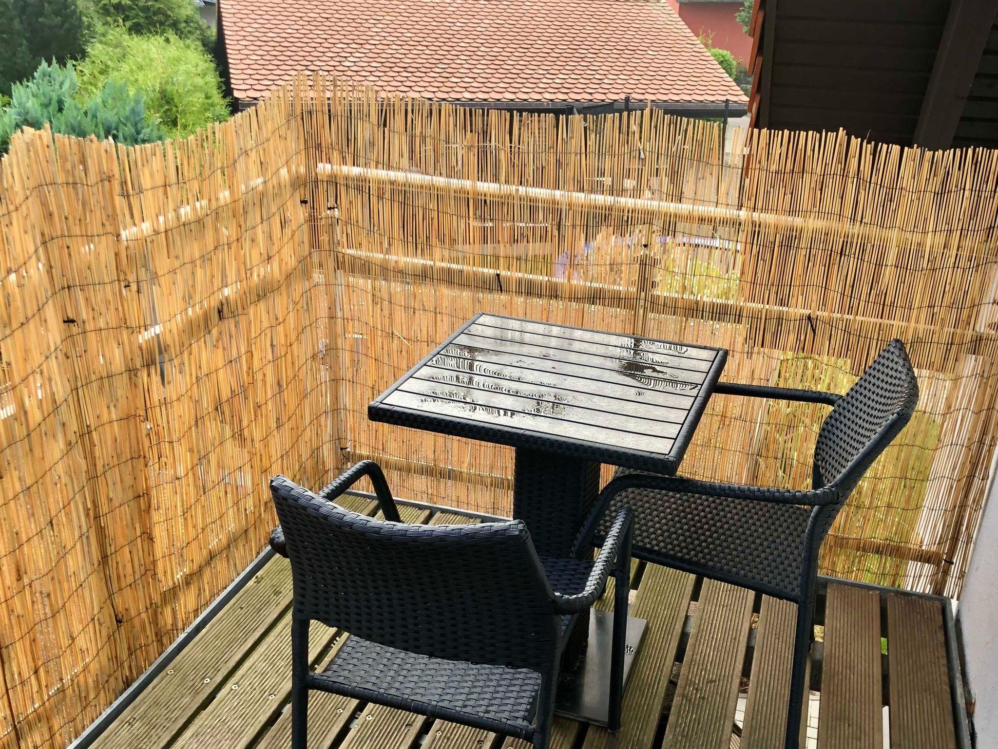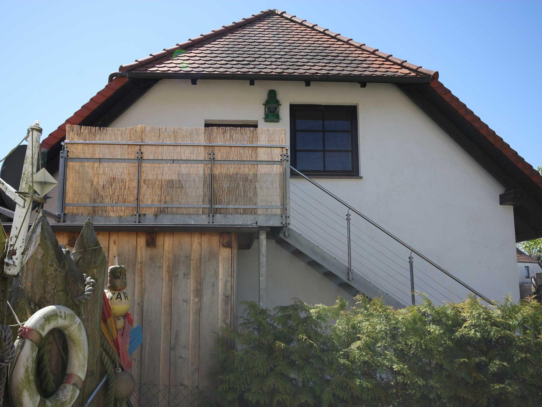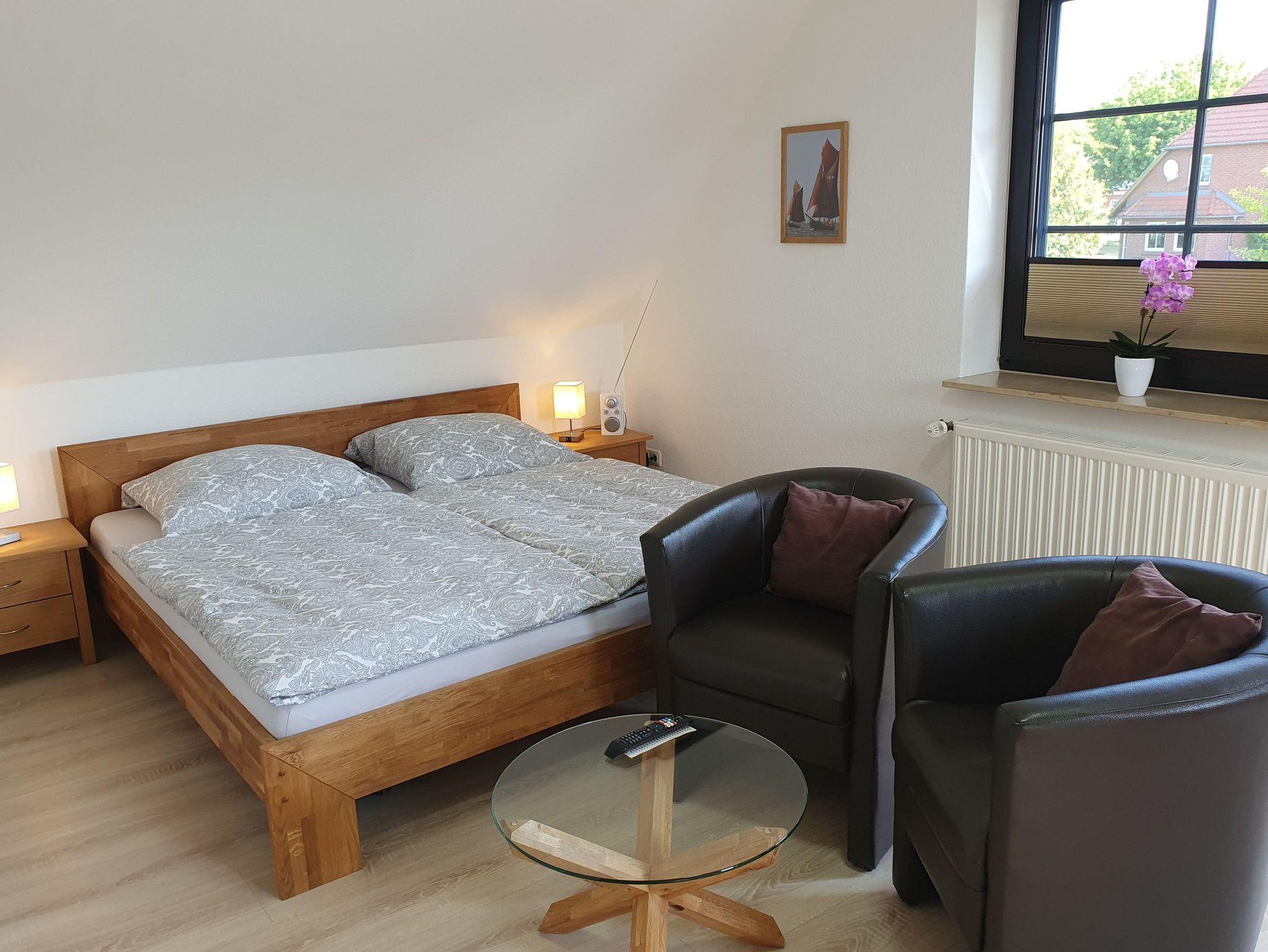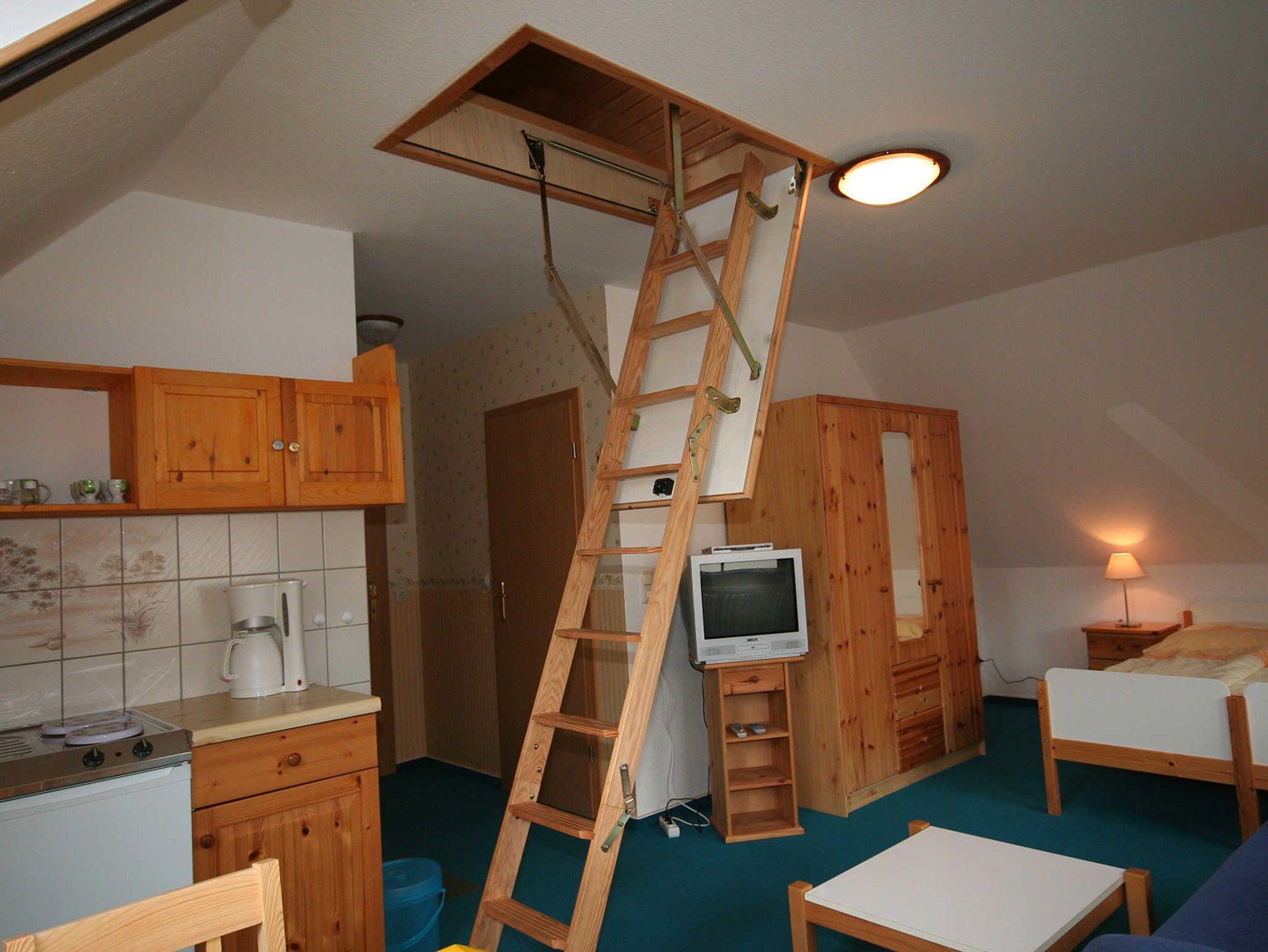 schönes Appartement in der 1. Etage für 2 Personen mit separatem Eingang über die Außentreppe erreichbar. Hier befindet sich auch der kleine Balkon Westausrichtung mit einer Sitzgelegenheit. Das Wohn- Schlafzimmer ist ausgestattet mit einem Doppelbett 1,80 x 2,00 m (getrennte Matratze). 2 Aufbettungen im Schlafboden/ Dachgeschoss (genannt Nest - 6 qm) sind möglich, erreichbar mittels einer Klappleiter, daher