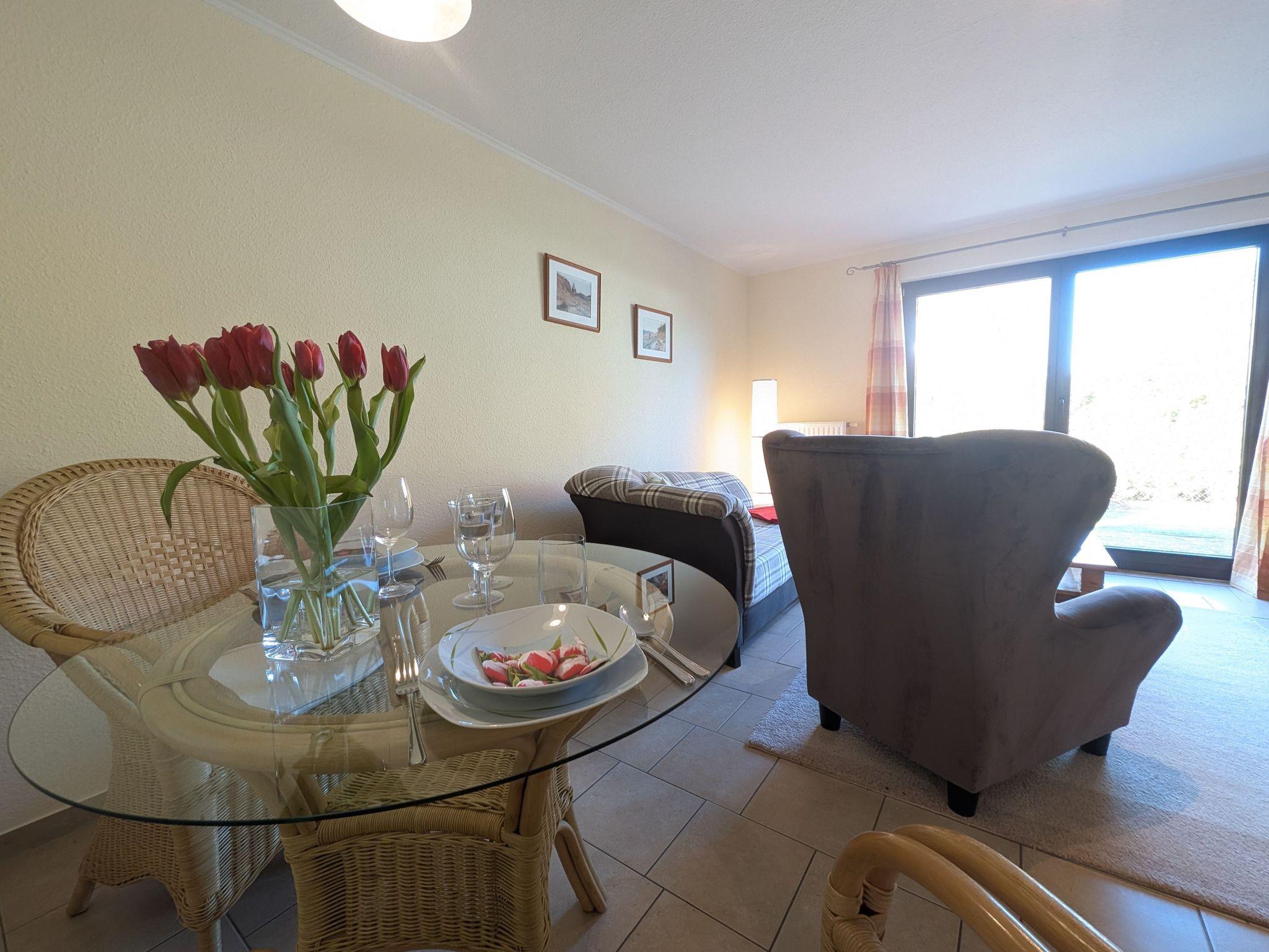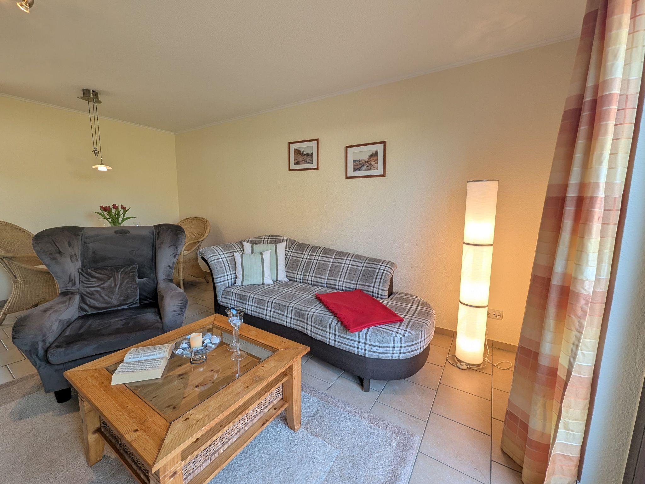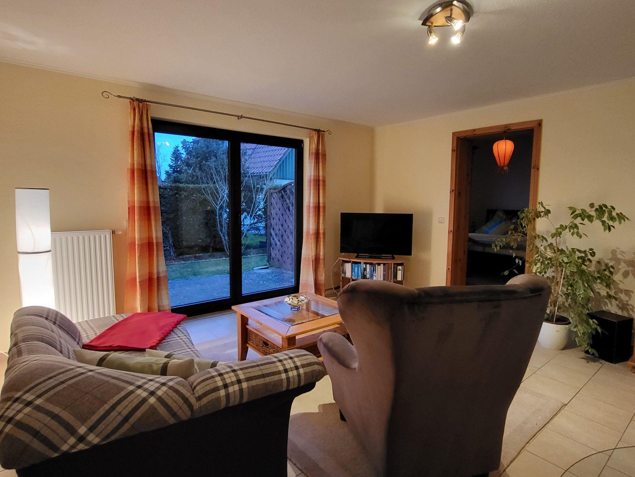 die modern und gemütlich eingerichtete Ferienwohnung im Erdgeschoss, gelegen in ruhiger Lage am Ortsrand, mit separatem Eingang und Zugang zur Terrasse die zum entspannen einlädt., Der feinsandige Strand ist etwa 250 m entfernt. Das Wohnzimmer verfügt über eine Fußbodenheizung, eine gemütliche Couch und SAT- TV, sowie einen Essplatz. Im Schlafzimmer steht ein Doppelbett 1,80 x 2,00 m ( getrennte Matratzen ) bereit. In der Küchenzeile, finden Sie ein Cerankochfeld mit 4- Platten, eine Mikrowelle und einen Kühlschrank. Im Bad gibt es eine bodengleiche Dusche. Unsere Wohnung ist eine Nichtraucherwohnung. Das Schlafzimmer ist mit Mückenschutz ausgestattet. Die Bettwäsche ist inclusive, Handtücher können Sie in der Zimmervermittlung zubuchen für 7,00 € pro Person (1 Badetuch, 1 Handtuch). Ein Parkplatz befindet sich auf dem Grundstück.