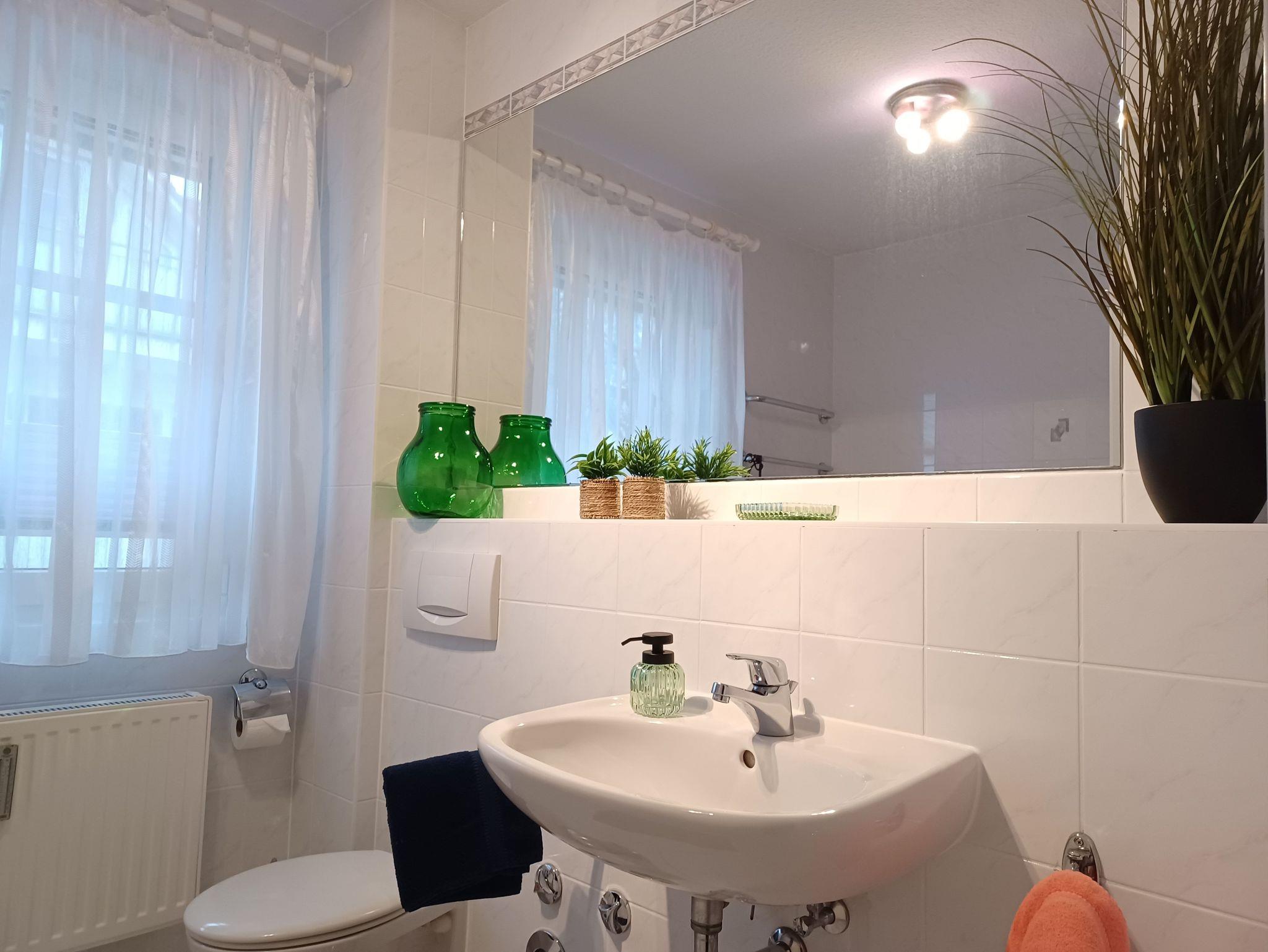 Das Badezimmer ist ausgestattet mit einer Badewanne, Waschmaschine und Fön. Ein Bügeleisen und Bügelbrett sind ebenfalls vorhanden.