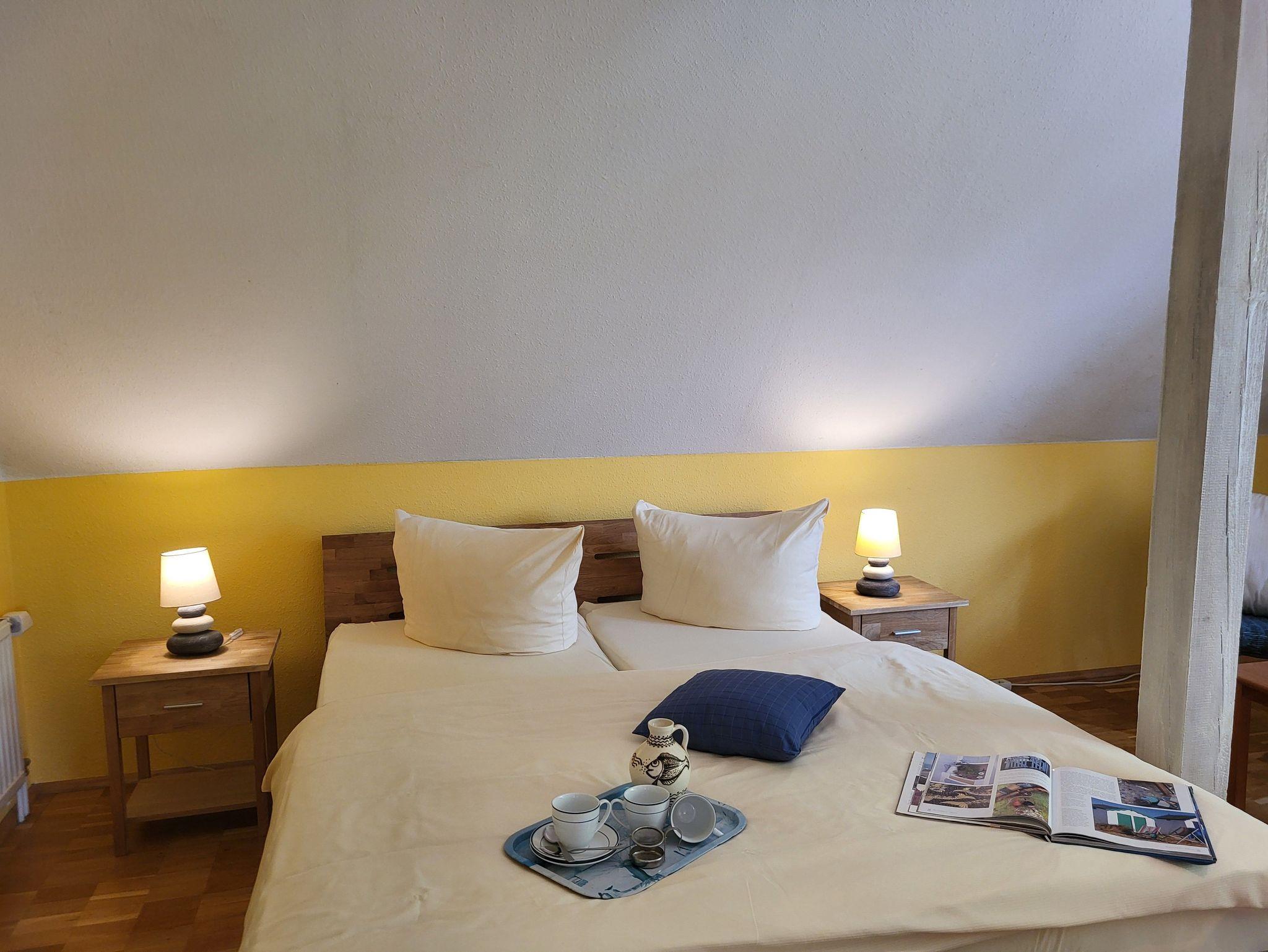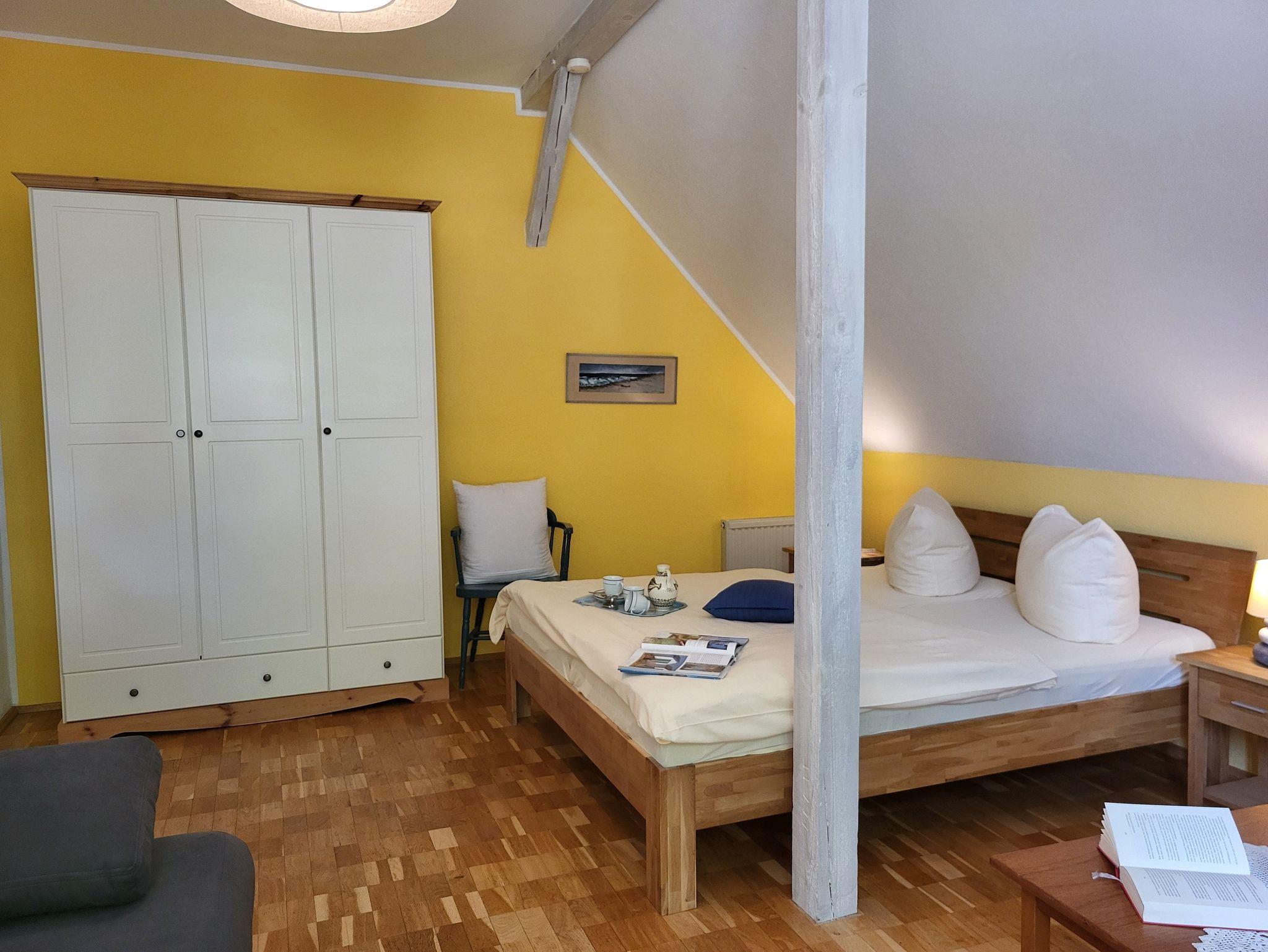 in der gemütlichen 2-Zimmer-Ferienwohnung unterm Rohrdach, mit Blick auf den beschaulichen Boddenhafen. Hier finden Sie Erholung pur - beim Baden, am Strand, im Ort oder in der einzigartigen Landschaft und Natur. Die Halbinsel verengt sich in Wustrow zu einem schmalen Streifen. Den feinsandigen Ostseestrand oder die Strandstraße mit der Seebrücke erreichen Sie von der Pfarrscheune aus in wenigen Minuten zu Fuß. Ebenso schnell gelangen Sie zu den weitläufigen Wiesen am Bodden mit traumhaften Ausblicken über Wasser und Land. Direkt vor Ihrer Haustür liegt die Neue Straße, die wohl schönste Straße Wustrows, mit historischen Schiffer- und Kapitänshäusern. Ihre Ferienwohnung ist individuell und geschmackvoll eingerichtet. Sie eignet sich ideal für zwei Personen. Das gemütliche Wohnzimmer ist mit einer Couch, SAT-TV, kostenlosem WLAN und einem offenen Essplatz ausgestattet. Im Schafzimmer stehen für Sie ein Doppelbett (1,80 x 2,00 m, getrennte Matratzen) und eine bequeme Schlafcouch für eine zusätzliche Aufbettung (10,00 pro Nacht) bereit. Die Bettwäsche ist inklusive, Handtücher können Sie in der Zimmervermittlung für 7,00 pro Person (1 Badetuch, 1 Handtuch) buchen. Die Küche ist mit ausreichend Küchenutensilien ausgestattet. Für Ihr Wohlbefinden bietet die Wohnung ein helles Bad mit Fenster und Dusche und WC. Im Interesse aller Gäste bitten wir Sie in der Wohnung nicht zu rauchen. Haustiere sind nach Absprache willkommen. Ihr PKW findet Platz auf Ihrem Stellplatz direkt vor dem Haus. Die Wohnung verfügt über keine private Lademöglichkeit für Elektroautos oder -fahrräder. Die nächstgelegene Ladesäule für Elektroautos finden Sie jedoch nur wenige Schritte von der Wohnung entfernt am Hafen. Elektrofahrräder können Sie an verschiedenen Stellen im Ort laden. Bitte beachten Sie, dass Sie für jegliche, durch unberechtigtes Laden von Elektroautos oder -Fahrädern an einem Hausanschluss entstehenden Schäden haften.