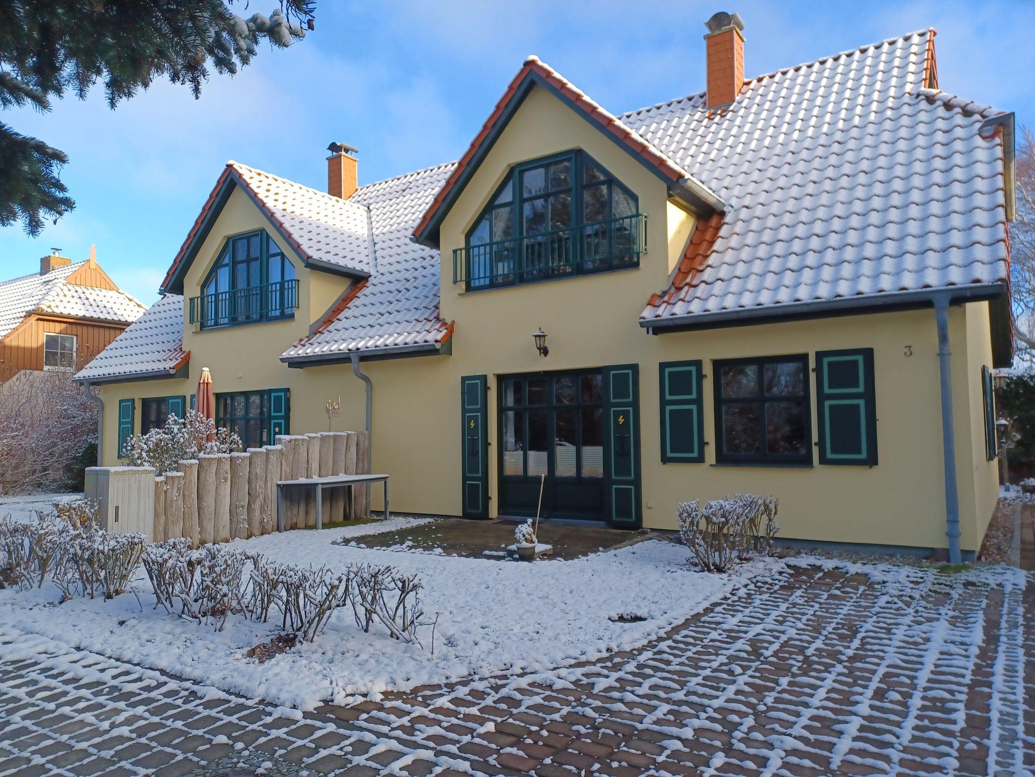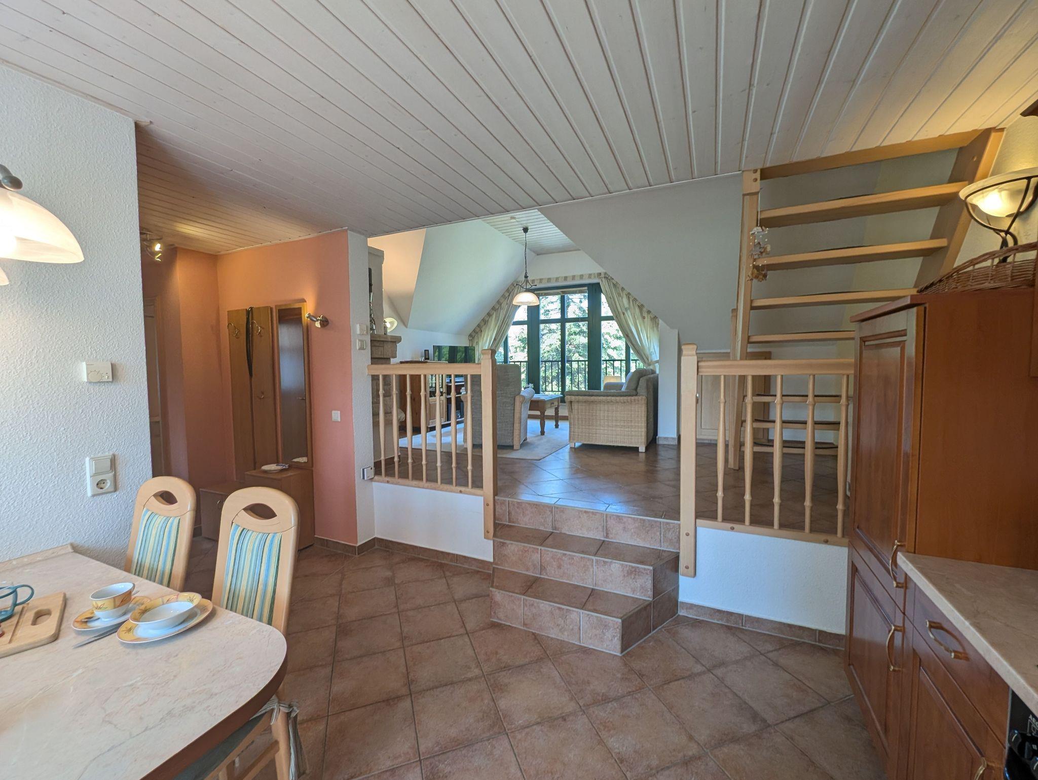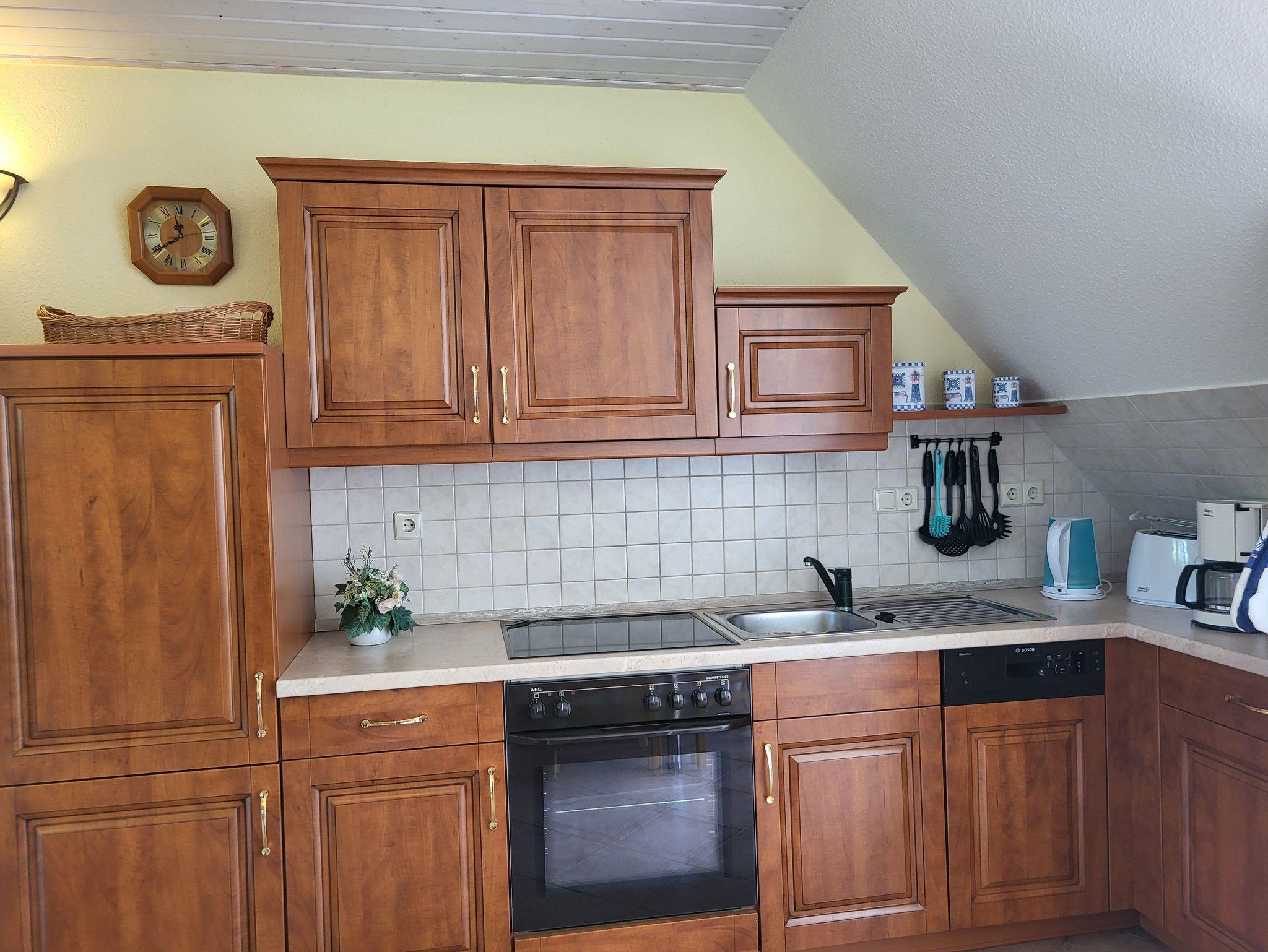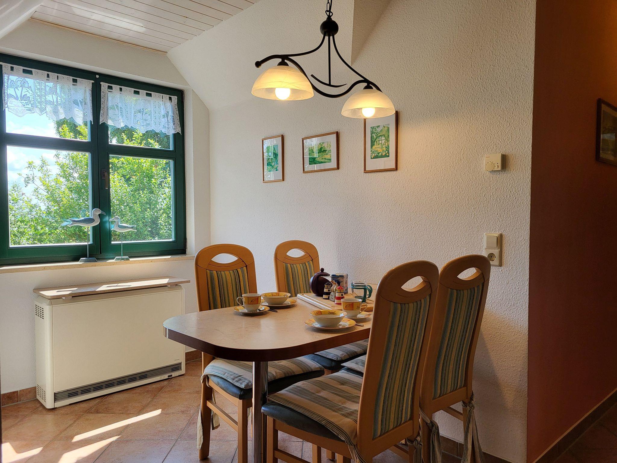 Die Ferienwohnung im Obergeschoss einer Doppelhaushälfte liegt direkt am Deich mit Strandzugang. Der Sitzplatz im Garten lädt zum gemütlichen Entspannen ein. Durch die helle Einrichtung wirkt die Wohnung gemütlich und einladend. Das Wohnzimmer mit hellgrauen Korbmöbeln ist durch einen französischen Balkon vom Küchenbereich mit Essplatz abgegrenzt. Die Küche verfügt über ein Cerankochfeld, Backofen, Kaffeemaschine, Toaster, Geschirrspüler und Kühlschrank. Im Schlafzimmer befindet sich ein Doppelbett mit den Maßen 1,80 x 2,00 m (getrennte Matratze). Die Schlafgalerie unter dem Dach ist nicht abschließbar (Stehhöhe 1,65 m). und bietet Platz für 2 weitere Personen.