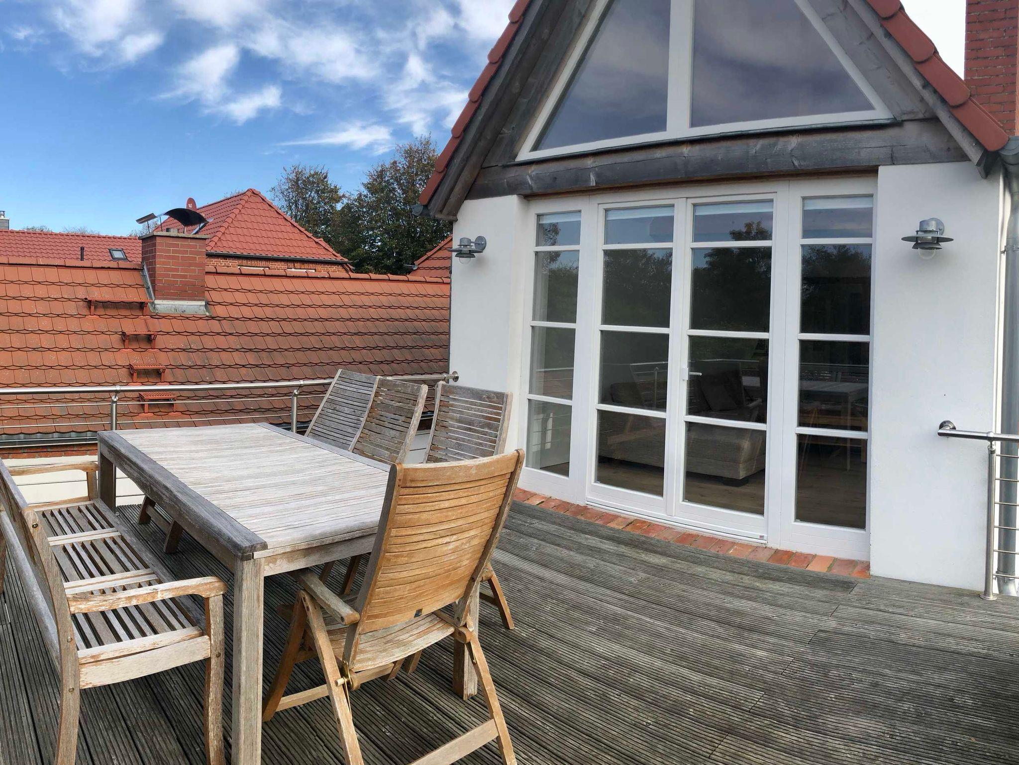 die hochwertig sanierte Ferienwohnung befindet sich im Dachgeschoss des denkmalgeschützten Kapitänshauses in zentraler, ruhiger Lage im Ostseebad Wustrow. Aus dem kombinierten Wohnbereich mit offener Küche haben Sie einen einzigartigen Blick in den wunderschön alt gewachsenen Garten. Die Ferienwohnung verfügt über einen großen Balkon ca. 15 m². Ein mit Morgensonne durchflutetes Foyer der Lese- und Schreibplatz lädt Sie zum Verweilen ein. Für die Nachtruhe stehen ein Schlafzimmer mit Doppelbett 180 x 200 cm, sowie ein weiteres Schlafzimmer mit 2 Einzelbetten (erweiterbar auf 1 Doppelbett) 0,90 x 2,00 cm zur Verfügung. Zudem gibt es einen begehbaren Kleiderschrank sowie ein großes Duschbad. Den Parkplatz bitte rechts auf dem Grundstück nutzen. WLAN ist für unsere Gäste kostenlos, Die Wohnung wird mit Bettwäsche und Handtücher (jeweils pro Person 1 Badehandtuch und ein kleines Handtuch) übergeben..