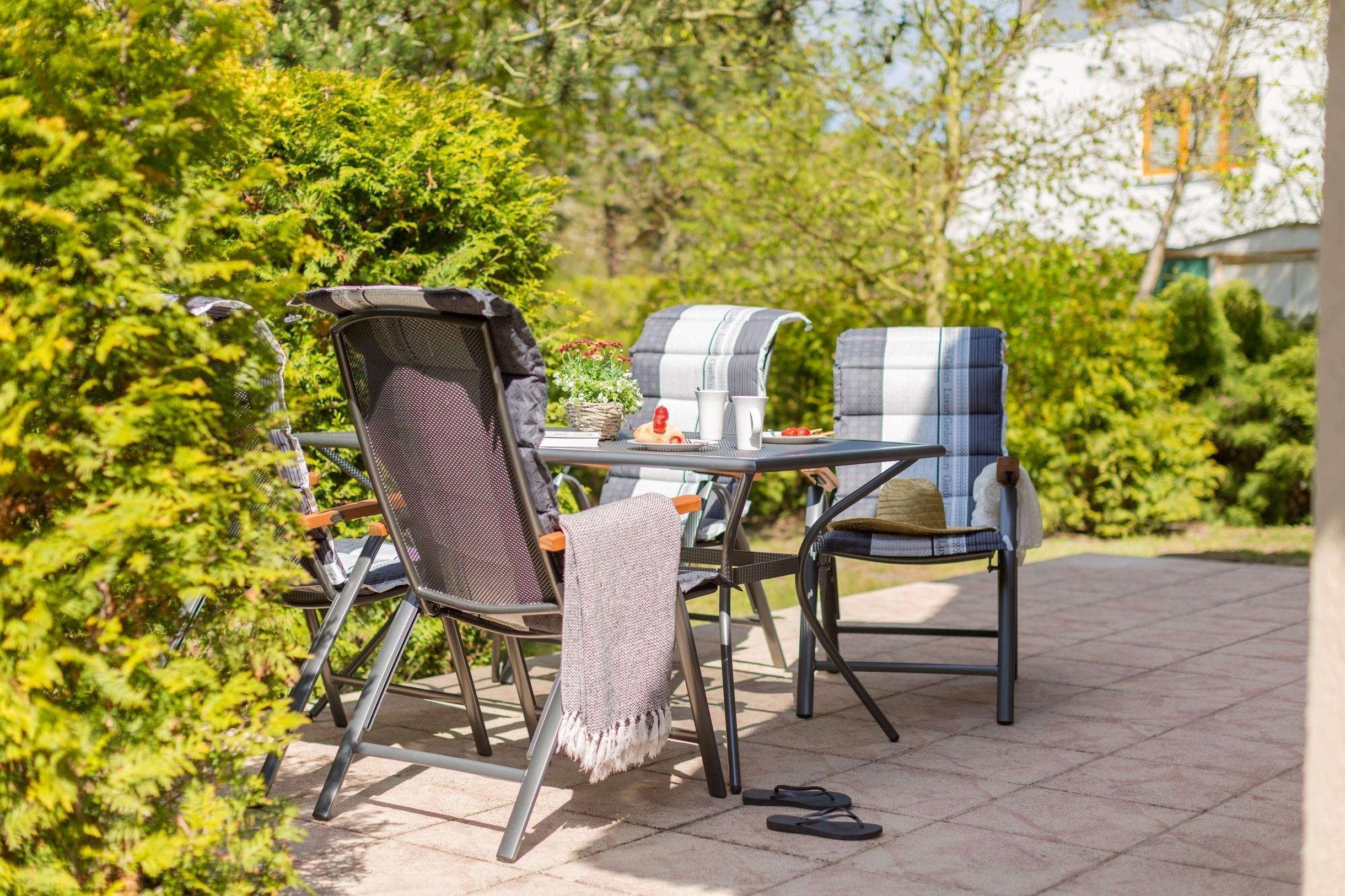 Das Ferienhaus besitzt je Haushälfte eine Terrasse mit Gartenmöbeln und einem kleinen Garten.