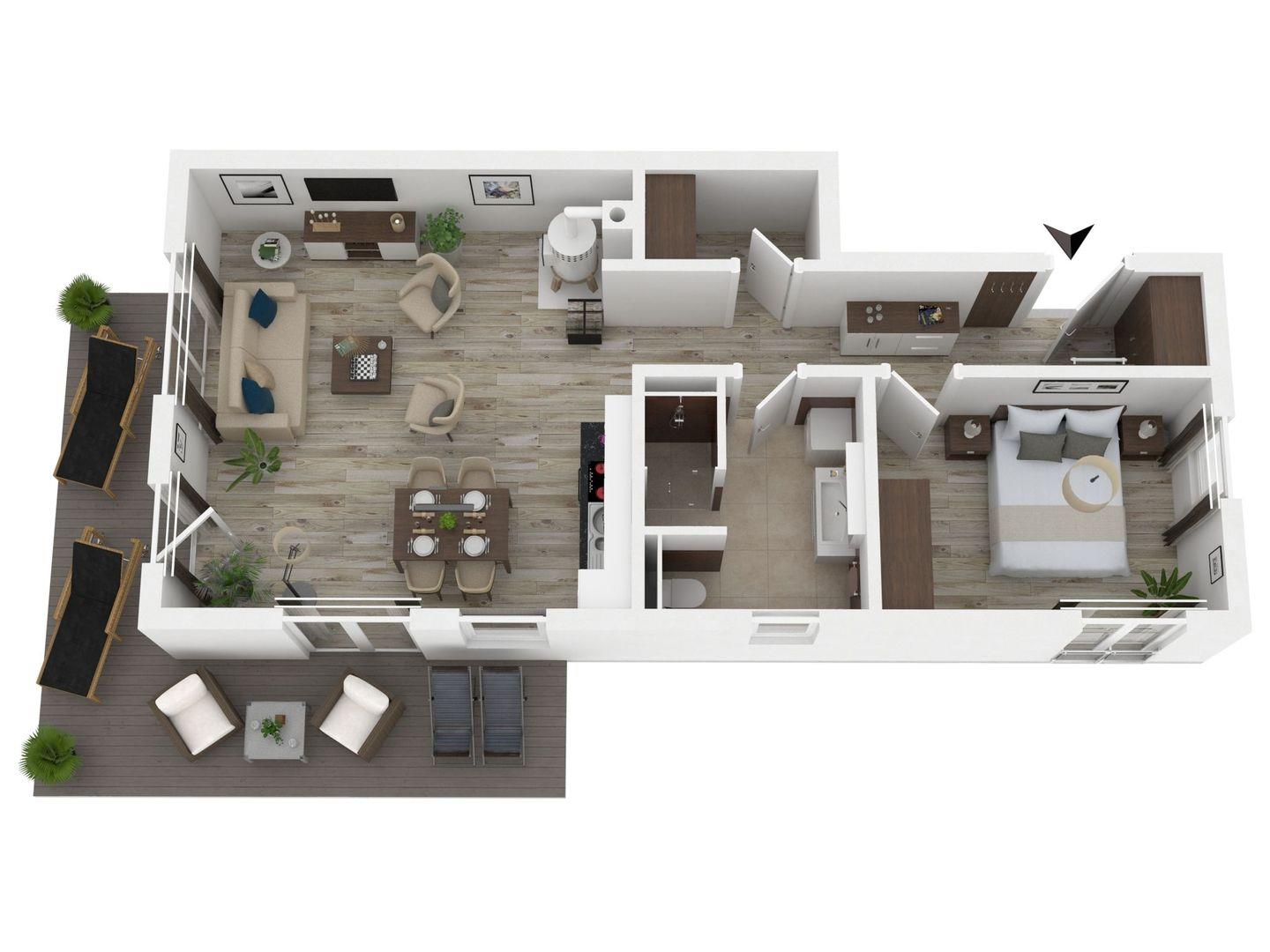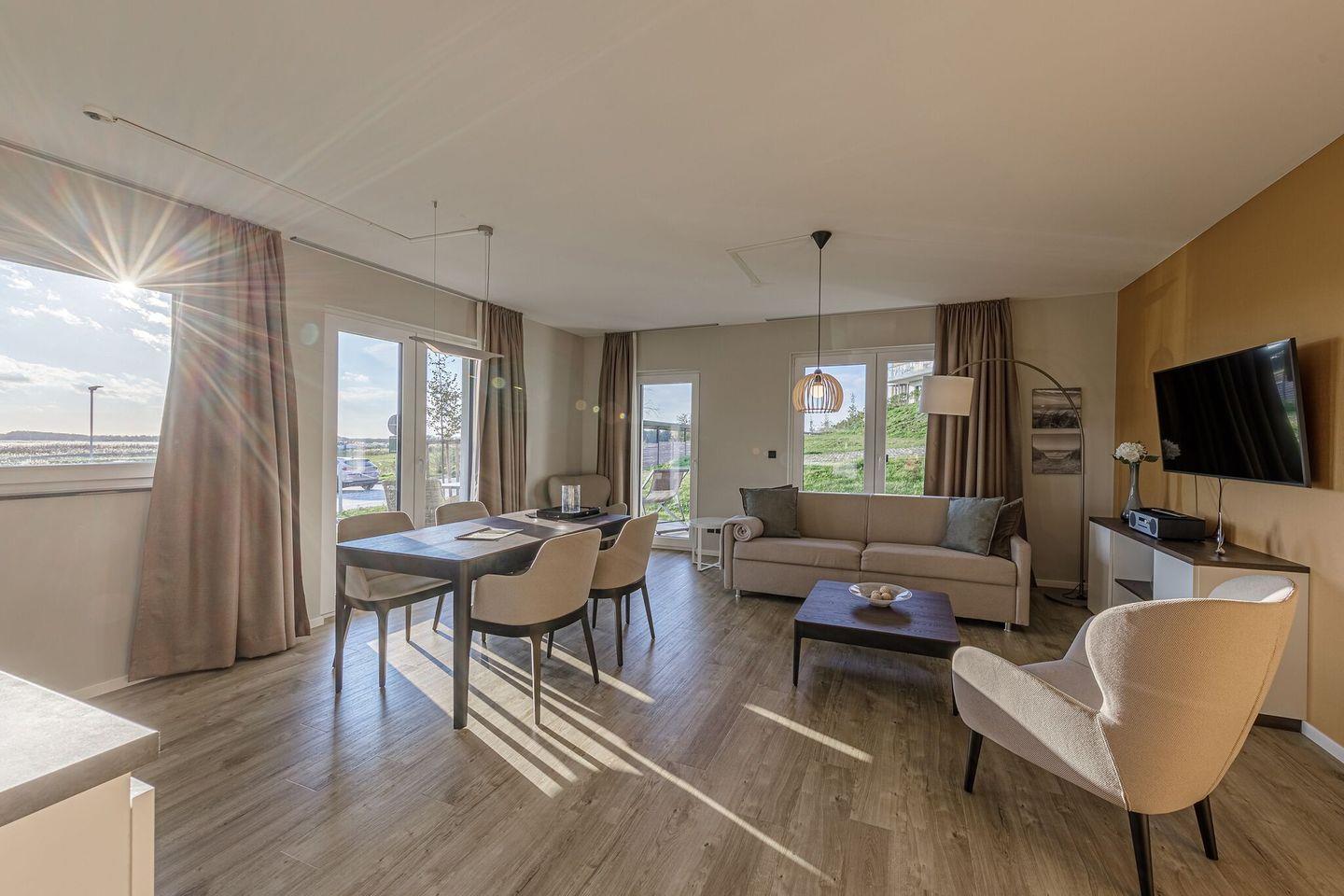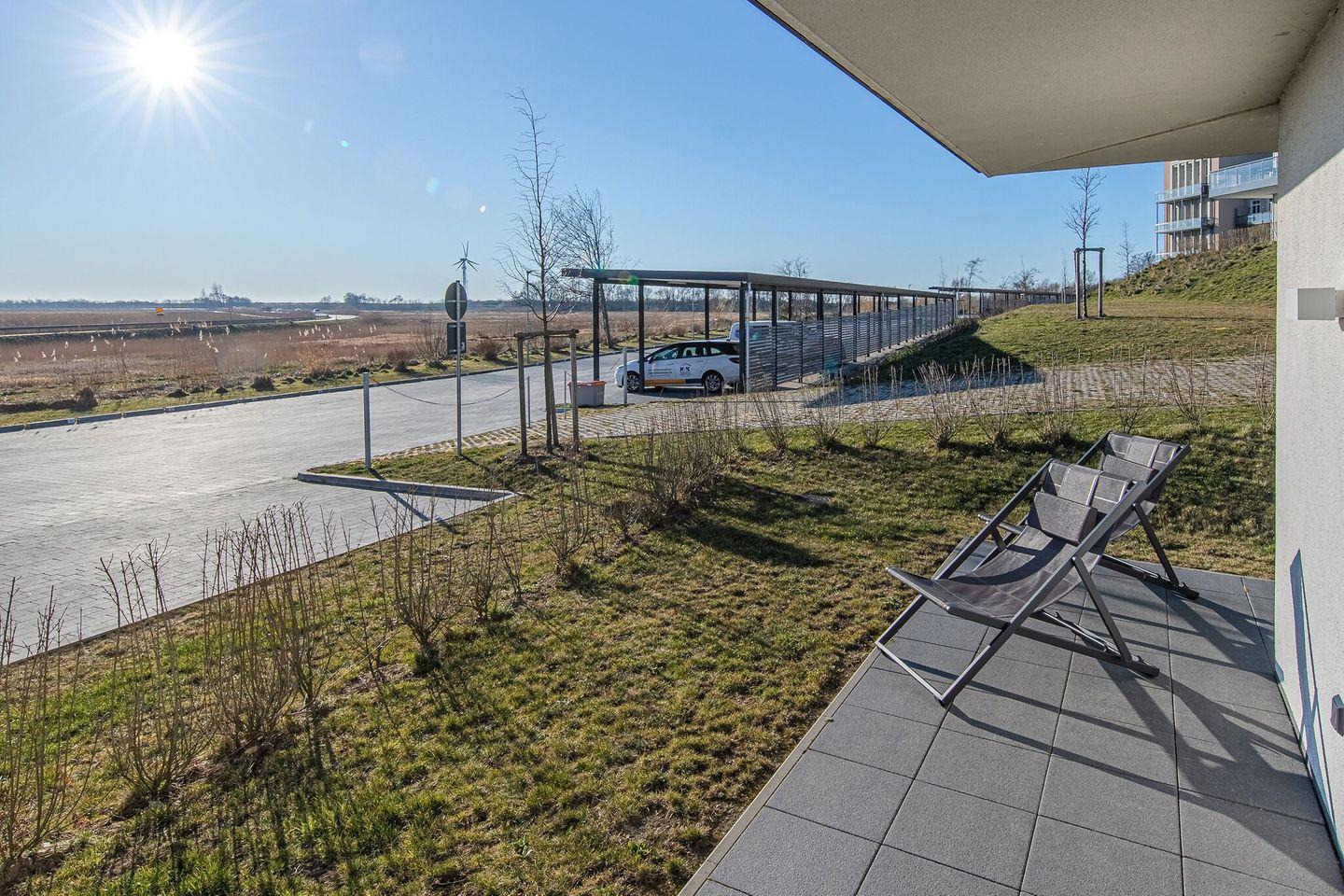 Die Wohnung erstreckt sich über 66 m² und bietet Platz für bis zu vier Personen. Sie umfasst ein gemütliches Schlafzimmer sowie ein einladendes Wohnzimmer, das dank der großen Fenster hell und freundlich wirkt. Der offene Küchenbereich ist mit modernen Geräten wie einem Induktionsherd, Backofen, Kühlschrank und Geschirrspüler ausgestattet. Hier können Sie Ihre Lieblingsgerichte zubereiten und gemeinsam am Esstisch genießen. Die angrenzende Sofaecke lädt dazu ein, nach einem langen Strandtag zu entspannen und die Zeit nach dem Essen beim Fernsehen oder Spielen zu verbringen. Ein Kaminofen sorgt in den kühleren Monaten für eine behagliche Atmosphäre.