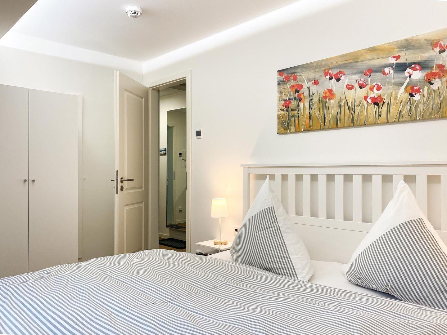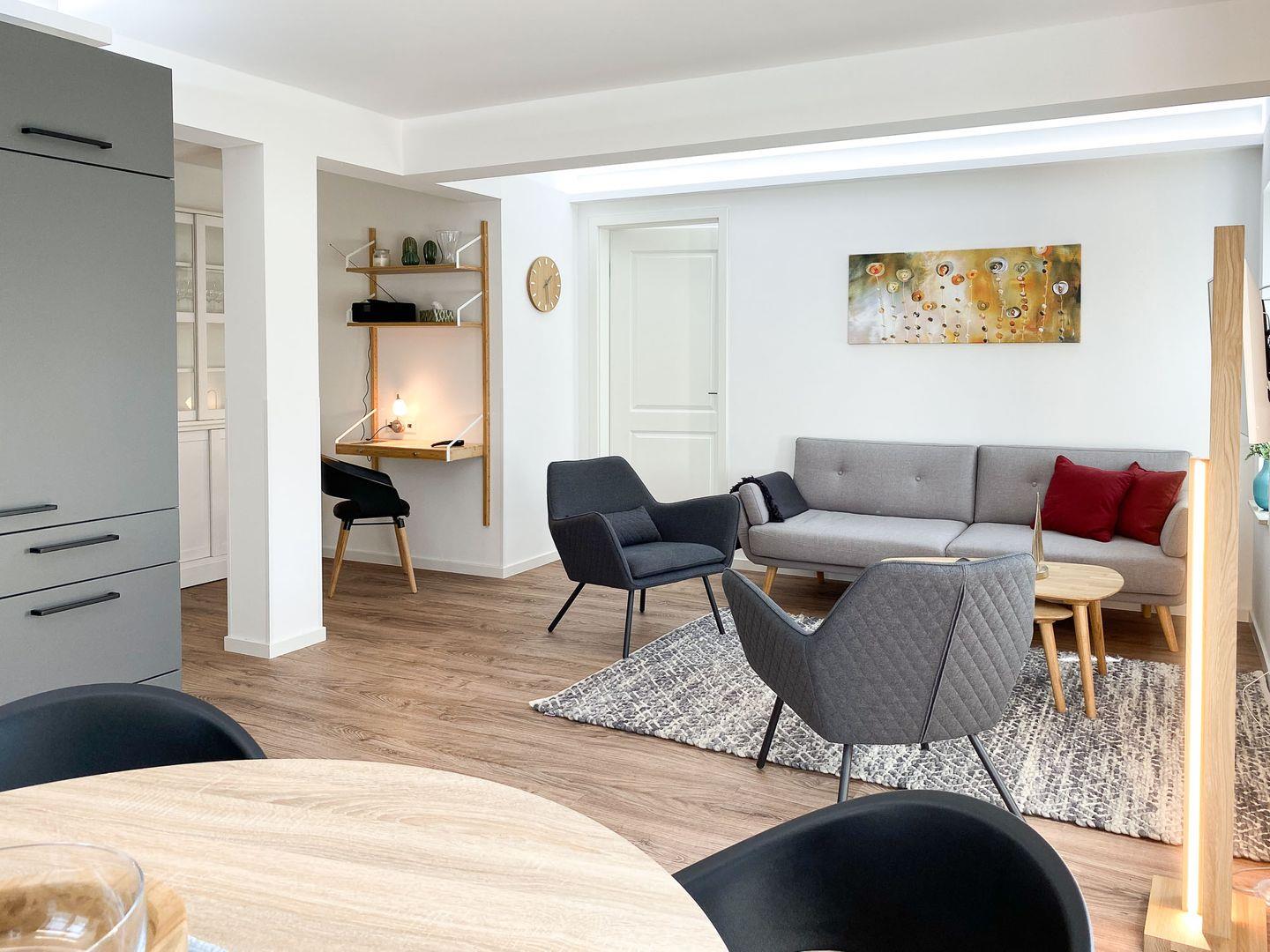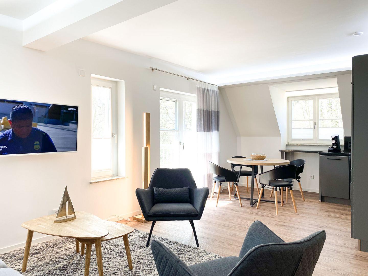 In dieser charmanten 72 m² großen Oase im 1. Obergeschoss, die bis zu vier Personen bequem beherbergen kann, finden Sie einen perfekten Rückzugsort vom Alltag. Betritt man die Wohnung, wird man sofort vom warmen, einladenden Wohnbereich umarmt. Es ist ein Raum, der zum Verweilen einlädt, mit bequemen Sitzgelegenheiten, die ideal sind, um sich nach einem Tag voller Entdeckungen zu entspannen. Die geschmackvoll ausgestattete Küche, die direkt an den Essbereich grenzt, ist ein Traum für jeden Hobbykoch. Sie ist mit allem ausgestattet, was man zum Zubereiten köstlicher Mahlzeiten benötigt, von modernen Geräten bis hin zu nützlichen Utensilien. Die Nächte in "Parkliebe 4" sind ebenso verlockend wie die Tage. Die Schlafzimmer, ausgestattet mit himmlischen Doppelbetten und hochwertiger Bettwäsche, versprechen eine erholsame Nachtruhe. Die sanfte Beleuchtung verstärkt die ruhige Atmosphäre und sorgt für einen tiefen, erholsamen Schlaf. Ein weiteres Highlight sind die zwei modernen Bäder der Wohnung. Ob Sie sich für ein entspannendes Bad oder eine erfrischende Dusche entscheiden, hier beginnen und enden Ihre Tage mit einer Note von Luxus. Der Balkon der Wohnung bietet einen idyllischen Rückzugsort im Freien. Ob beim Frühstück mit Blick auf den Garten oder beim Entspannen auf den bequemen Gartenmöbeln, dieser Ort wird schnell zu Ihrem persönlichen Lieblingsplatz. Die Wohnung zeichnet sich auch durch ihre durchdachten Annehmlichkeiten aus. Von praktischen Aspekten wie Waschmaschine und Trockner bis hin zu Unterhaltungsoptionen wie WLAN und Smart-TV, alles ist darauf ausgerichtet, Ihren Aufenthalt so angenehm wie möglich zu gestalten. Zur Wohnung steht Ihnen ein Parkplatz und eine abschließbare Fahrradabstellmöglichkeit und E-Bike-Lademöglichkeiten zur Verfügung. Die Lage der Wohnung ist ideal für Urlauber, die Aktivitäten wie Surfen, Radfahren oder Reiten genießen möchten.