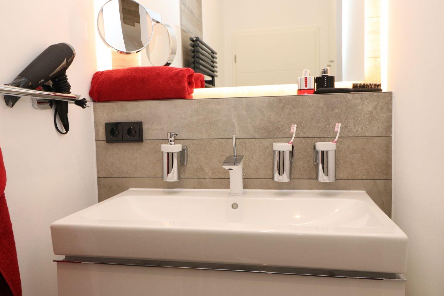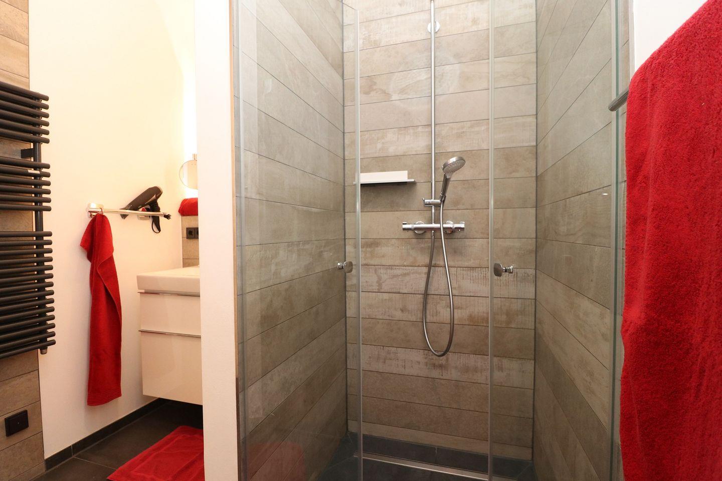 Das lichtdurchflutete Ferienapartment mit großen Panoramafenstern besticht mit seinem elektrischen Kamin im Wohn-/ Ess- und Schlafbereich. Dieser strahlt sowohl Wärme, als auch Gemütlichkeit aus. Ein Sofa, sowie ein Sessel laden zum entspannten Beisammensein ein. Angrenzend befindet sich der Schlafbereich mit einem bequemen Boxspringbett (180cm x 200cm) und zwei Nachttischen mit Nachttischlampen. Gardinen oder Rollläden zur Verdunklung sorgen für eine angenehme Nachtruhe. Für bequeme Sitzmöglichkeiten im Essbereich stehen zwei Sitzschalenstühle und ein Tisch bereit. Auf dem Grundstück steht Ihnen der Pkw-Stellplatz Nr. 09 , das W-Lan sowie die Fahrradabstellplätze in der Tiefgarage kostenlos zur Verfügung.