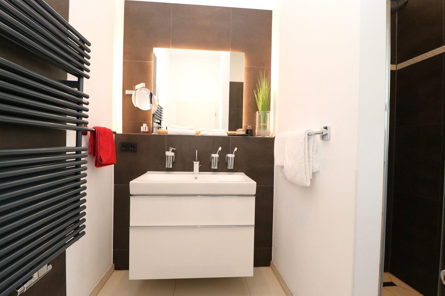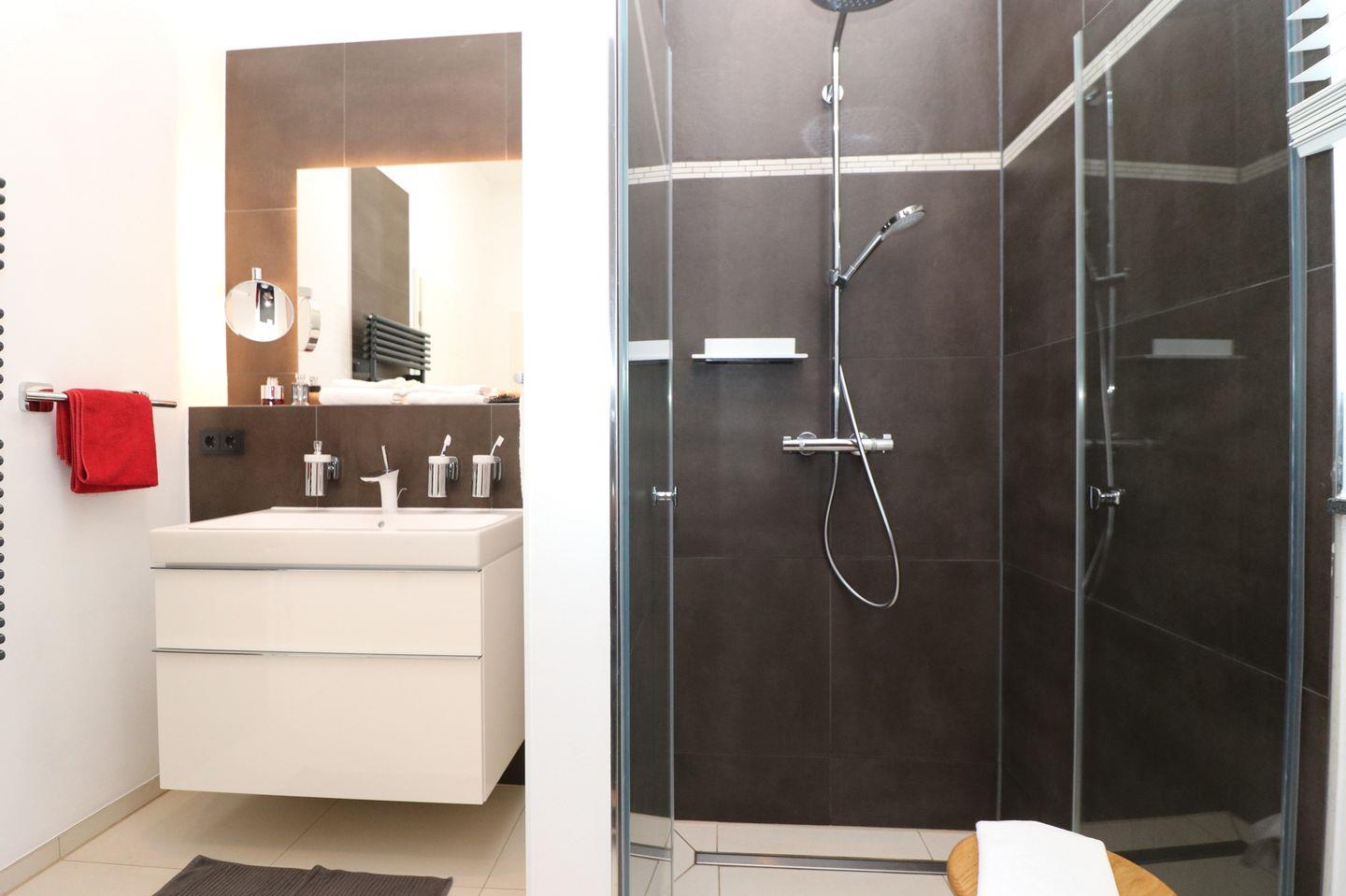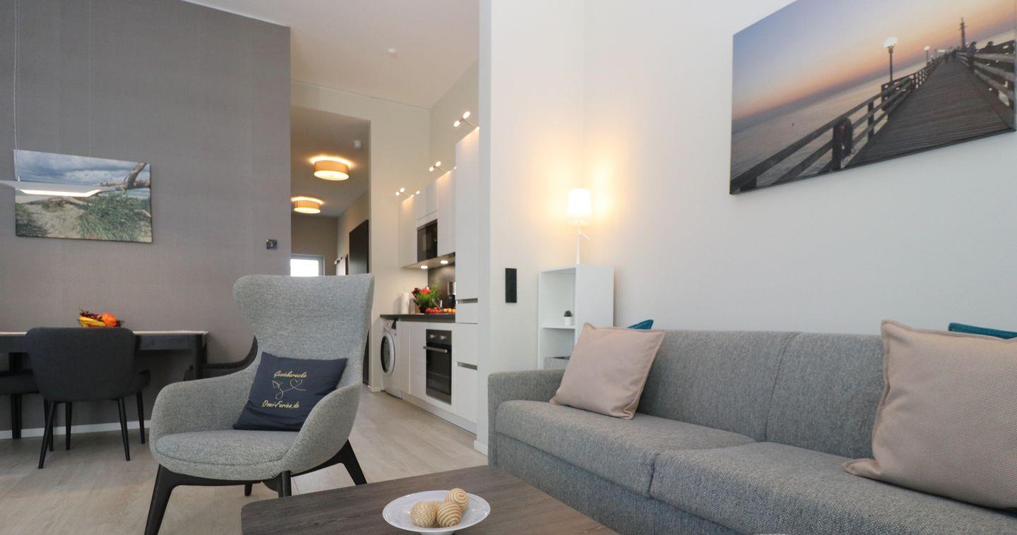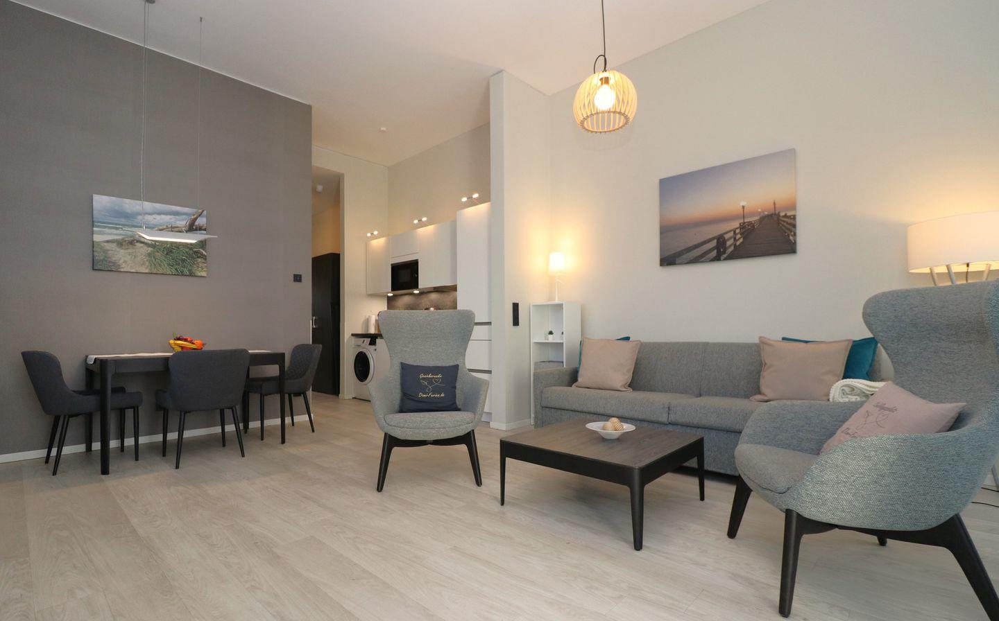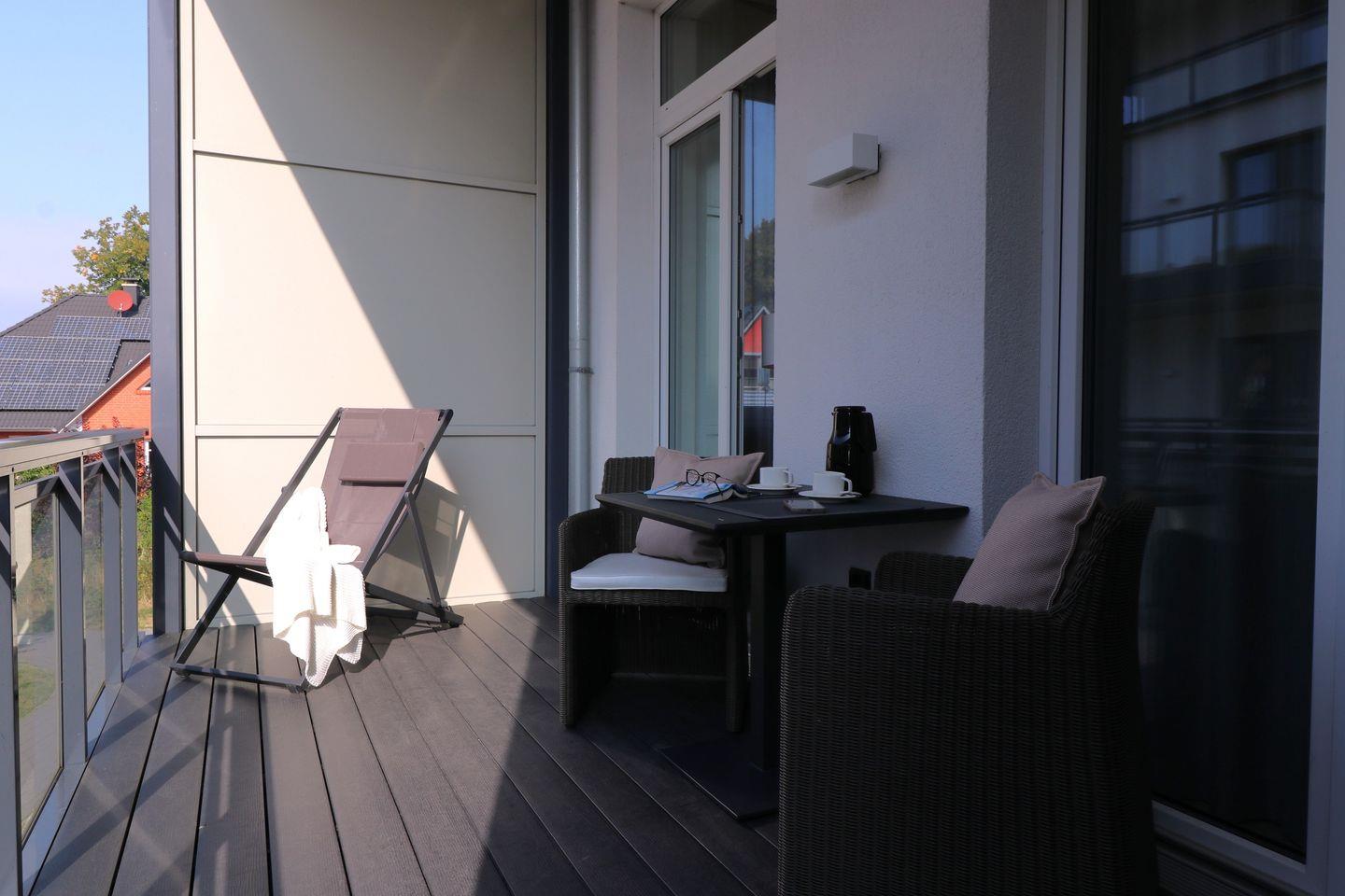 Das Schwalbennest befindet sich im Hochparterre des Hauptgebäudes der alten Seefahrtschule Wustrow und ist mit 62 m² und einem Schlafzimmer ideal für Paare. Urlauber mit Hund sind gern willkommen, denn auch fellige Familienmitglieder sollen hier die frische Ostseeluft genießen. Im offenen und hellen Wohn- und Essbereich wird Entspannung großgeschrieben. Ein Schlafsofa, geeignet zur Aufbettung, und 2 gemütliche Sessel laden zum gemeinsamen Verweilen ein. Für die Tage, an denen es kühler wird, sorgt die Fußbodenheizung in allen Räumen für angenehm warme Füße. Auch zur medialen Unterhaltung trägt die Ferienwohnung ihren Beitrag bei und bietet Ihnen neben kostenfreiem WLAN je einen Flachbildfernseher im Wohn- und Schlafzimmer. Gern können zwei weitere Gäste auf der Schlafcouch übernachten. Vom Wohnzimmer aus können Sie auch den Balkon erreichen, der mit seinen Liegestühlen, sowie seinem Tisch und Stühlen, zum Relaxen einlädt. Auch an einer Küche fehlt es Ihnen nicht, sodass Sie sich bei gemeinsamen Kochabenden austoben können. In der NOLTE-Einbauküche finden Sie alles was Sie zum Kochen brauchen. Genießen können Sie Ihr Essen dann am Esstisch im Wohnzimmer. Das Schlafzimmer mit Boxspringbett lädt zum Träumen ein und ein Kleiderschrank sorgt für genügend Stauraum für Ihr Gepäck. Im geräumigen En-suite-Tageslichtbad finden Sie sowohl eine ebenerdige , große Dusche, als auch WC, Kosmetikspiegel und Föhn. Für Ihr Fahrzeug steht Ihnen an der Seefahrtschule ein kostenfreier Stellplatz zur Verfügung. Ebenso können Sie in der Tiefgarage Ihre Fahrräder kostenlos und sicher unterstellen.