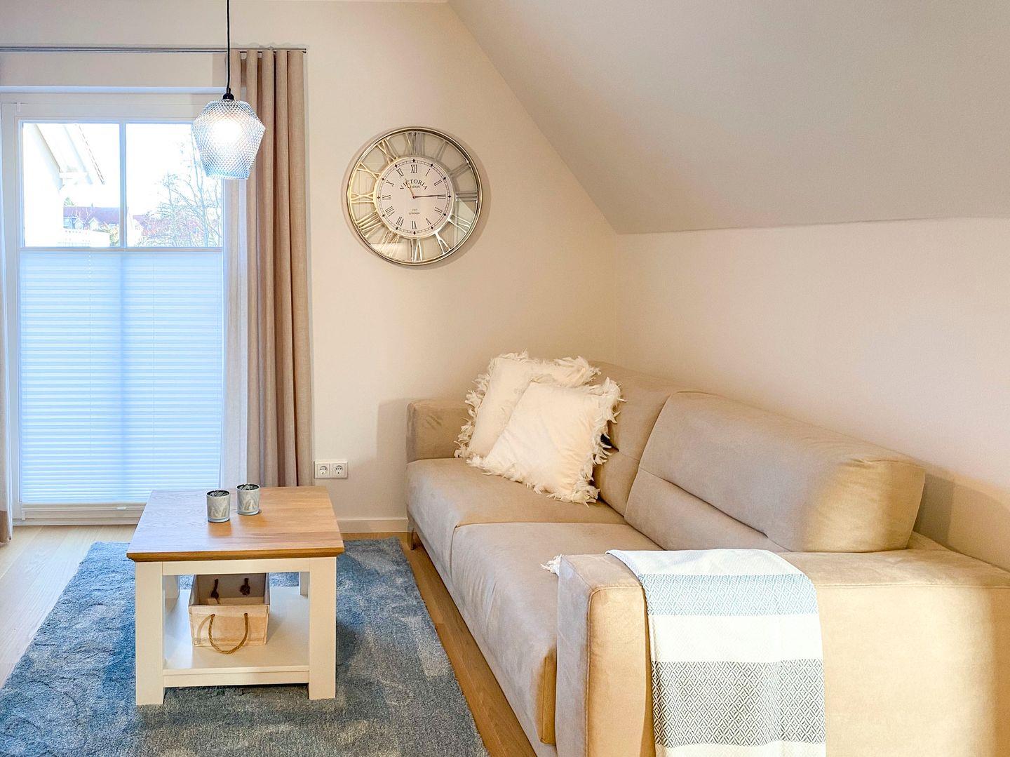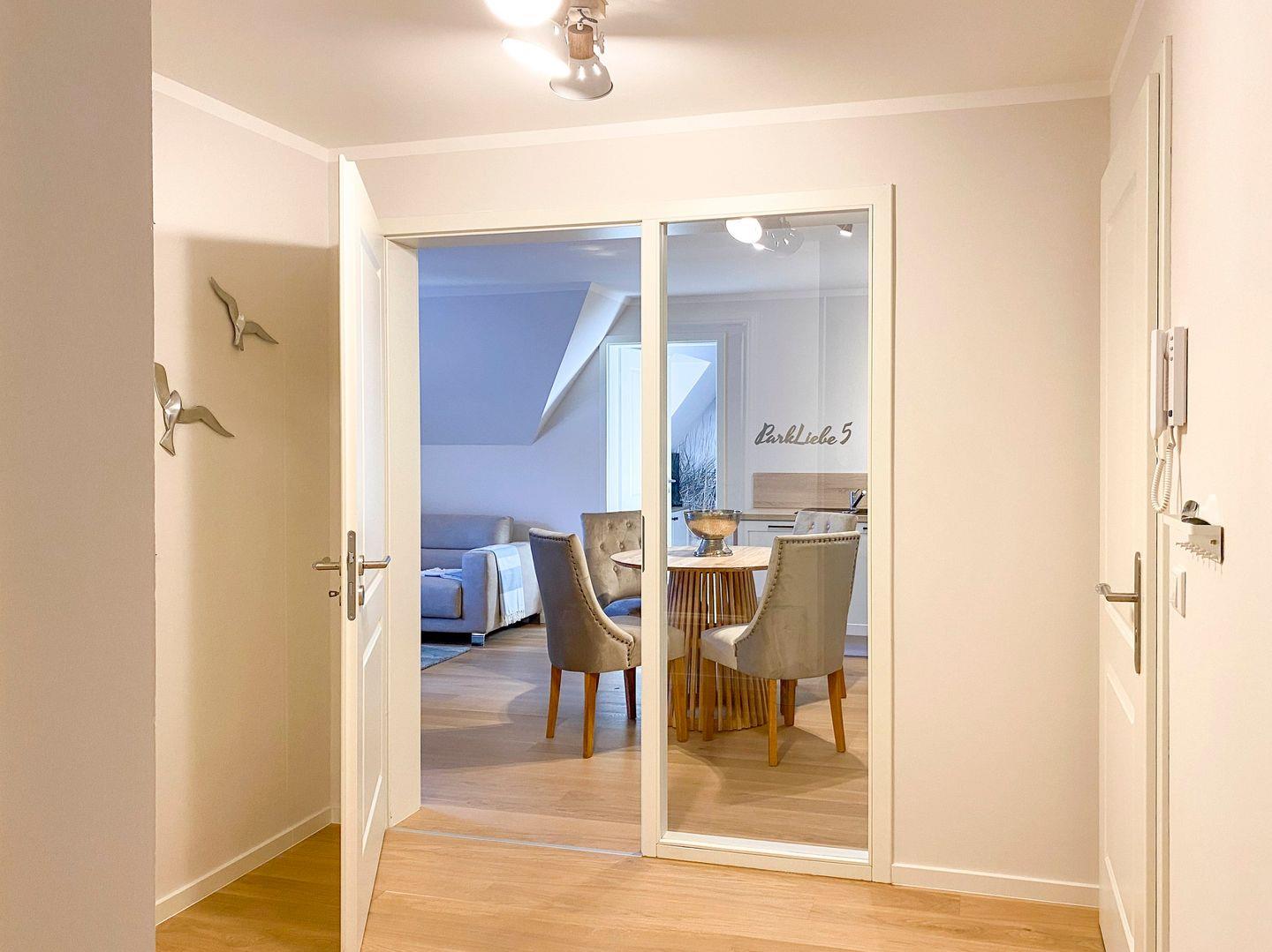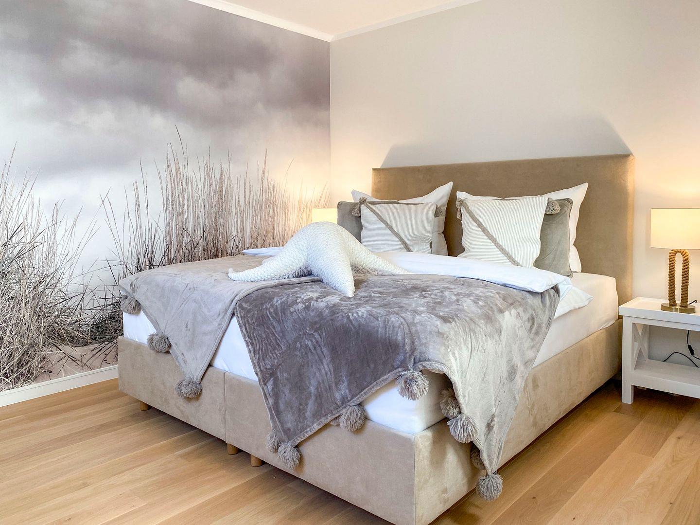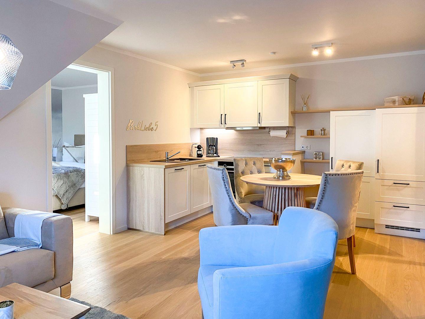 Ein stilvoller Wohnbereich mit einem weichen Sofa und einem einladenden Sessel, ideal, um sich nach einem Tag am nahegelegenen Strand zu entspannen. Ein moderner Flachbildfernseher bietet Unterhaltung für gemütliche Abende. Ihr privater Balkon öffnet sich zu einem grünen Panorama, wo Sie, umgeben von bequemen Gartenmöbeln, die Sonne und frische Luft genießen können. In der voll ausgestatteten Küche, die nahtlos in einen eleganten Essbereich übergeht, finden Sie alles, was Sie für kulinarische Erlebnisse brauchen: Eine moderne Spülmaschine, Backofen, Kaffeemaschinen und mehr. Zur Ruhe kommen Sie in zwei behaglichen Schlafzimmern, jedes mit einem kuscheligen Boxspringbett und eigenem Fernseher. Das Badezimmer ist eine moderne Oase mit ebenerdiger Dusche und einer großzügigen Badewanne, ideal zum Entspannen. Zusätzliche Annehmlichkeiten wie WLAN, eine Waschmaschine, Bügeleinrichtungen und ein sicherer Tiefgaragenparkplatz sorgen für einen sorgenfreien Aufenthalt. Haustiere sind in der Unterkunft willkommen.