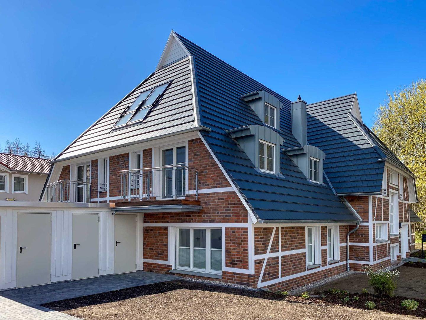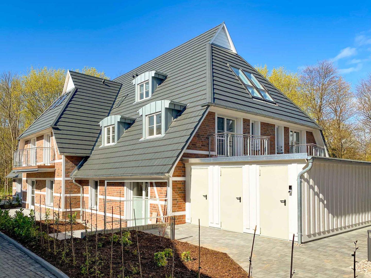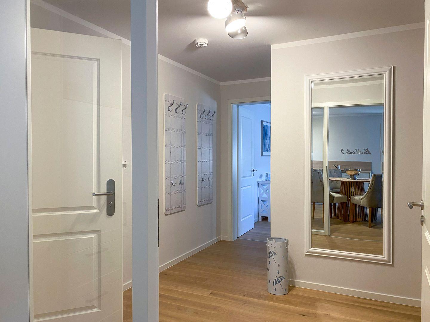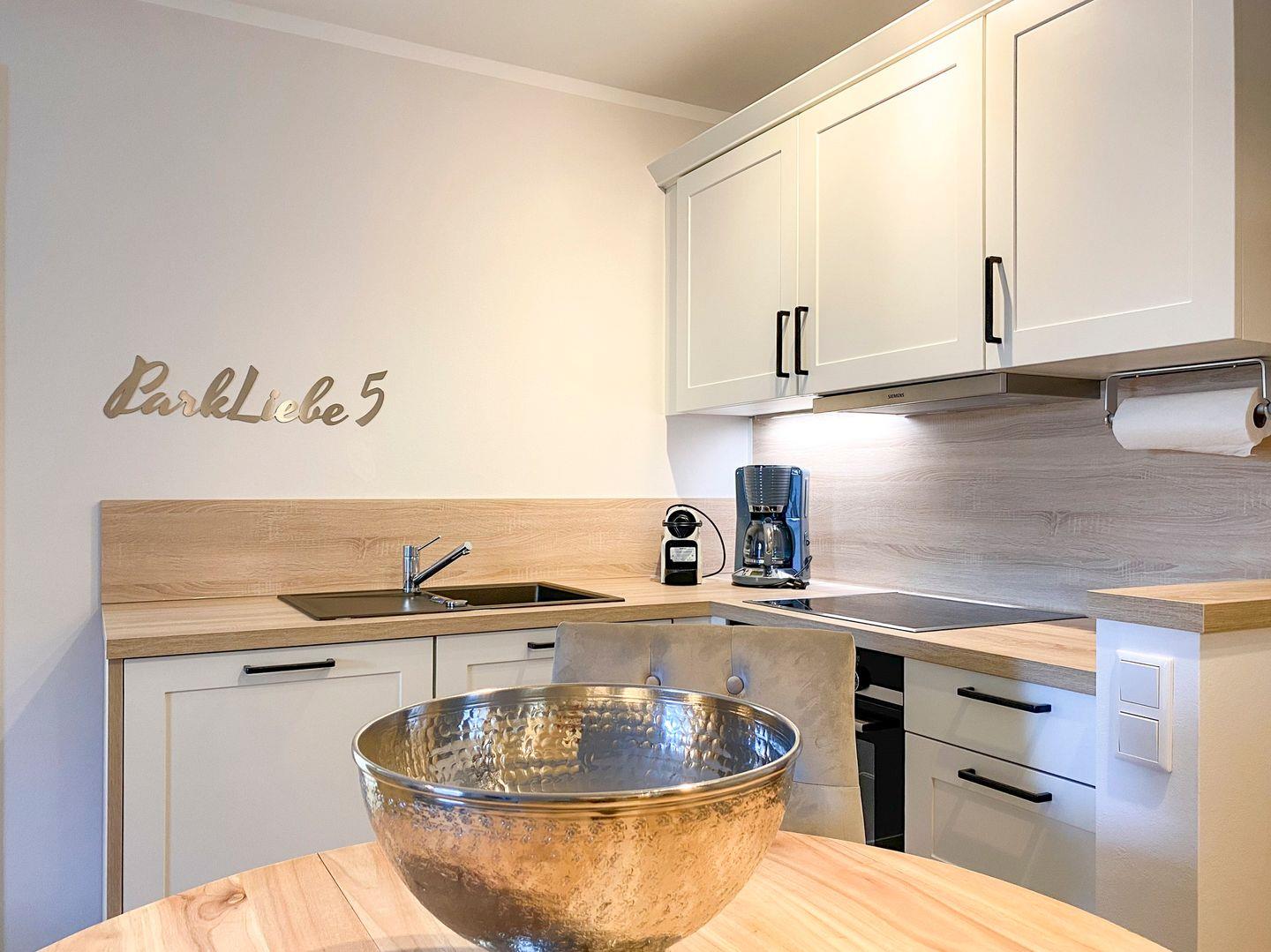 Ein stilvoller Wohnbereich mit einem weichen Sofa und einem einladenden Sessel, ideal, um sich nach einem Tag am nahegelegenen Strand zu entspannen. Ein moderner Flachbildfernseher bietet Unterhaltung für gemütliche Abende. Ihr privater Balkon öffnet sich zu einem grünen Panorama, wo Sie, umgeben von bequemen Gartenmöbeln, die Sonne und frische Luft genießen können. In der voll ausgestatteten Küche, die nahtlos in einen eleganten Essbereich übergeht, finden Sie alles, was Sie für kulinarische Erlebnisse brauchen: Eine moderne Spülmaschine, Backofen, Kaffeemaschinen und mehr. Zur Ruhe kommen Sie in zwei behaglichen Schlafzimmern, jedes mit einem kuscheligen Boxspringbett und eigenem Fernseher. Das Badezimmer ist eine moderne Oase mit ebenerdiger Dusche und einer großzügigen Badewanne, ideal zum Entspannen. Zusätzliche Annehmlichkeiten wie WLAN, eine Waschmaschine, Bügeleinrichtungen und ein sicherer Tiefgaragenparkplatz sorgen für einen sorgenfreien Aufenthalt. Haustiere sind in der Unterkunft willkommen.
