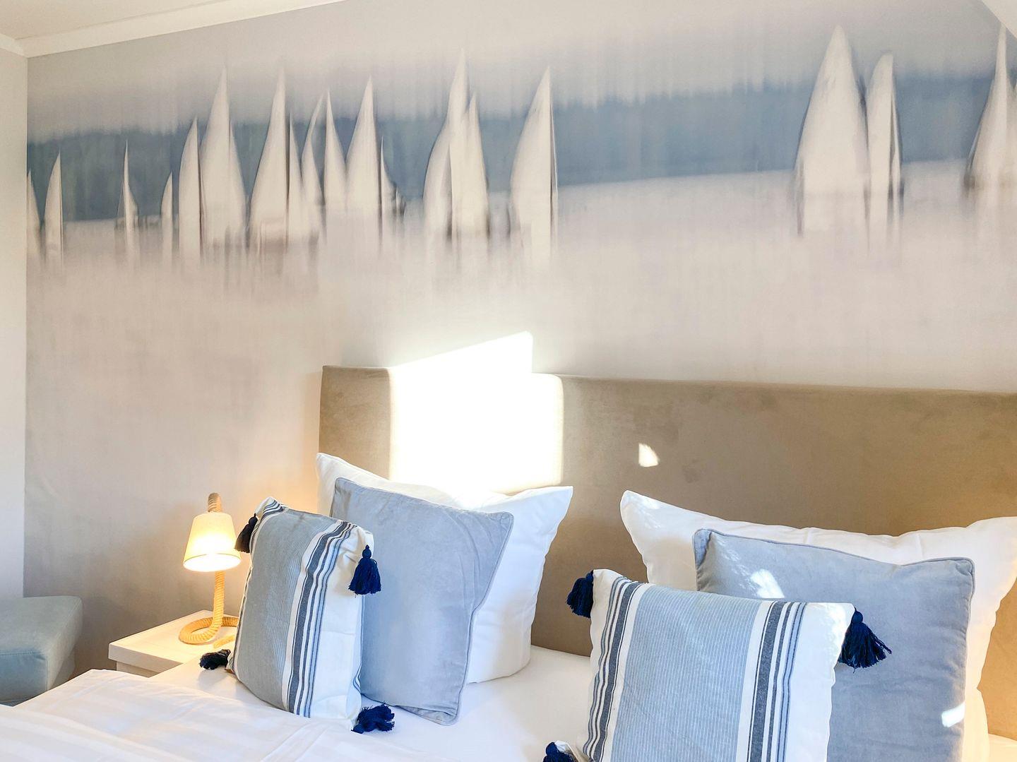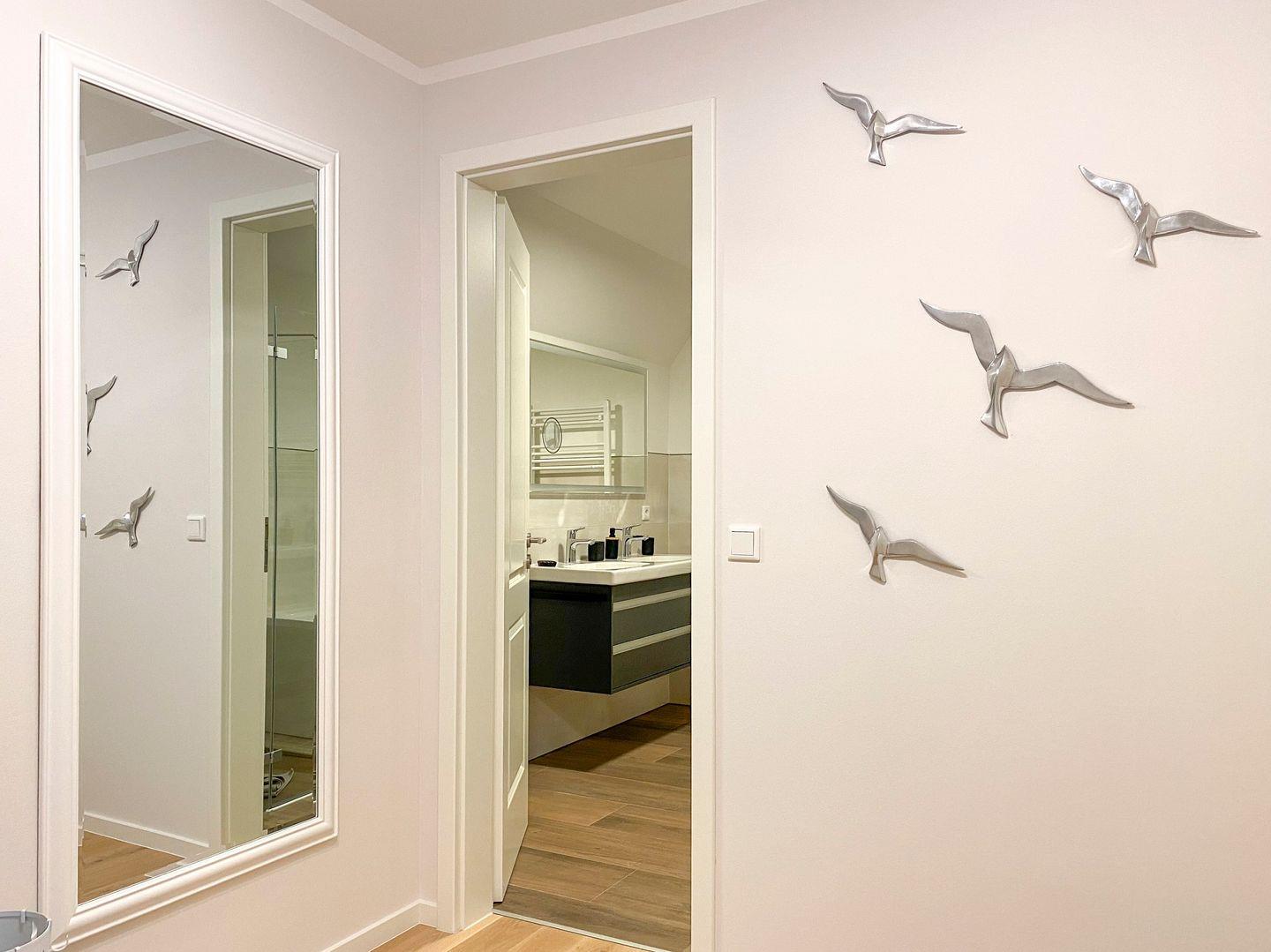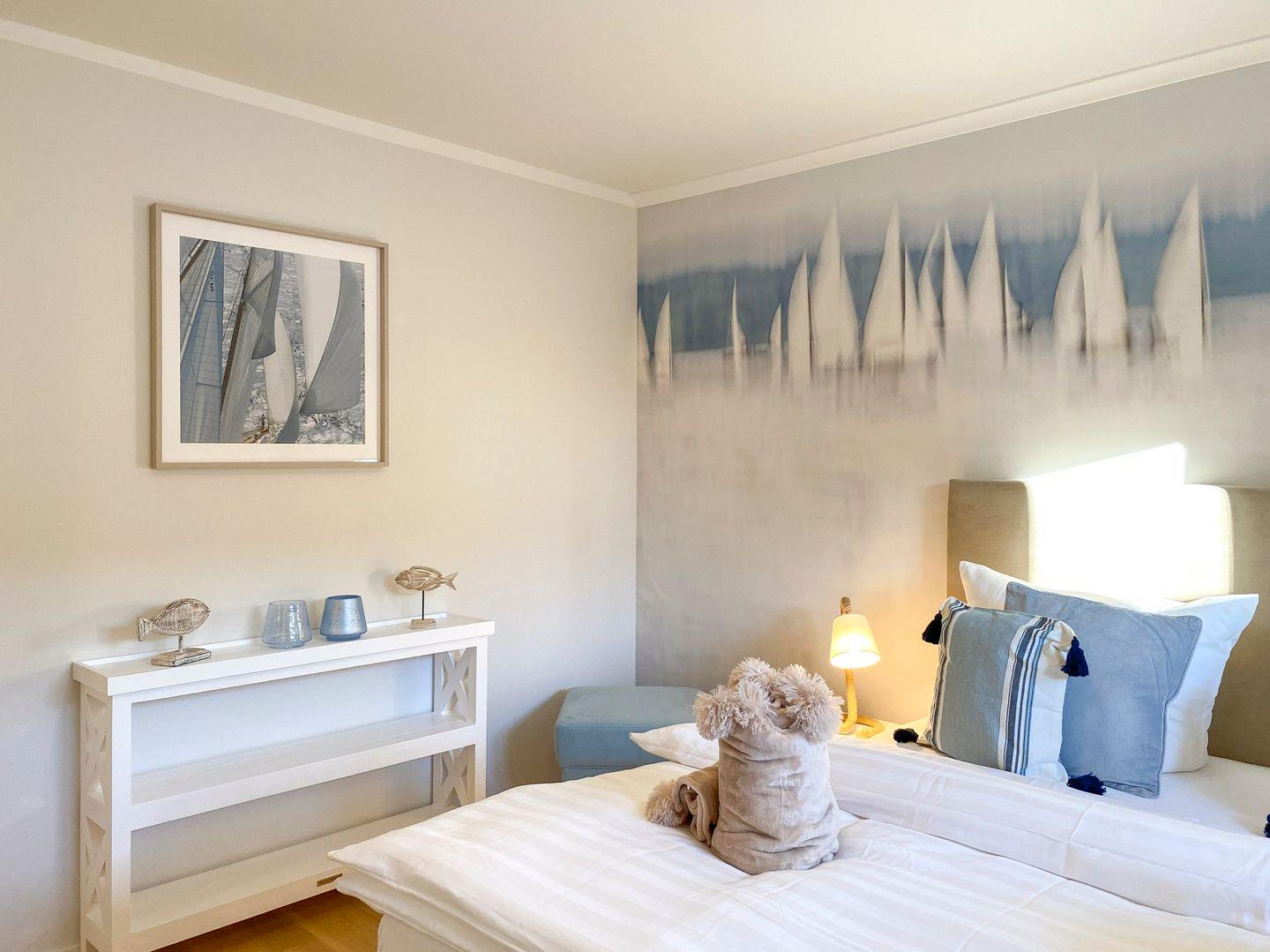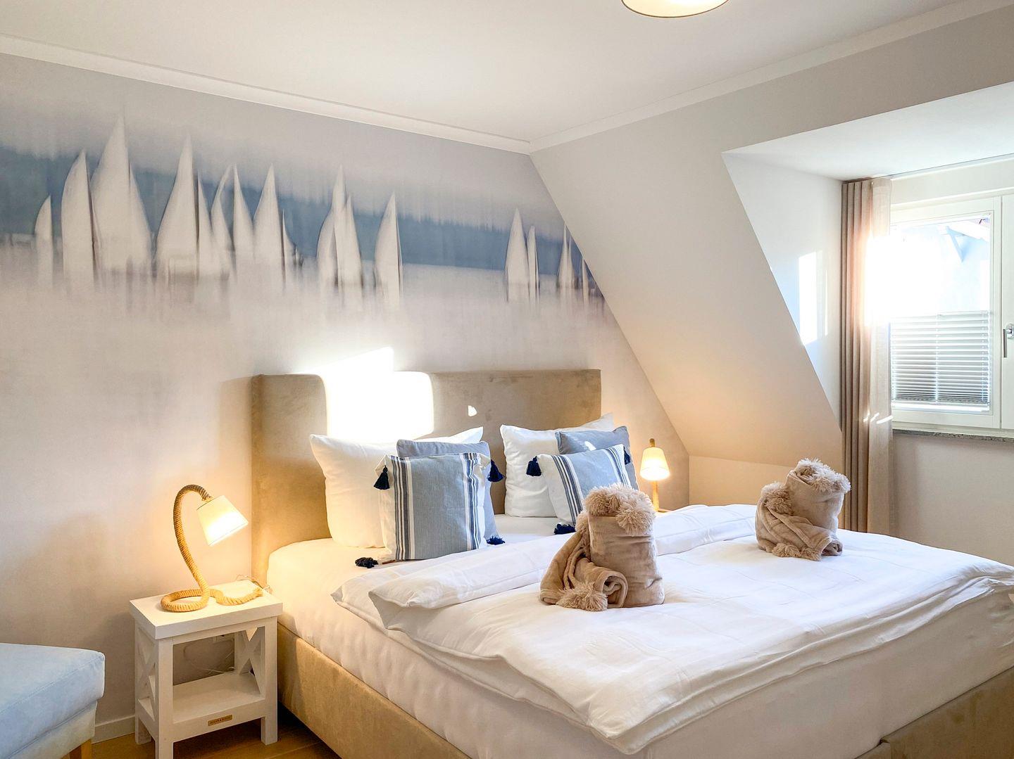 Ein stilvoller Wohnbereich mit einem weichen Sofa und einem einladenden Sessel, ideal, um sich nach einem Tag am nahegelegenen Strand zu entspannen. Ein moderner Flachbildfernseher bietet Unterhaltung für gemütliche Abende. Ihr privater Balkon öffnet sich zu einem grünen Panorama, wo Sie, umgeben von bequemen Gartenmöbeln, die Sonne und frische Luft genießen können. In der voll ausgestatteten Küche, die nahtlos in einen eleganten Essbereich übergeht, finden Sie alles, was Sie für kulinarische Erlebnisse brauchen: Eine moderne Spülmaschine, Backofen, Kaffeemaschinen und mehr. Zur Ruhe kommen Sie in zwei behaglichen Schlafzimmern, jedes mit einem kuscheligen Boxspringbett und eigenem Fernseher. Das Badezimmer ist eine moderne Oase mit ebenerdiger Dusche und einer großzügigen Badewanne, ideal zum Entspannen. Zusätzliche Annehmlichkeiten wie WLAN, eine Waschmaschine, Bügeleinrichtungen und ein sicherer Tiefgaragenparkplatz sorgen für einen sorgenfreien Aufenthalt. Haustiere sind in der Unterkunft willkommen.
