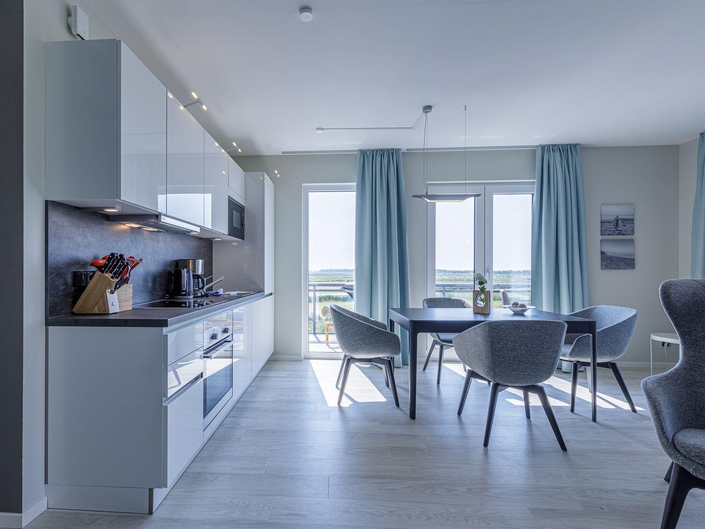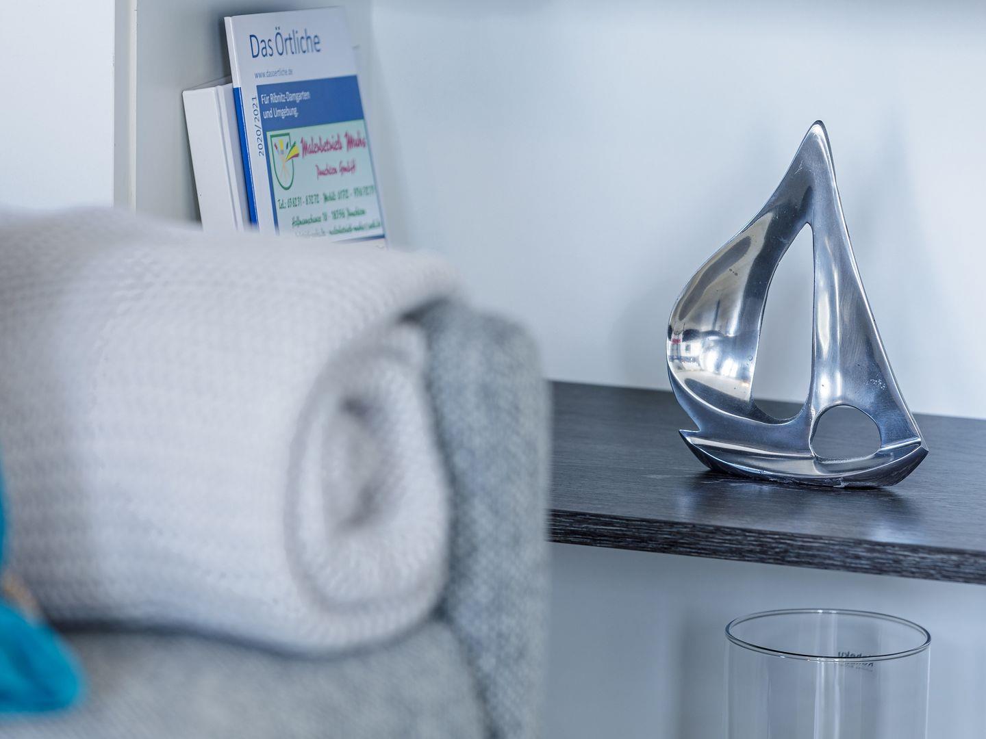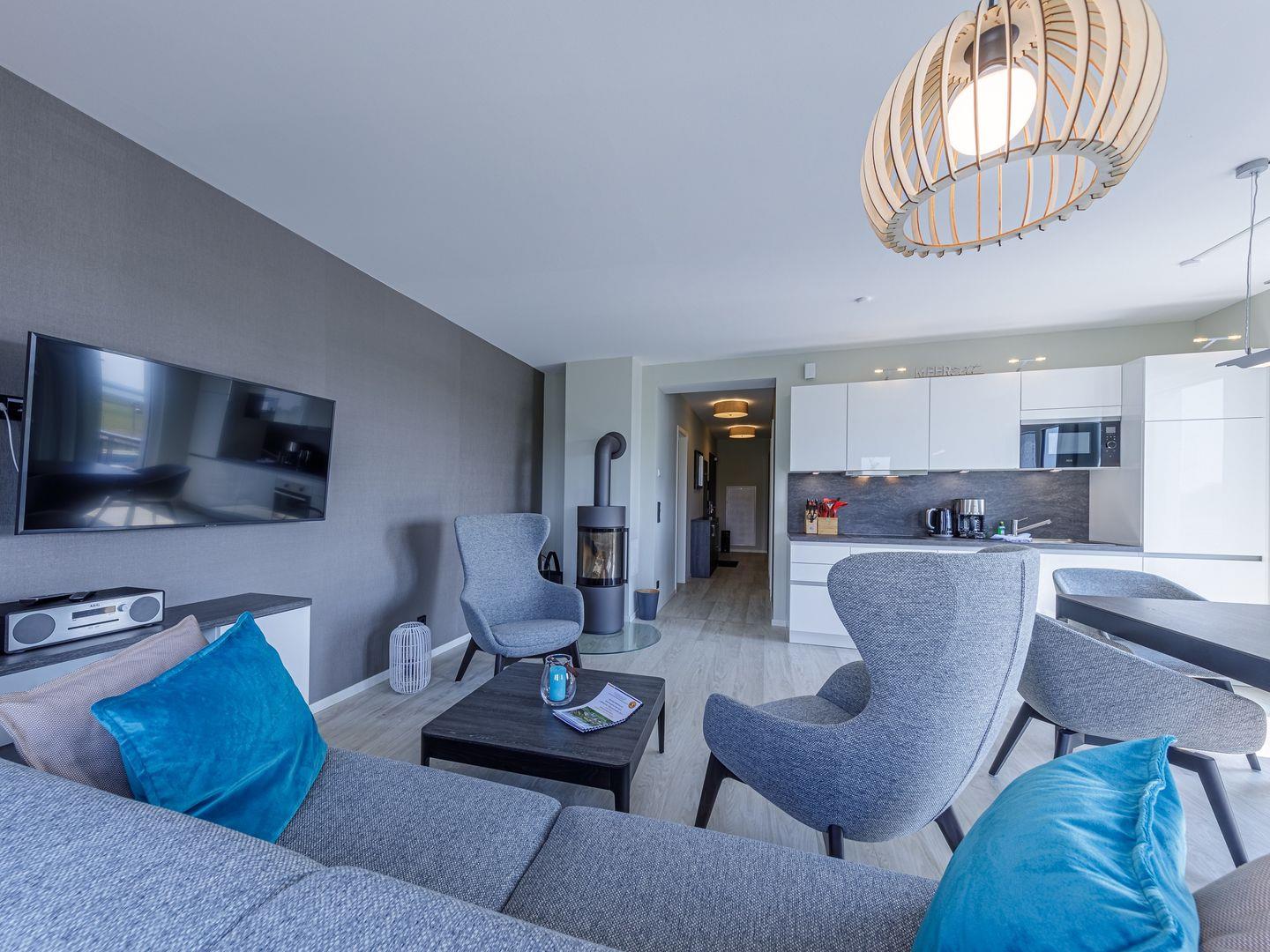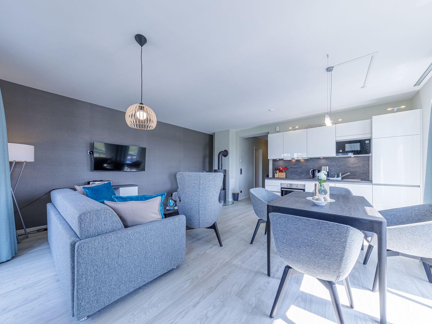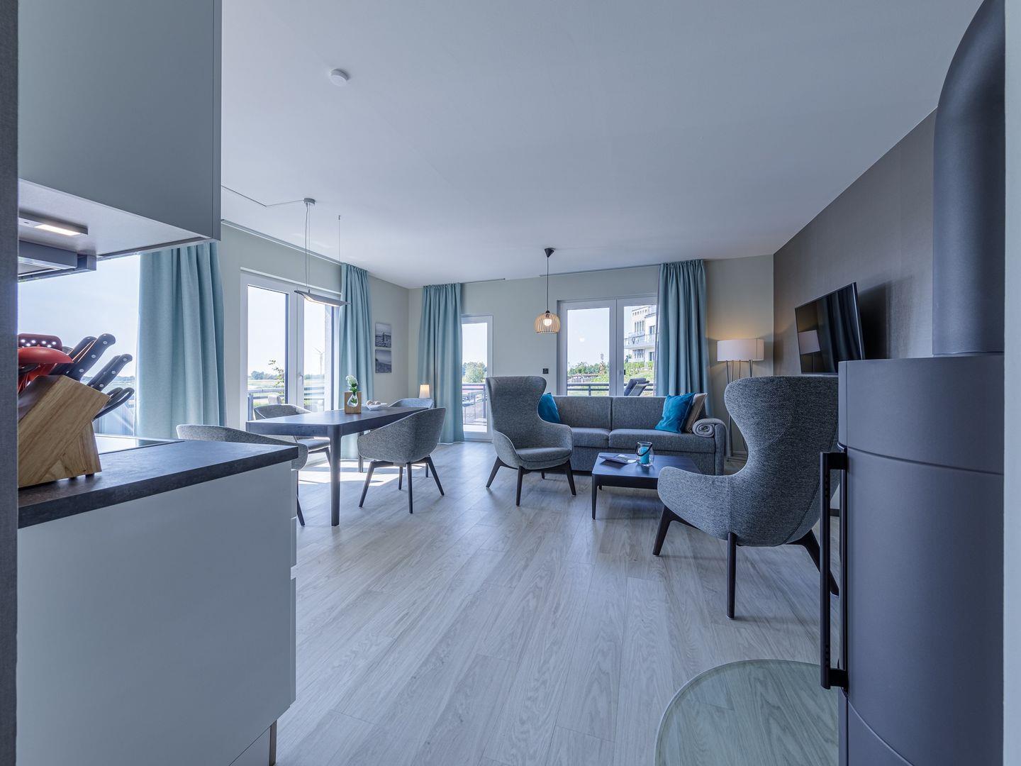 Die Ferienwohnung ist modern und stilvoll eingerichtet. Der im gesamten Wohn- und Schlafbereich der Ferienwohnung verlegte Design-Bodenbelag wirkt schlicht und zurücknehmend. Die installierte Fußbodenheizung, sowie ein Kamin sorgen für wohlige Wärme. Über den Eingangsbereich, in dem Ihnen verschiedene Aufhängemöglichkeiten und ein Sideboard ausreichend Stauraum bieten, gelangen Sie in den großzügigen Wohn-, Ess- und Küchenbereich. Ein großes Sofa mit zwei Lounge-Chair-Sesseln laden zu gemütlichen Abenden mit Freunden und der Familie ein und der Blick aus den bodentiefen Fenstern ist einfach atemberaubend. Für die mediale Unterhaltung sorgen im Wohnbereich eine Hi-Fi-Anlage und ein 50-Flachbild-TV. Kostenfreies W-LAN steht Ihnen selbstverständlich auch zur Verfügung. Ergänzt wird die gemütliche Wohnlandschaft durch den Essbereich, bestehend aus einem Esstisch und vier Stühlen. Geselligen Abenden oder gemeinsamen Essen steht damit nichts im Wege. Die offene, voll ausgestattete NOLTE-Einbauküche hat alles, was ein Kochherz begehrt. Elektro-Einbaugeräte, wie ein Induktionsherd, ein Geschirrspüler, ein Kühlschrank mit Gefrierkombination und eine Mikrowelle, sowie zahlreiche Kochutensilien runden das Angebot ab. Genießen Sie Ihr Essen doch gerne auf dem großen Südwestbalkon. Von dort aus können Sie entspannt auf die gefärbten Segel der Zeesboote auf dem Bodden schauen. Den möblierten Balkon erreichen Sie bequem vom Wohn- und Essbereich über die vollverglasten Türen. Zur Ausstattung gehören ein Tisch, zwei Stühle und zwei Sonnenliegen. Das Schlafzimmer ist mit liebevollen Details eingerichtet. Träumen Sie in dem Boxspringbett (180 x 200 cm) oder genießen Sie die Aussicht aus den bodentiefen Fenstern. Ein Kleiderschrank, mit integriertem Safe für Ihre Wertsachen, bietet ausreichend Stauraum. Außerdem befinden sich in dem Schlafzimmer zwei Nachttische mit je einer Nachttischlampe und ein 32-Zoll Flachbild-TV. Gerne können 2 weitere Gäste auf der Schlafcouch übernachten. In dem Tageslicht-Badezimmer, welches Sie über den Eingangsbereich erreichen können, stehen Ihnen eine ebenerdige Dusche, ein Waschbecken mit Unterschrank, ein WC, sowie ein Kosmetikspiegel und ein Föhn zur Verfügung. Große Fliesen und warme Töne runden das Gesamtbild ab und spiegeln den Strandhaus-Stil wider.
