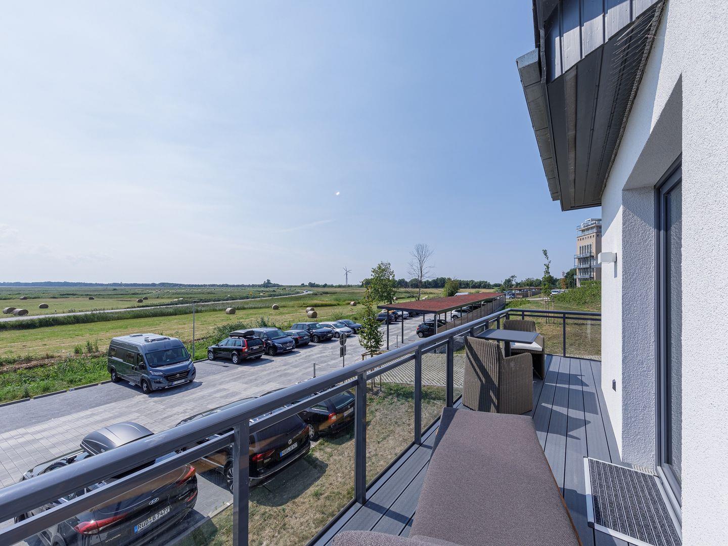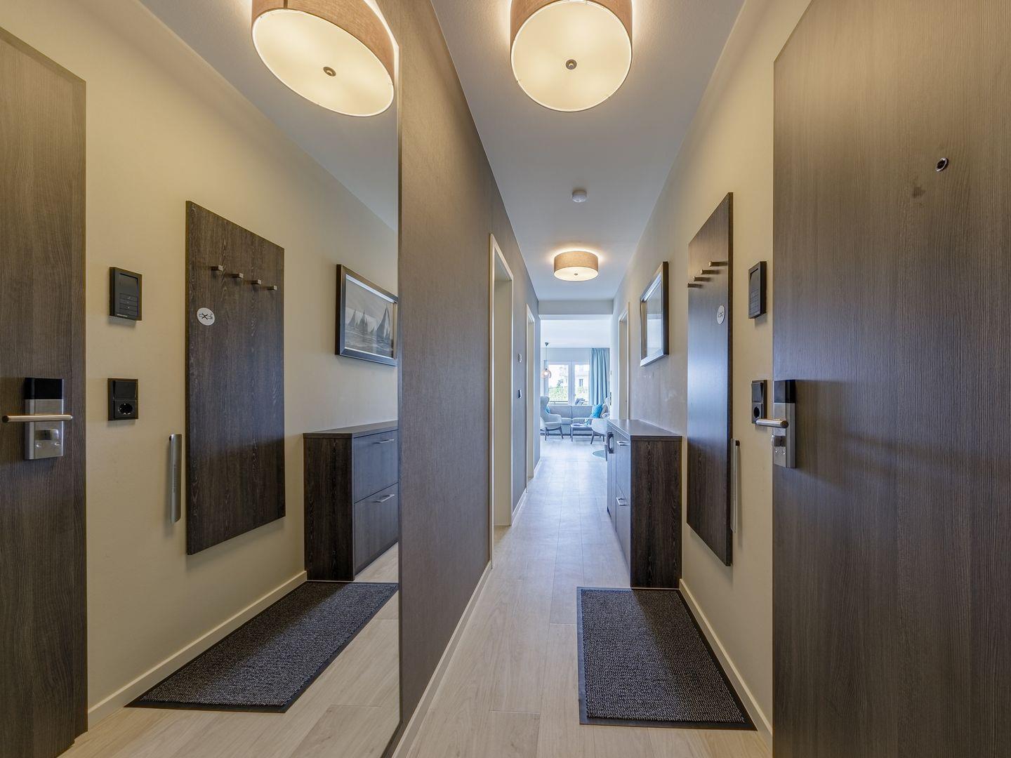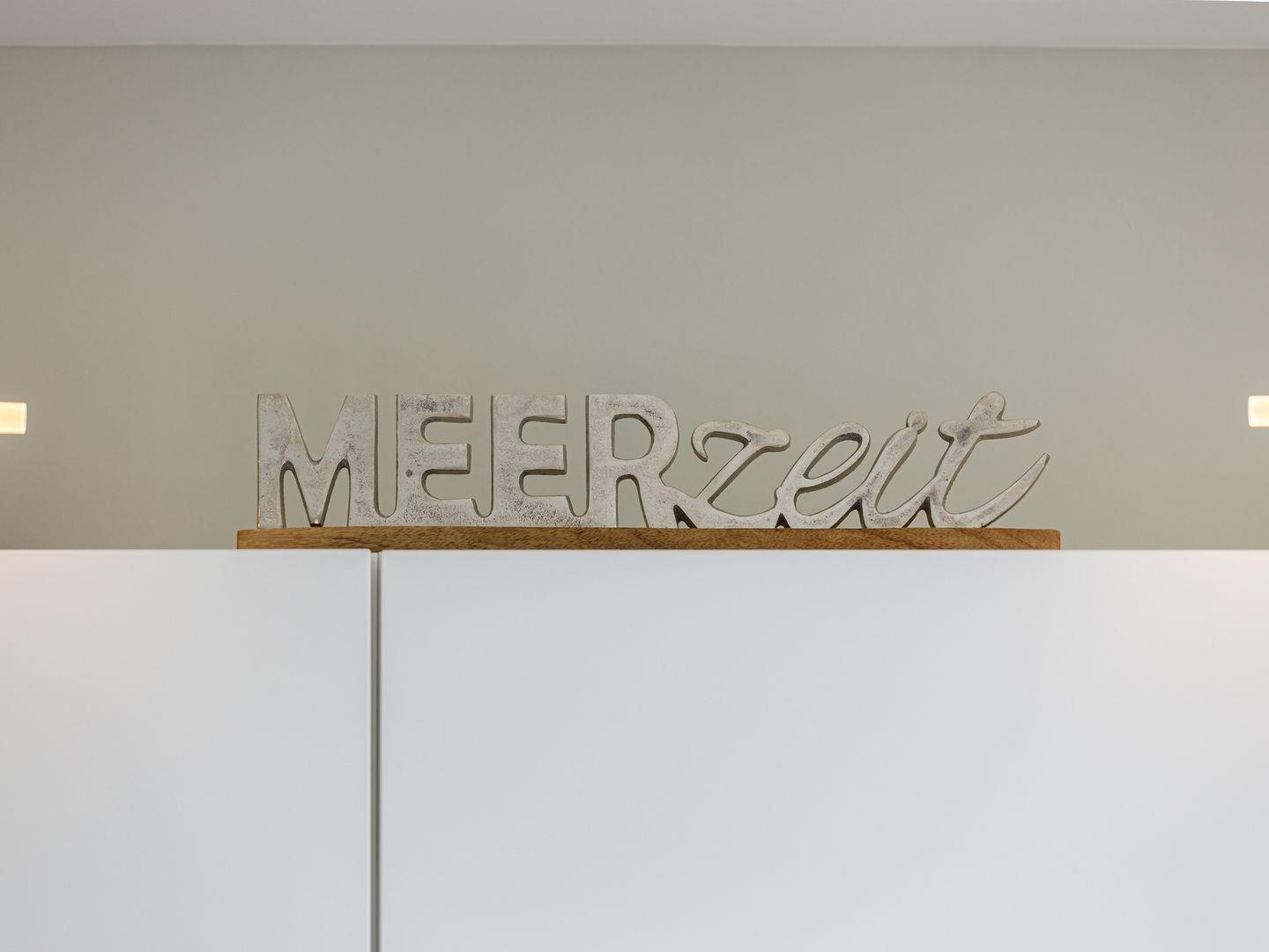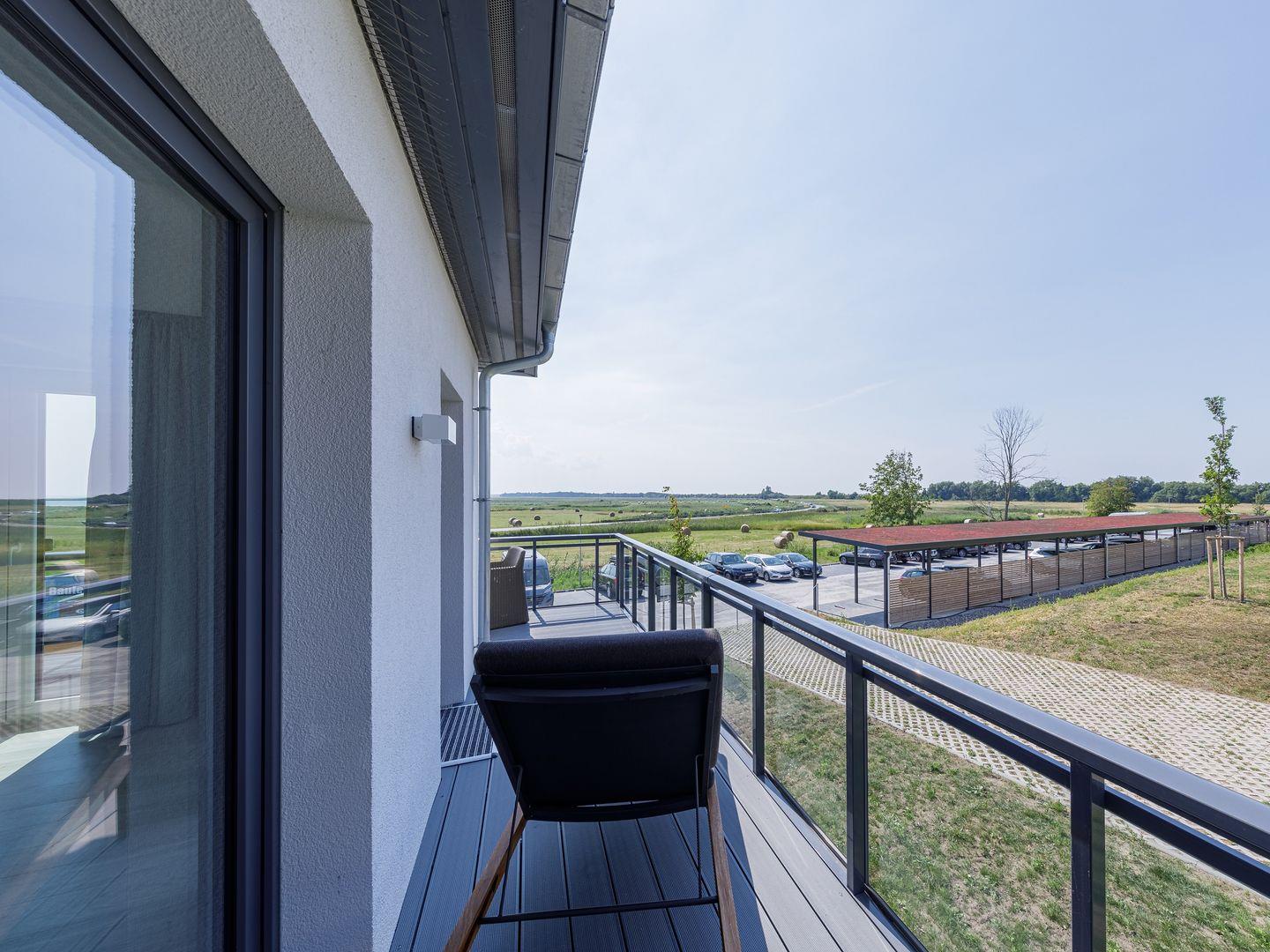 Die Ferienwohnung ist modern und stilvoll eingerichtet. Der im gesamten Wohn- und Schlafbereich der Ferienwohnung verlegte Design-Bodenbelag wirkt schlicht und zurücknehmend. Die installierte Fußbodenheizung, sowie ein Kamin sorgen für wohlige Wärme. Über den Eingangsbereich, in dem Ihnen verschiedene Aufhängemöglichkeiten und ein Sideboard ausreichend Stauraum bieten, gelangen Sie in den großzügigen Wohn-, Ess- und Küchenbereich. Ein großes Sofa mit zwei Lounge-Chair-Sesseln laden zu gemütlichen Abenden mit Freunden und der Familie ein und der Blick aus den bodentiefen Fenstern ist einfach atemberaubend. Für die mediale Unterhaltung sorgen im Wohnbereich eine Hi-Fi-Anlage und ein 50-Flachbild-TV. Kostenfreies W-LAN steht Ihnen selbstverständlich auch zur Verfügung. Ergänzt wird die gemütliche Wohnlandschaft durch den Essbereich, bestehend aus einem Esstisch und vier Stühlen. Geselligen Abenden oder gemeinsamen Essen steht damit nichts im Wege. Die offene, voll ausgestattete NOLTE-Einbauküche hat alles, was ein Kochherz begehrt. Elektro-Einbaugeräte, wie ein Induktionsherd, ein Geschirrspüler, ein Kühlschrank mit Gefrierkombination und eine Mikrowelle, sowie zahlreiche Kochutensilien runden das Angebot ab. Genießen Sie Ihr Essen doch gerne auf dem großen Südwestbalkon. Von dort aus können Sie entspannt auf die gefärbten Segel der Zeesboote auf dem Bodden schauen. Den möblierten Balkon erreichen Sie bequem vom Wohn- und Essbereich über die vollverglasten Türen. Zur Ausstattung gehören ein Tisch, zwei Stühle und zwei Sonnenliegen. Das Schlafzimmer ist mit liebevollen Details eingerichtet. Träumen Sie in dem Boxspringbett (180 x 200 cm) oder genießen Sie die Aussicht aus den bodentiefen Fenstern. Ein Kleiderschrank, mit integriertem Safe für Ihre Wertsachen, bietet ausreichend Stauraum. Außerdem befinden sich in dem Schlafzimmer zwei Nachttische mit je einer Nachttischlampe und ein 32-Zoll Flachbild-TV. Gerne können 2 weitere Gäste auf der Schlafcouch übernachten. In dem Tageslicht-Badezimmer, welches Sie über den Eingangsbereich erreichen können, stehen Ihnen eine ebenerdige Dusche, ein Waschbecken mit Unterschrank, ein WC, sowie ein Kosmetikspiegel und ein Föhn zur Verfügung. Große Fliesen und warme Töne runden das Gesamtbild ab und spiegeln den Strandhaus-Stil wider.
