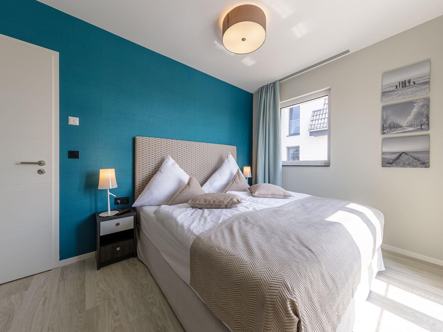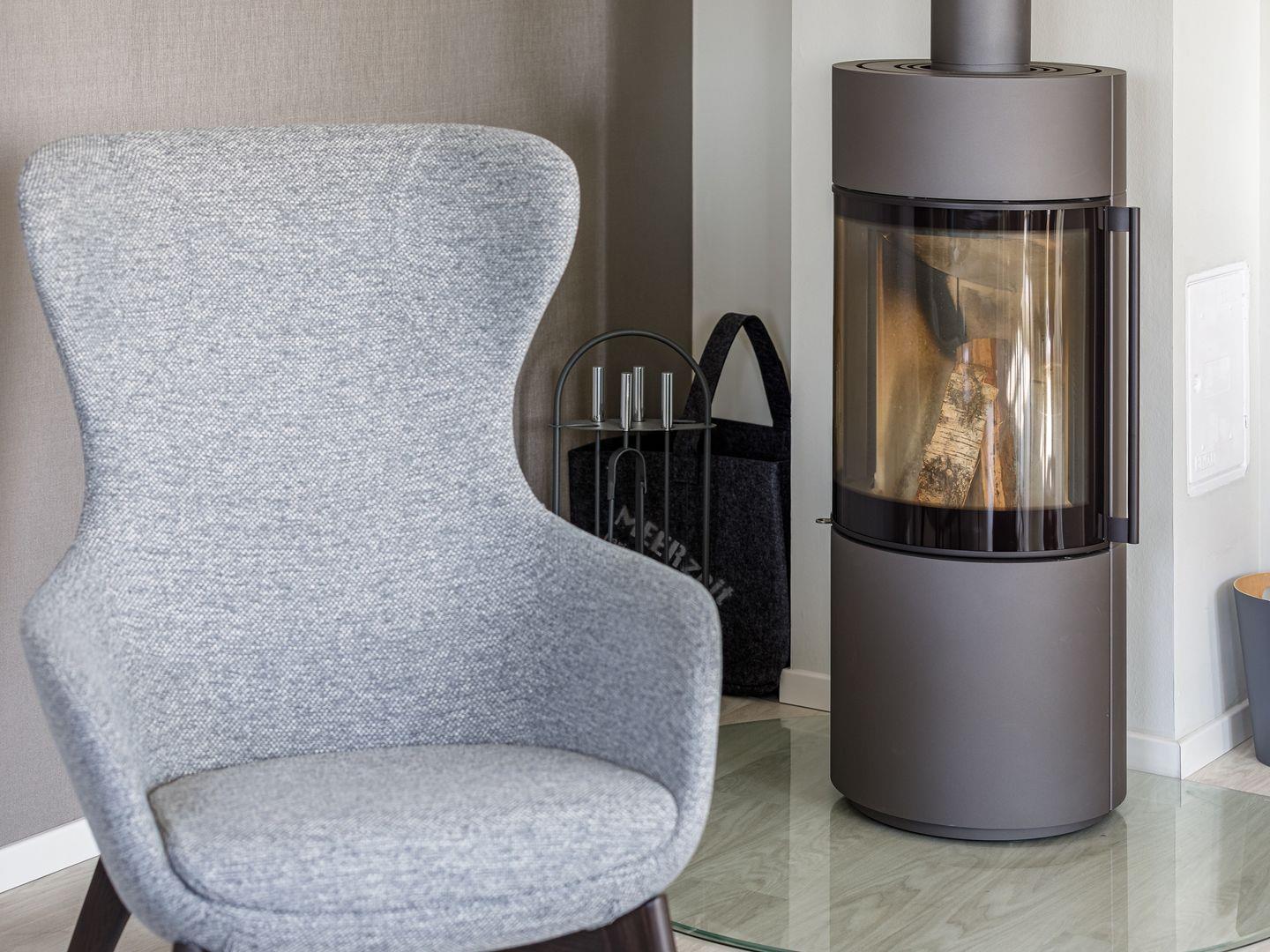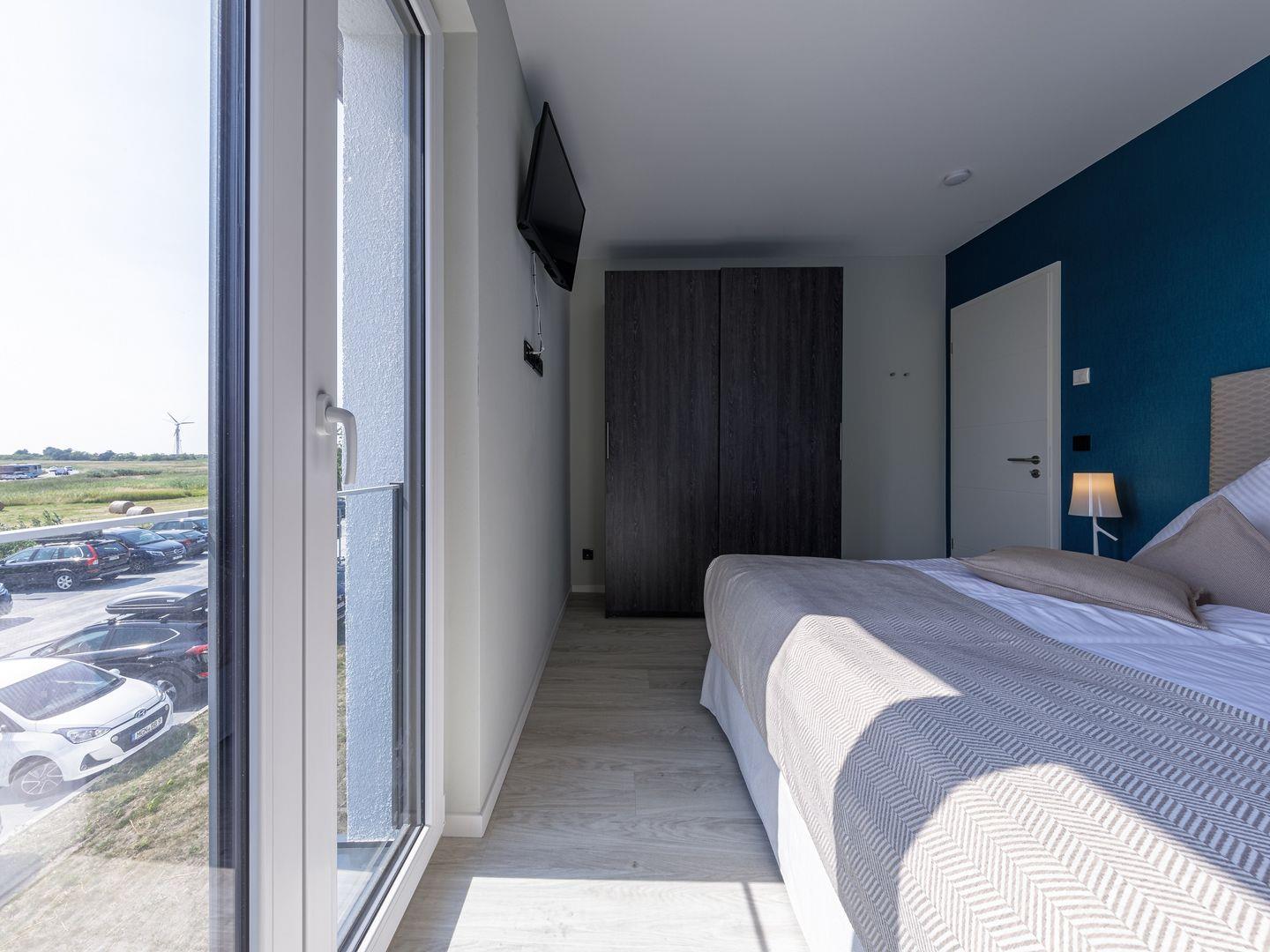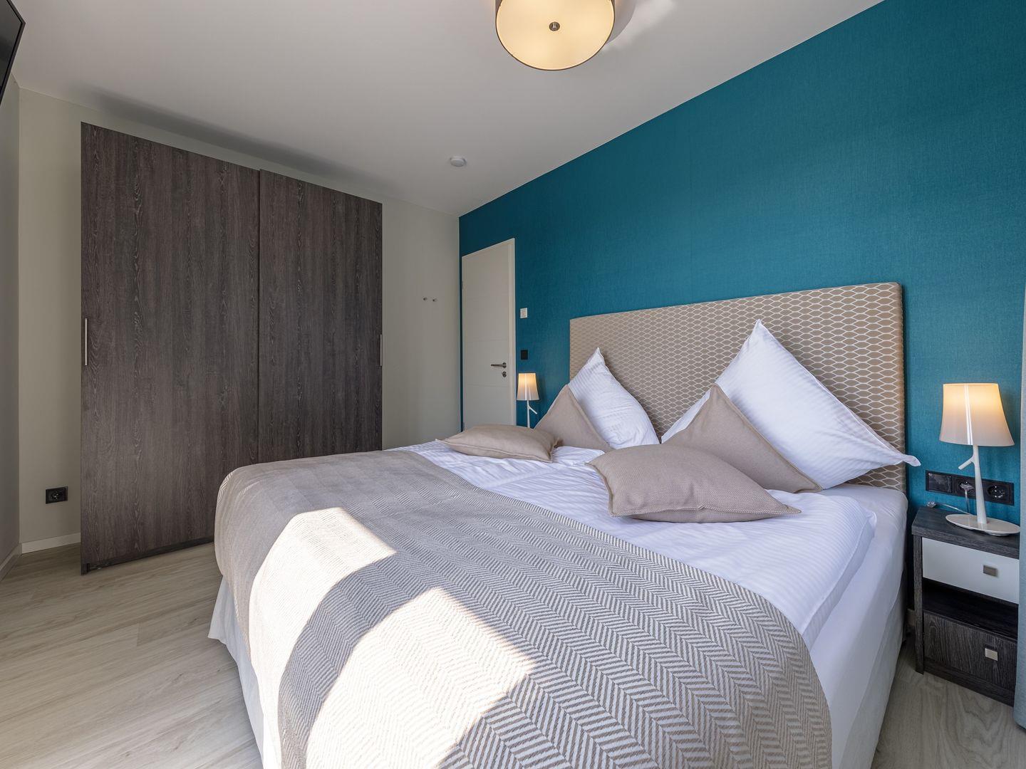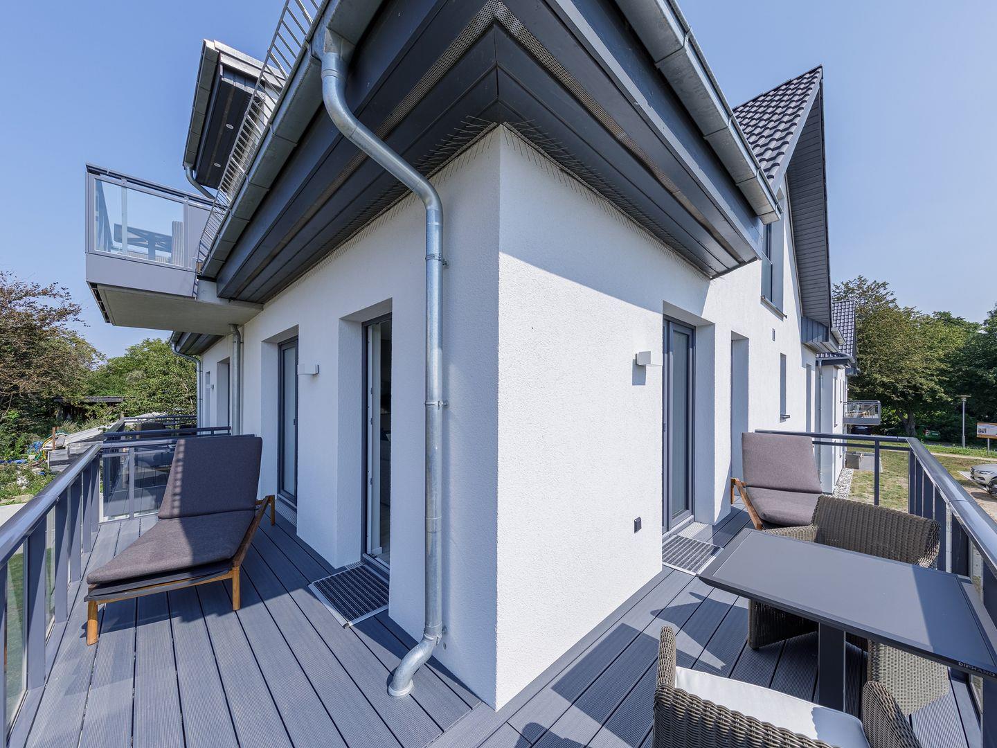 Die Ferienwohnung ist modern und stilvoll eingerichtet. Der im gesamten Wohn- und Schlafbereich der Ferienwohnung verlegte Design-Bodenbelag wirkt schlicht und zurücknehmend. Die installierte Fußbodenheizung, sowie ein Kamin sorgen für wohlige Wärme. Über den Eingangsbereich, in dem Ihnen verschiedene Aufhängemöglichkeiten und ein Sideboard ausreichend Stauraum bieten, gelangen Sie in den großzügigen Wohn-, Ess- und Küchenbereich. Ein großes Sofa mit zwei Lounge-Chair-Sesseln laden zu gemütlichen Abenden mit Freunden und der Familie ein und der Blick aus den bodentiefen Fenstern ist einfach atemberaubend. Für die mediale Unterhaltung sorgen im Wohnbereich eine Hi-Fi-Anlage und ein 50-Flachbild-TV. Kostenfreies W-LAN steht Ihnen selbstverständlich auch zur Verfügung. Ergänzt wird die gemütliche Wohnlandschaft durch den Essbereich, bestehend aus einem Esstisch und vier Stühlen. Geselligen Abenden oder gemeinsamen Essen steht damit nichts im Wege. Die offene, voll ausgestattete NOLTE-Einbauküche hat alles, was ein Kochherz begehrt. Elektro-Einbaugeräte, wie ein Induktionsherd, ein Geschirrspüler, ein Kühlschrank mit Gefrierkombination und eine Mikrowelle, sowie zahlreiche Kochutensilien runden das Angebot ab. Genießen Sie Ihr Essen doch gerne auf dem großen Südwestbalkon. Von dort aus können Sie entspannt auf die gefärbten Segel der Zeesboote auf dem Bodden schauen. Den möblierten Balkon erreichen Sie bequem vom Wohn- und Essbereich über die vollverglasten Türen. Zur Ausstattung gehören ein Tisch, zwei Stühle und zwei Sonnenliegen. Das Schlafzimmer ist mit liebevollen Details eingerichtet. Träumen Sie in dem Boxspringbett (180 x 200 cm) oder genießen Sie die Aussicht aus den bodentiefen Fenstern. Ein Kleiderschrank, mit integriertem Safe für Ihre Wertsachen, bietet ausreichend Stauraum. Außerdem befinden sich in dem Schlafzimmer zwei Nachttische mit je einer Nachttischlampe und ein 32-Zoll Flachbild-TV. Gerne können 2 weitere Gäste auf der Schlafcouch übernachten. In dem Tageslicht-Badezimmer, welches Sie über den Eingangsbereich erreichen können, stehen Ihnen eine ebenerdige Dusche, ein Waschbecken mit Unterschrank, ein WC, sowie ein Kosmetikspiegel und ein Föhn zur Verfügung. Große Fliesen und warme Töne runden das Gesamtbild ab und spiegeln den Strandhaus-Stil wider.