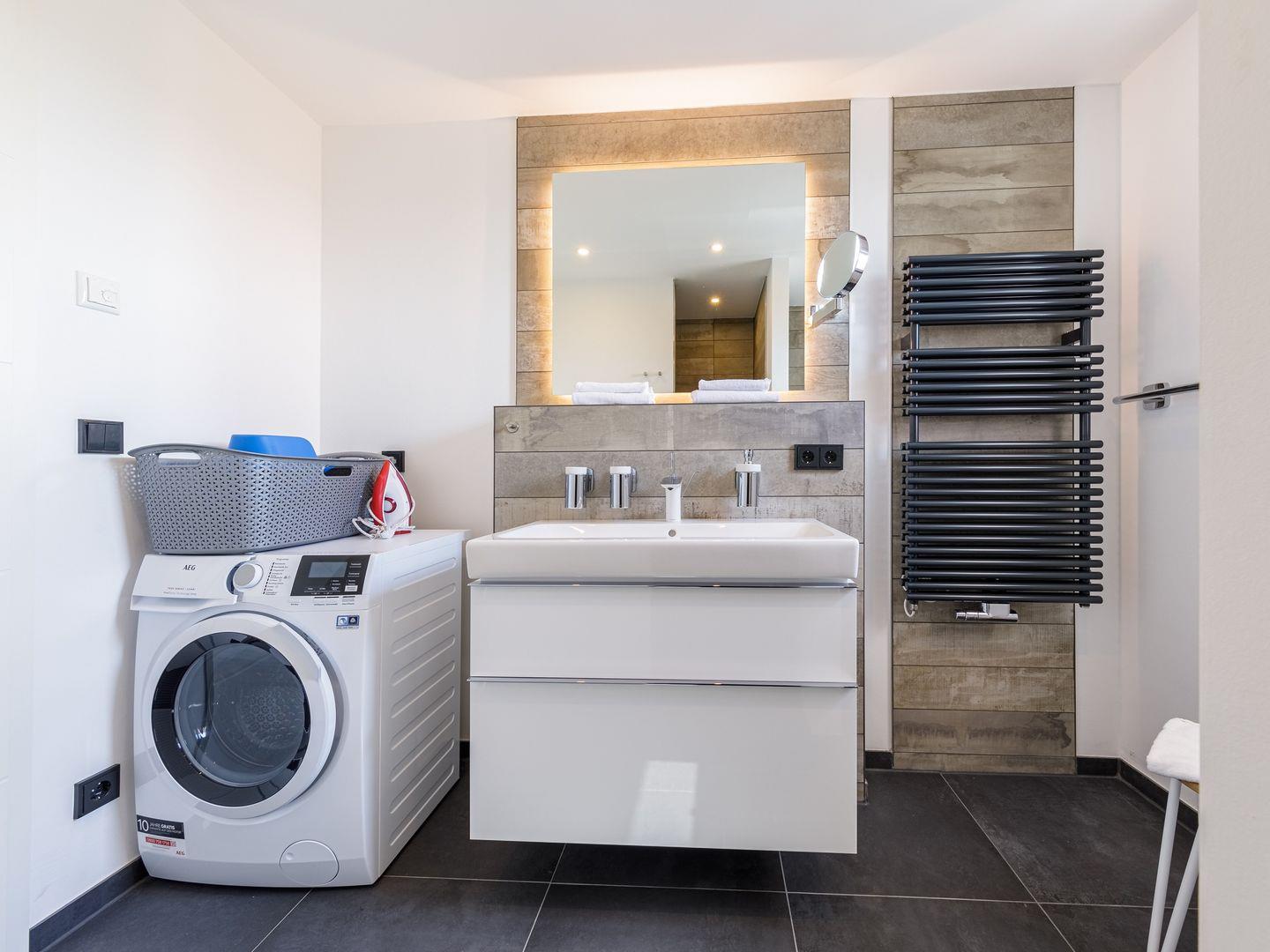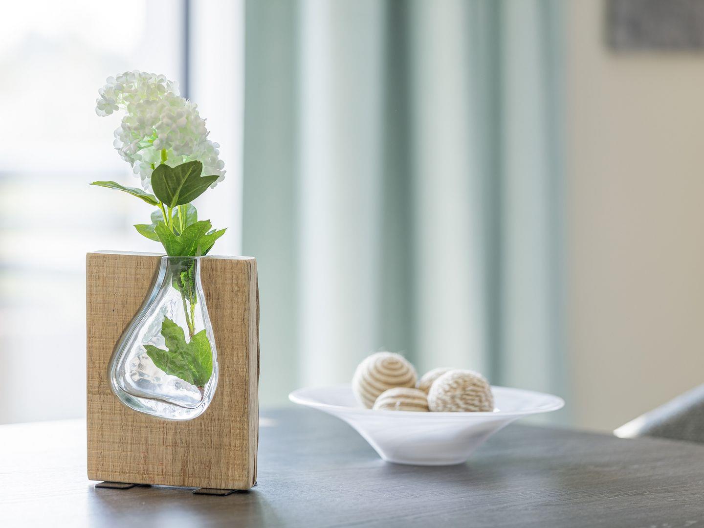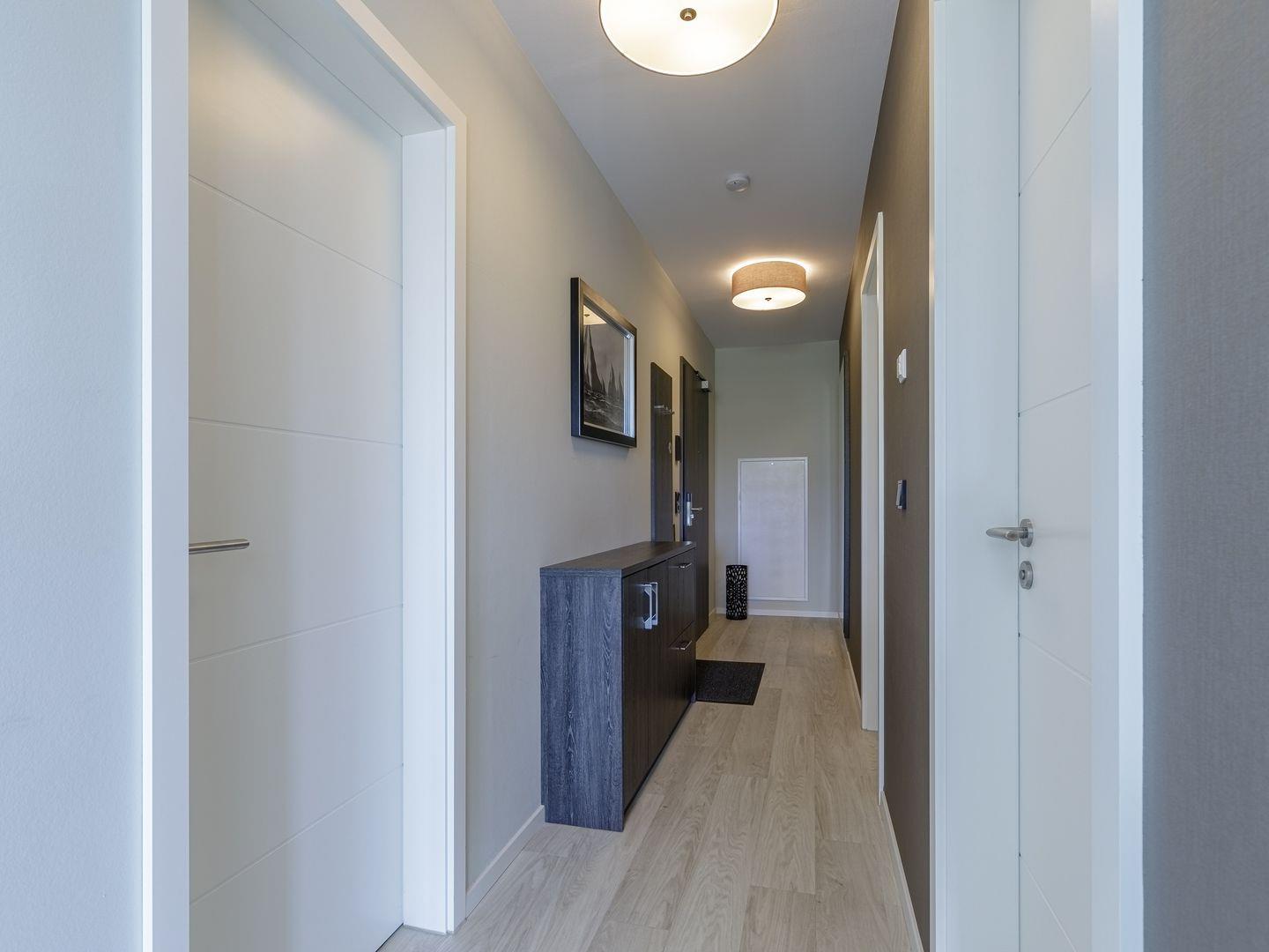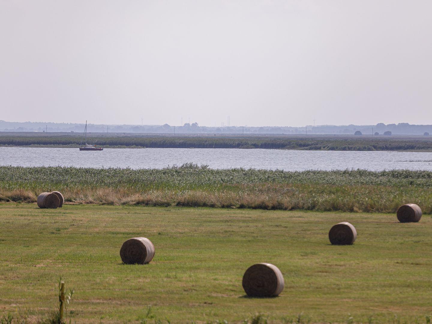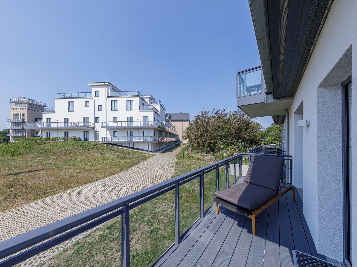 Die Ferienwohnung ist modern und stilvoll eingerichtet. Der im gesamten Wohn- und Schlafbereich der Ferienwohnung verlegte Design-Bodenbelag wirkt schlicht und zurücknehmend. Die installierte Fußbodenheizung, sowie ein Kamin sorgen für wohlige Wärme. Über den Eingangsbereich, in dem Ihnen verschiedene Aufhängemöglichkeiten und ein Sideboard ausreichend Stauraum bieten, gelangen Sie in den großzügigen Wohn-, Ess- und Küchenbereich. Ein großes Sofa mit zwei Lounge-Chair-Sesseln laden zu gemütlichen Abenden mit Freunden und der Familie ein und der Blick aus den bodentiefen Fenstern ist einfach atemberaubend. Für die mediale Unterhaltung sorgen im Wohnbereich eine Hi-Fi-Anlage und ein 50-Flachbild-TV. Kostenfreies W-LAN steht Ihnen selbstverständlich auch zur Verfügung. Ergänzt wird die gemütliche Wohnlandschaft durch den Essbereich, bestehend aus einem Esstisch und vier Stühlen. Geselligen Abenden oder gemeinsamen Essen steht damit nichts im Wege. Die offene, voll ausgestattete NOLTE-Einbauküche hat alles, was ein Kochherz begehrt. Elektro-Einbaugeräte, wie ein Induktionsherd, ein Geschirrspüler, ein Kühlschrank mit Gefrierkombination und eine Mikrowelle, sowie zahlreiche Kochutensilien runden das Angebot ab. Genießen Sie Ihr Essen doch gerne auf dem großen Südwestbalkon. Von dort aus können Sie entspannt auf die gefärbten Segel der Zeesboote auf dem Bodden schauen. Den möblierten Balkon erreichen Sie bequem vom Wohn- und Essbereich über die vollverglasten Türen. Zur Ausstattung gehören ein Tisch, zwei Stühle und zwei Sonnenliegen. Das Schlafzimmer ist mit liebevollen Details eingerichtet. Träumen Sie in dem Boxspringbett (180 x 200 cm) oder genießen Sie die Aussicht aus den bodentiefen Fenstern. Ein Kleiderschrank, mit integriertem Safe für Ihre Wertsachen, bietet ausreichend Stauraum. Außerdem befinden sich in dem Schlafzimmer zwei Nachttische mit je einer Nachttischlampe und ein 32-Zoll Flachbild-TV. Gerne können 2 weitere Gäste auf der Schlafcouch übernachten. In dem Tageslicht-Badezimmer, welches Sie über den Eingangsbereich erreichen können, stehen Ihnen eine ebenerdige Dusche, ein Waschbecken mit Unterschrank, ein WC, sowie ein Kosmetikspiegel und ein Föhn zur Verfügung. Große Fliesen und warme Töne runden das Gesamtbild ab und spiegeln den Strandhaus-Stil wider.