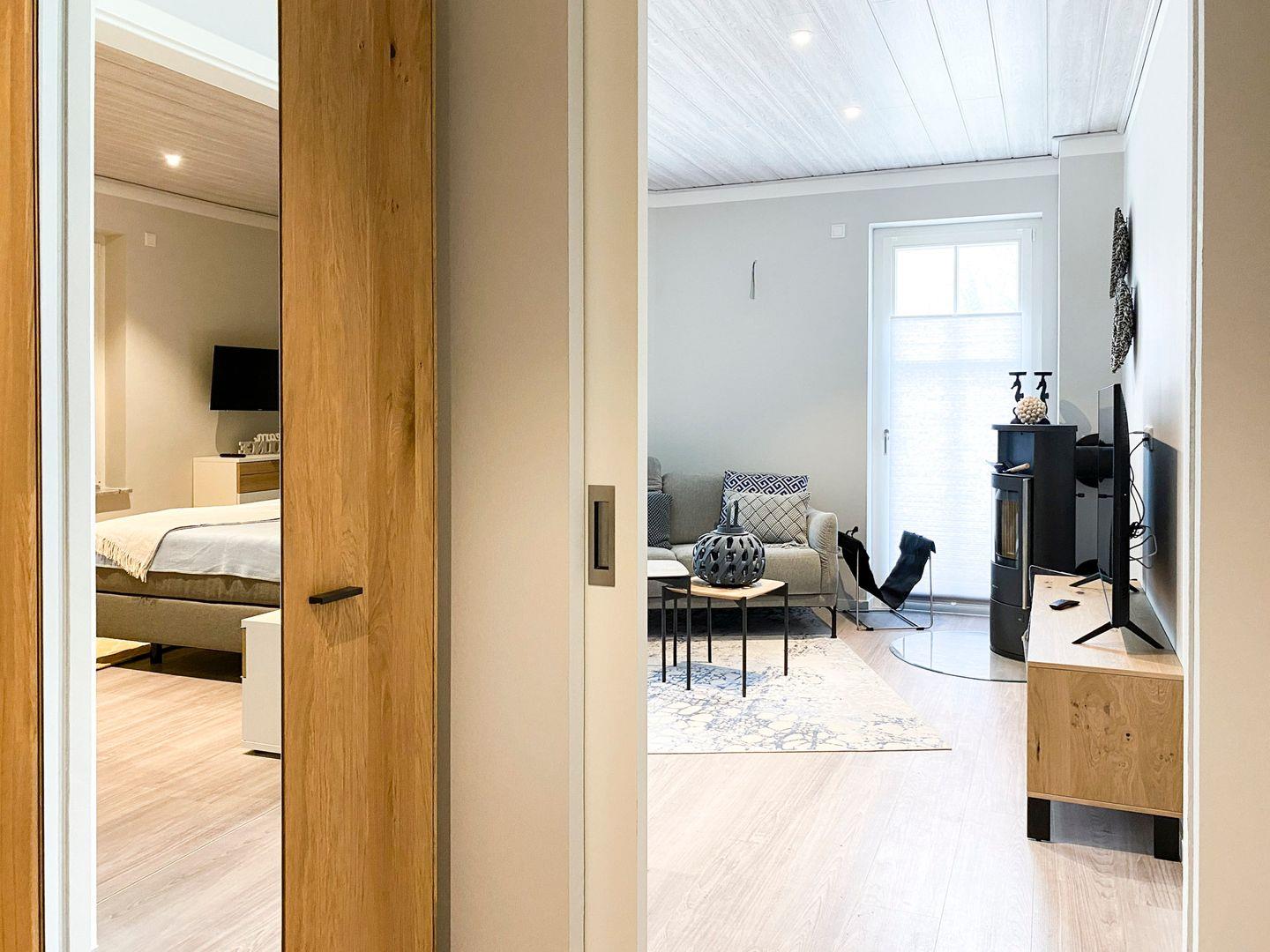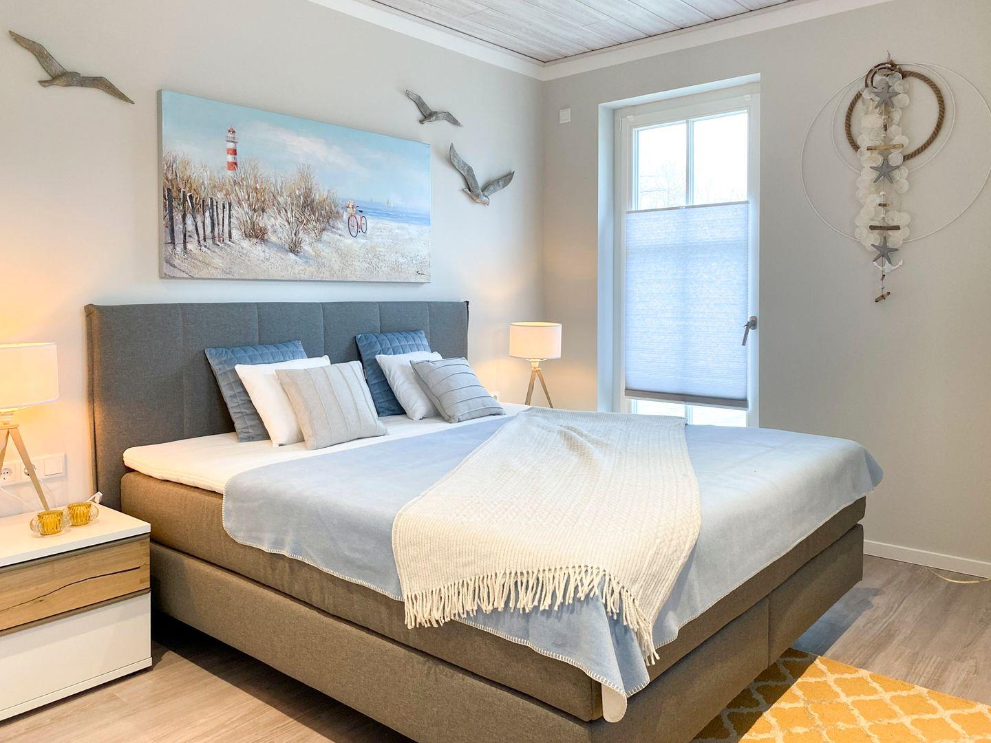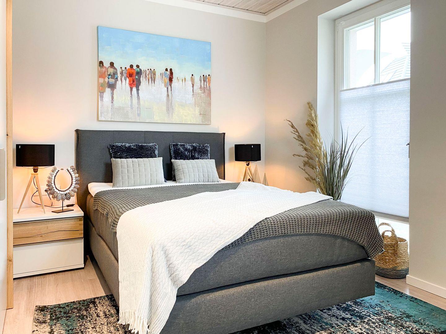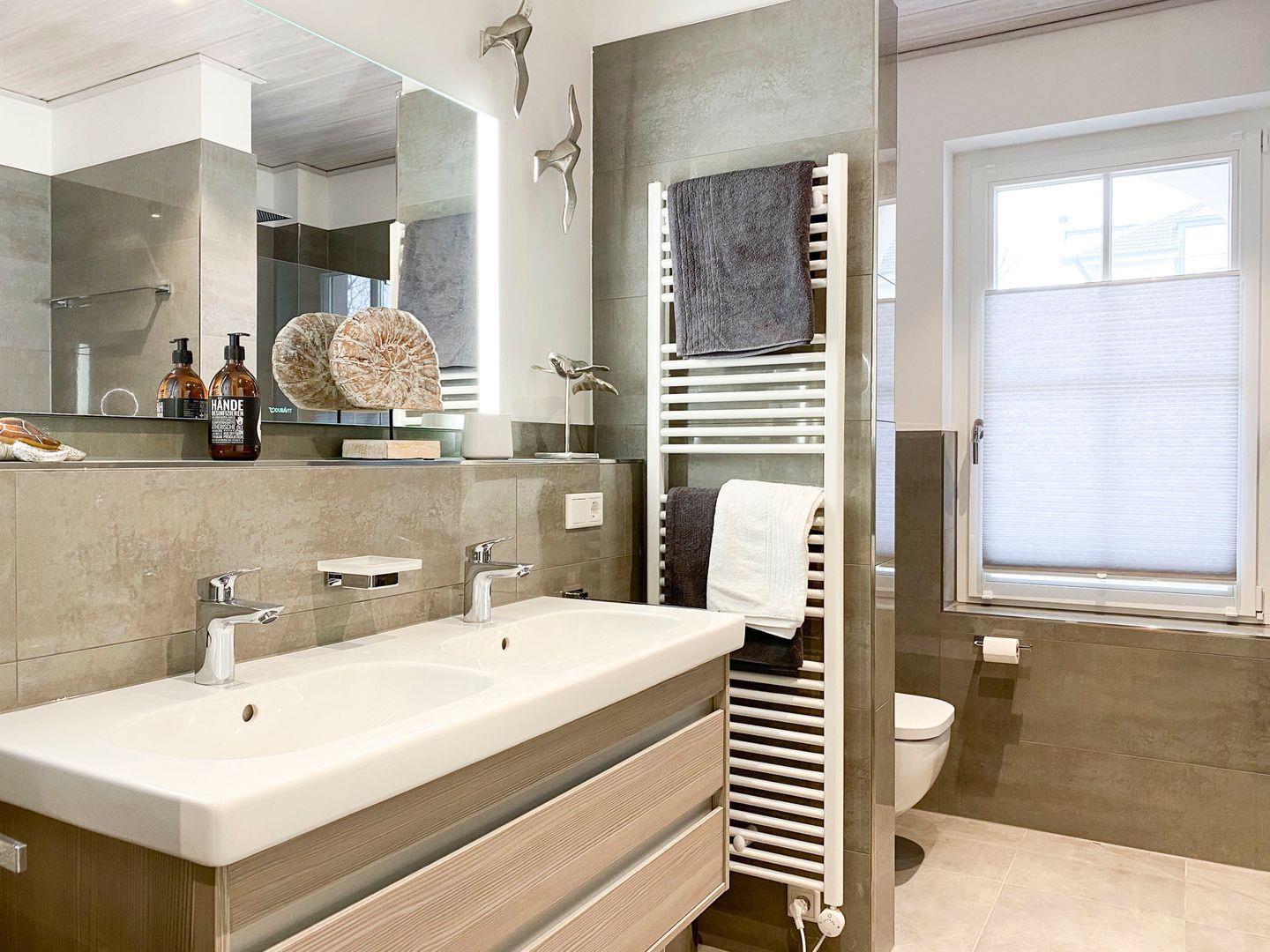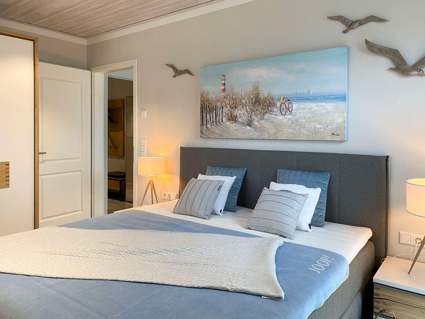 Die Ferienwohnung verfügt über zwei komfortable Schlafzimmer mit hochfertigen Boxspringbetten in einer Größe von 180 x 200 und 140 x 200, in denen Sie entspannt schlafen können. Hier genießen Sie eine allergikerfreundliche Atmosphäre, die durch hochwertige Materialien und gute Raumluft geprägt ist. Das Badezimmer ist modern gestaltet und ausgestattet mit einer bodengleichen Dusche, einer Badewanne und vielen Annehmlichkeiten wie einem Haartrockner und Kosmetikspiegel für Ihr Wohlbefinden.